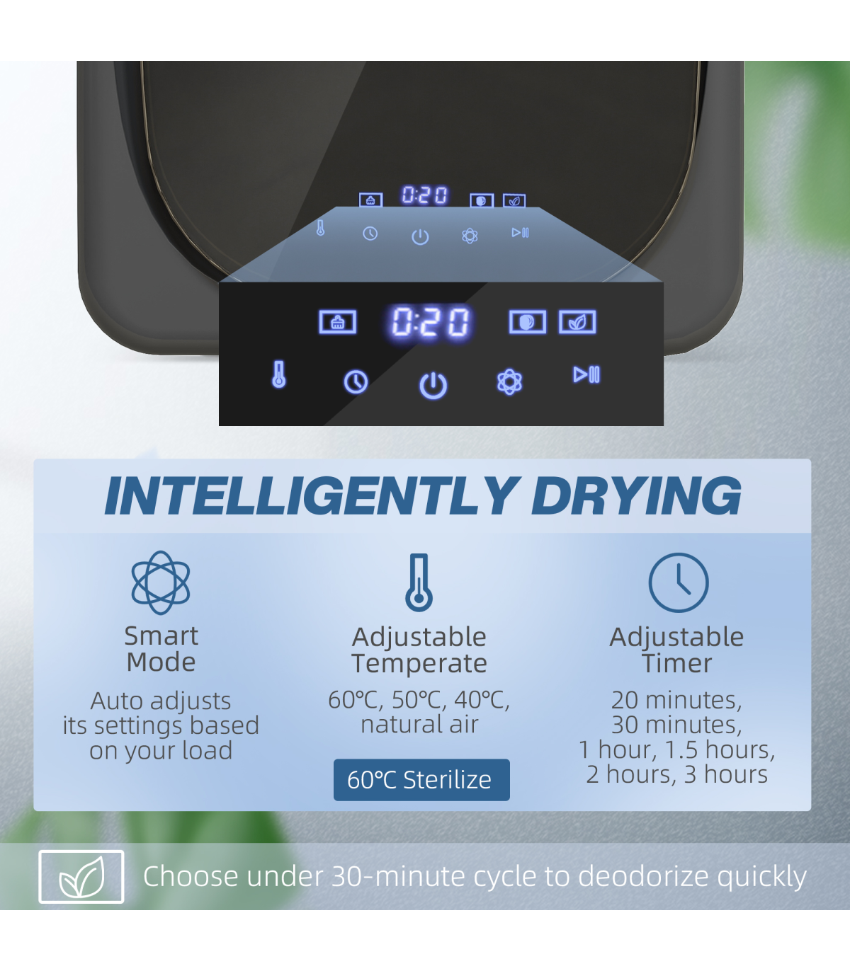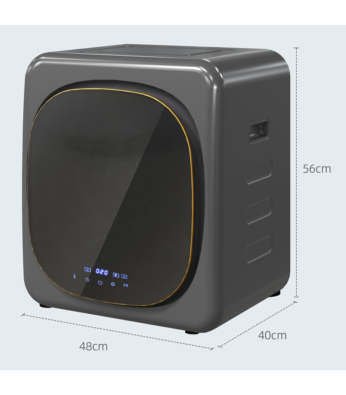 - Adjustable timer from 20 minutes to 3 hours. Temperature options include 60℃(sterilizes clothing), 50℃, 40℃, natural air