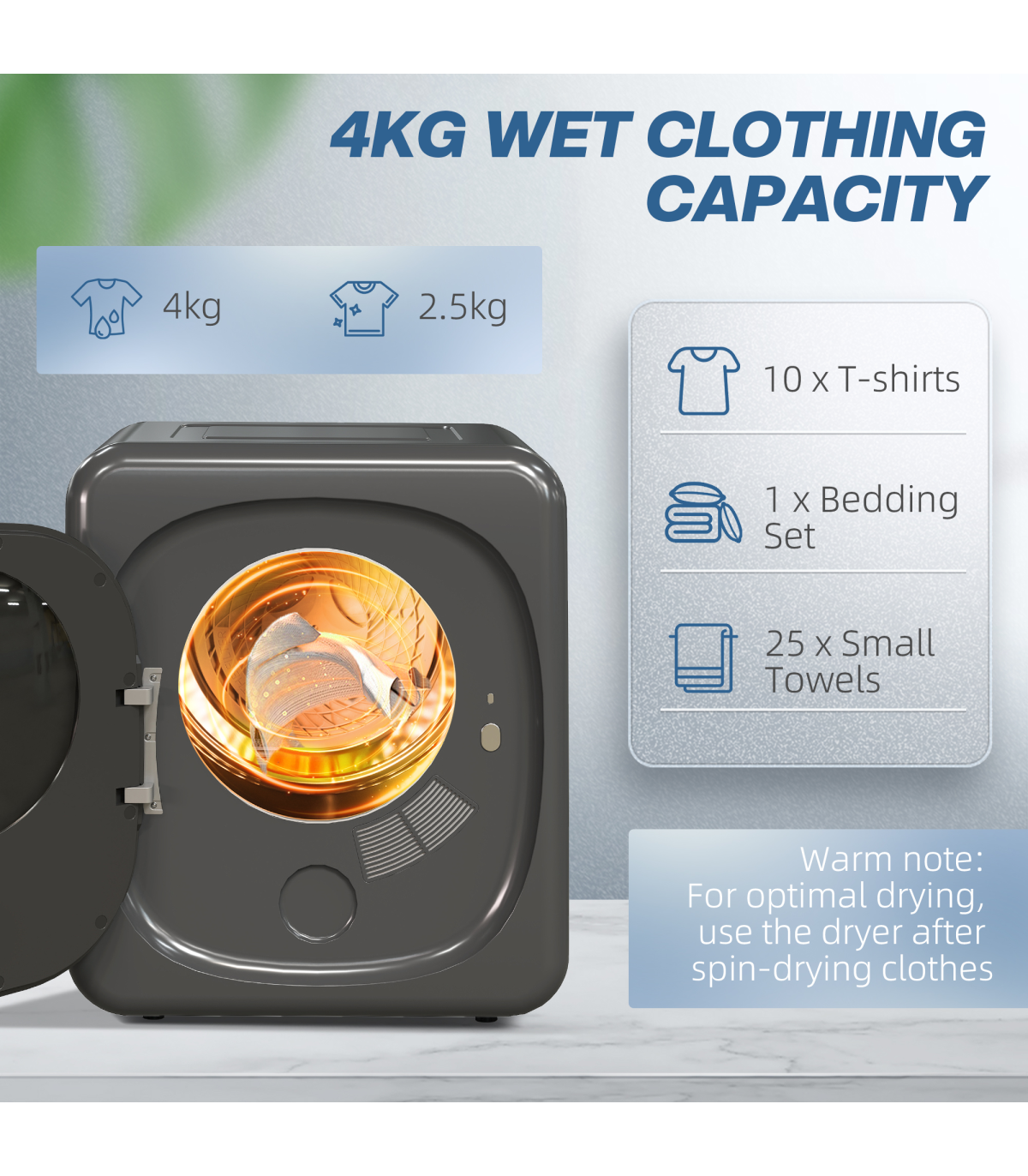 - Large capacity up to 4kg wet clothes, fits 10 t-shirts or 1 bedding set