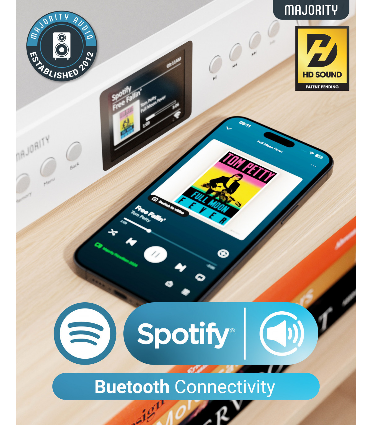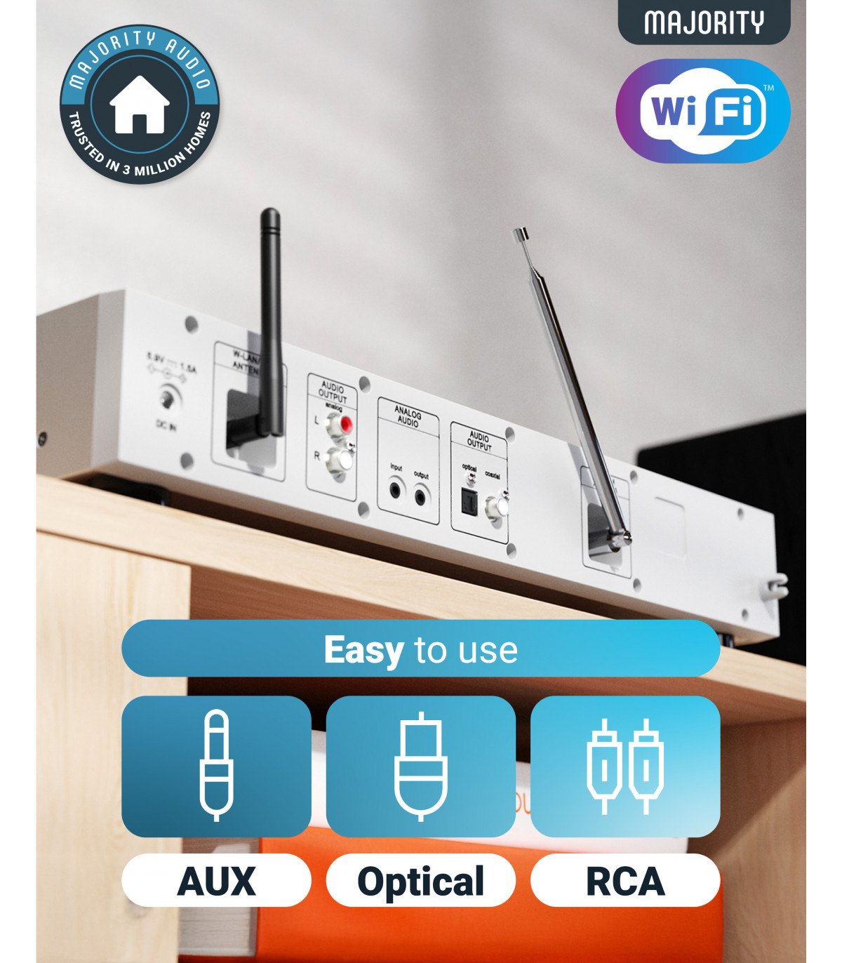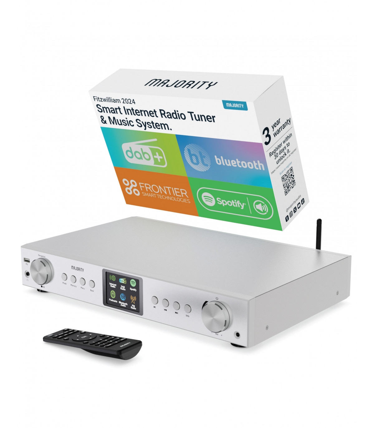 The Majority Fitzwilliam Hi-Fi system delivers a rich audio experience combined with extensive connectivity options and modern features, all wrapped in a sleek, high-quality design. Whether you prefer internet radio, digital DAB/DAB+, or FM, the Fitzwilliam connects you to thousands of stations worldwide. Its WiFi capability opens up access to a vast array of music, news, and podcasts, while Spotify Connect (Free or Premium) allows for seamless streaming of your favourite playlists. Additionally, you can easily play your own media via Bluetooth, USB, AUX-in, or UPnP, making it incredibly versatile.