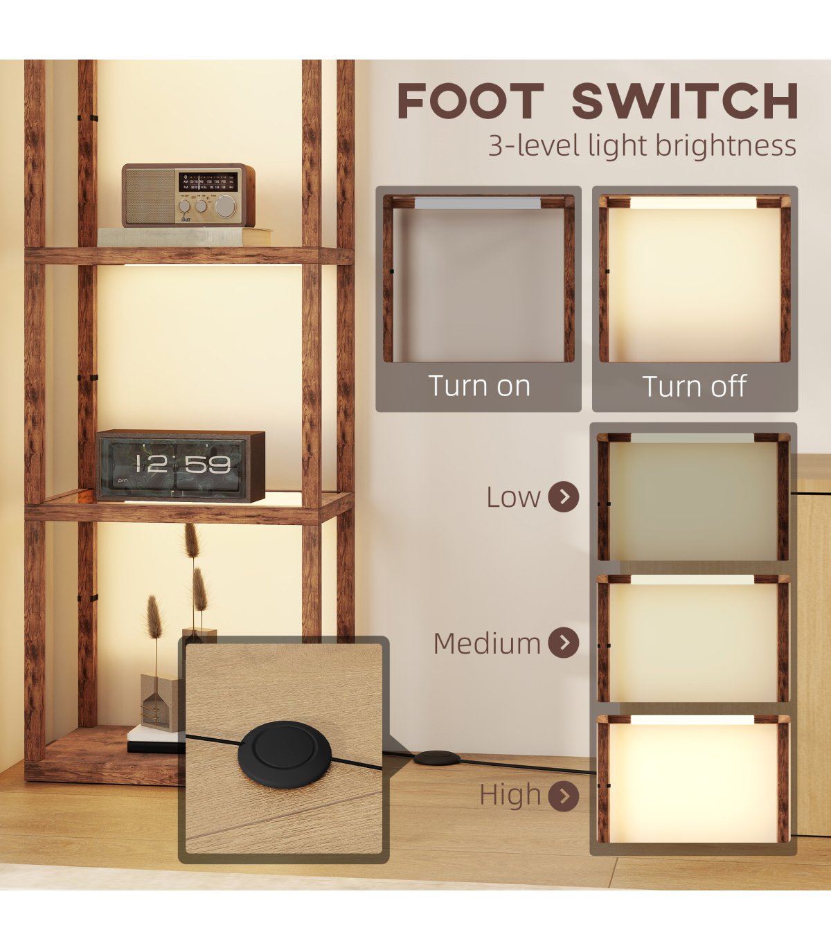 - Foot switch to adjust brightness to three levels without bending down