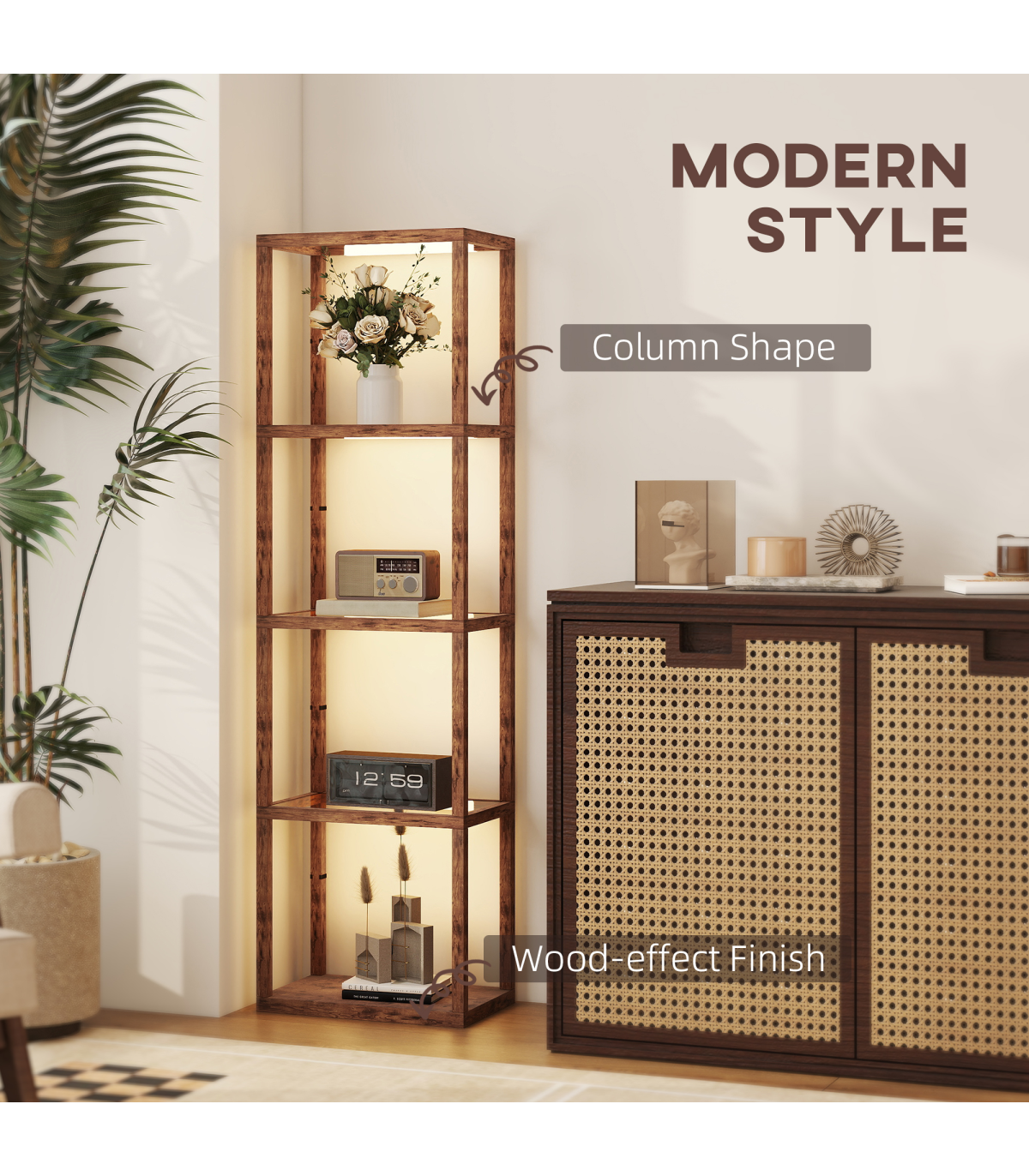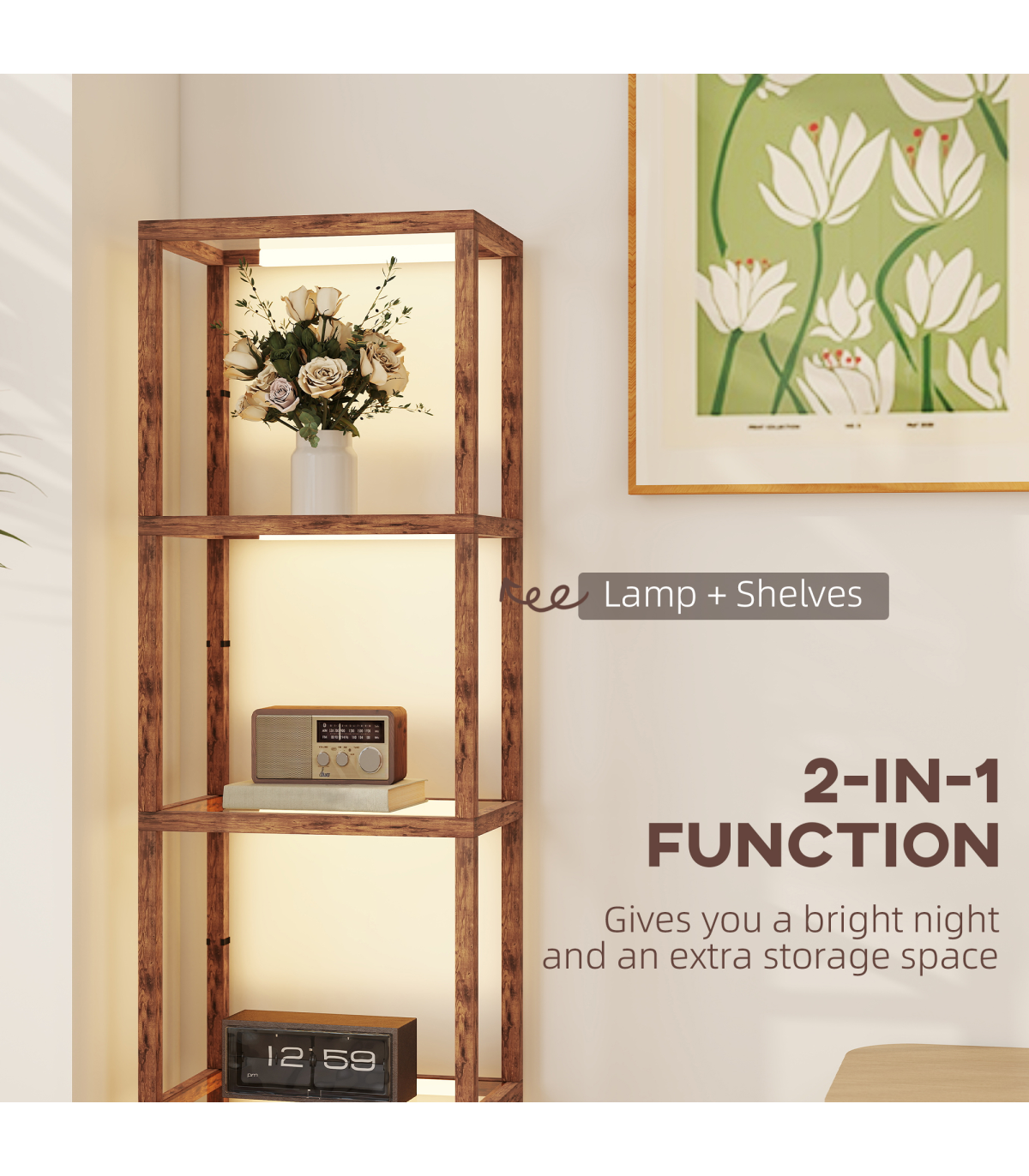 - LED lamp doubles as a four-tier display shelf for versatility