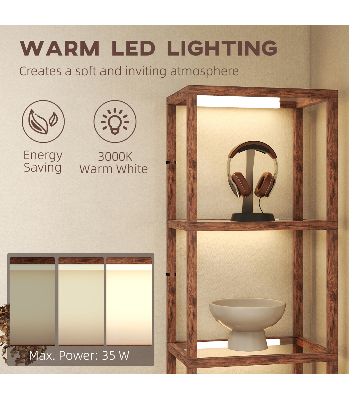 - Four 3000 K warm white LED lights offer a cosy ambience