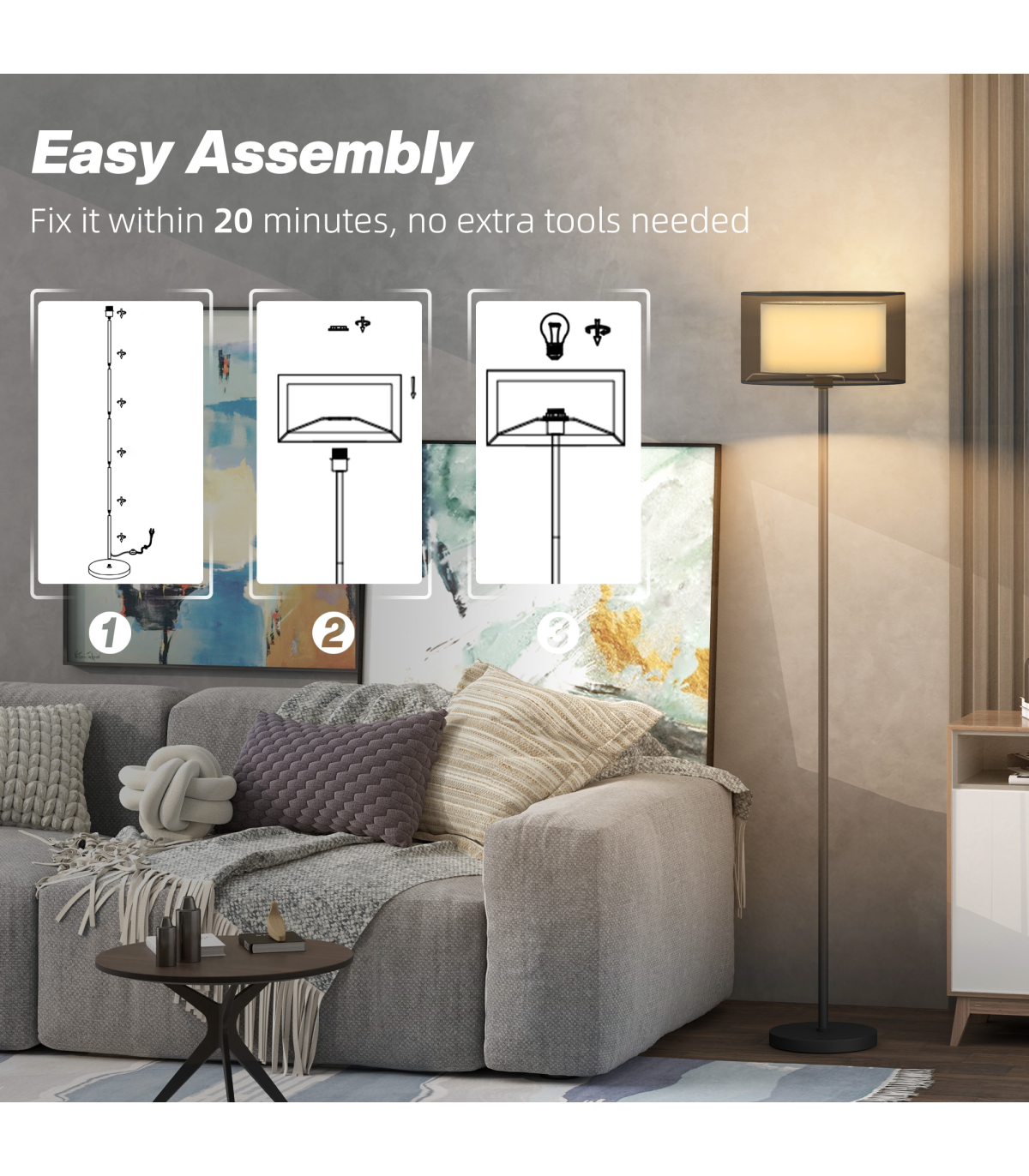- Easily assembled by screwing columns and attaching lampshade