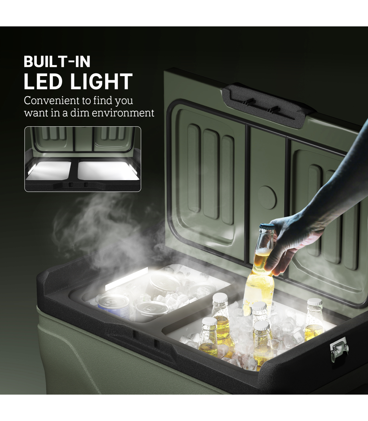 - Interior LED lighting for visibility in darkness, bottle opener for convenient beverage access