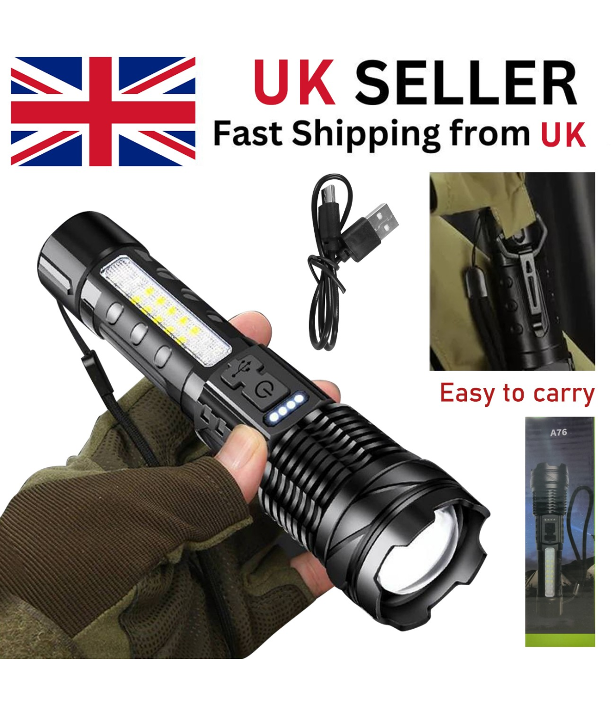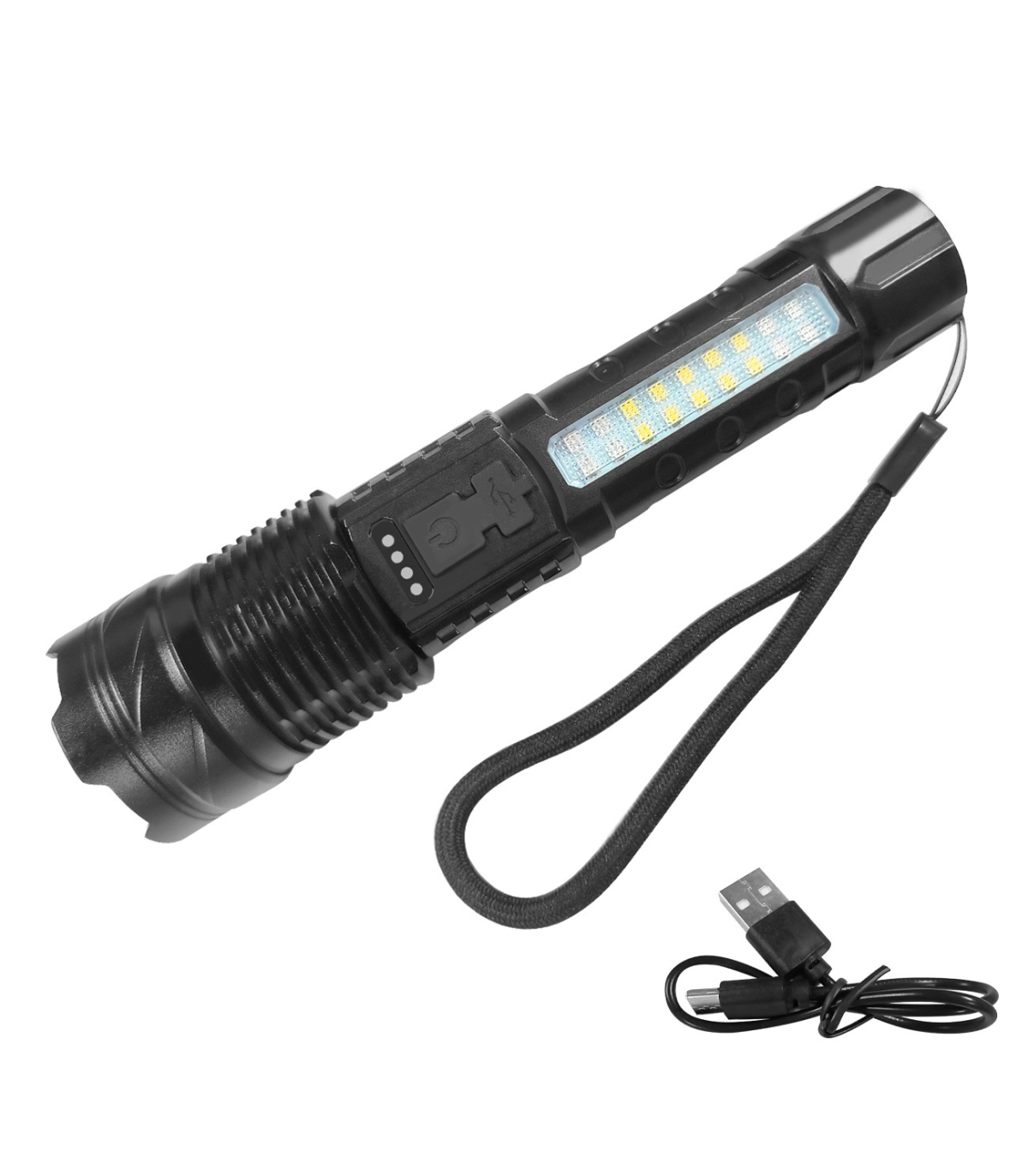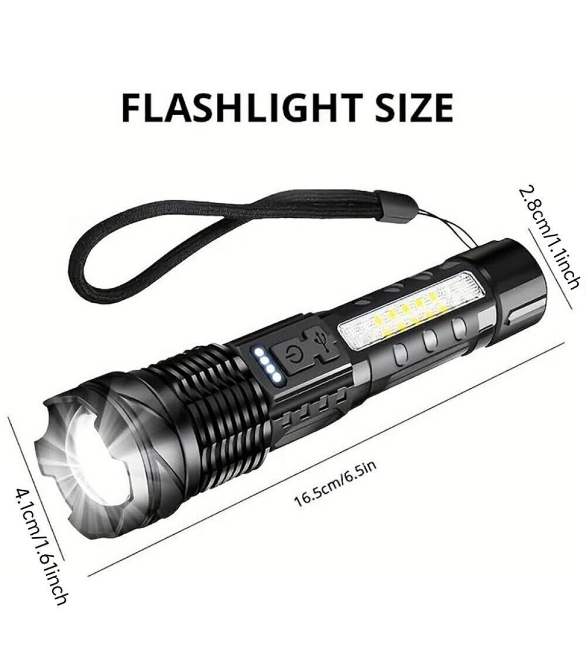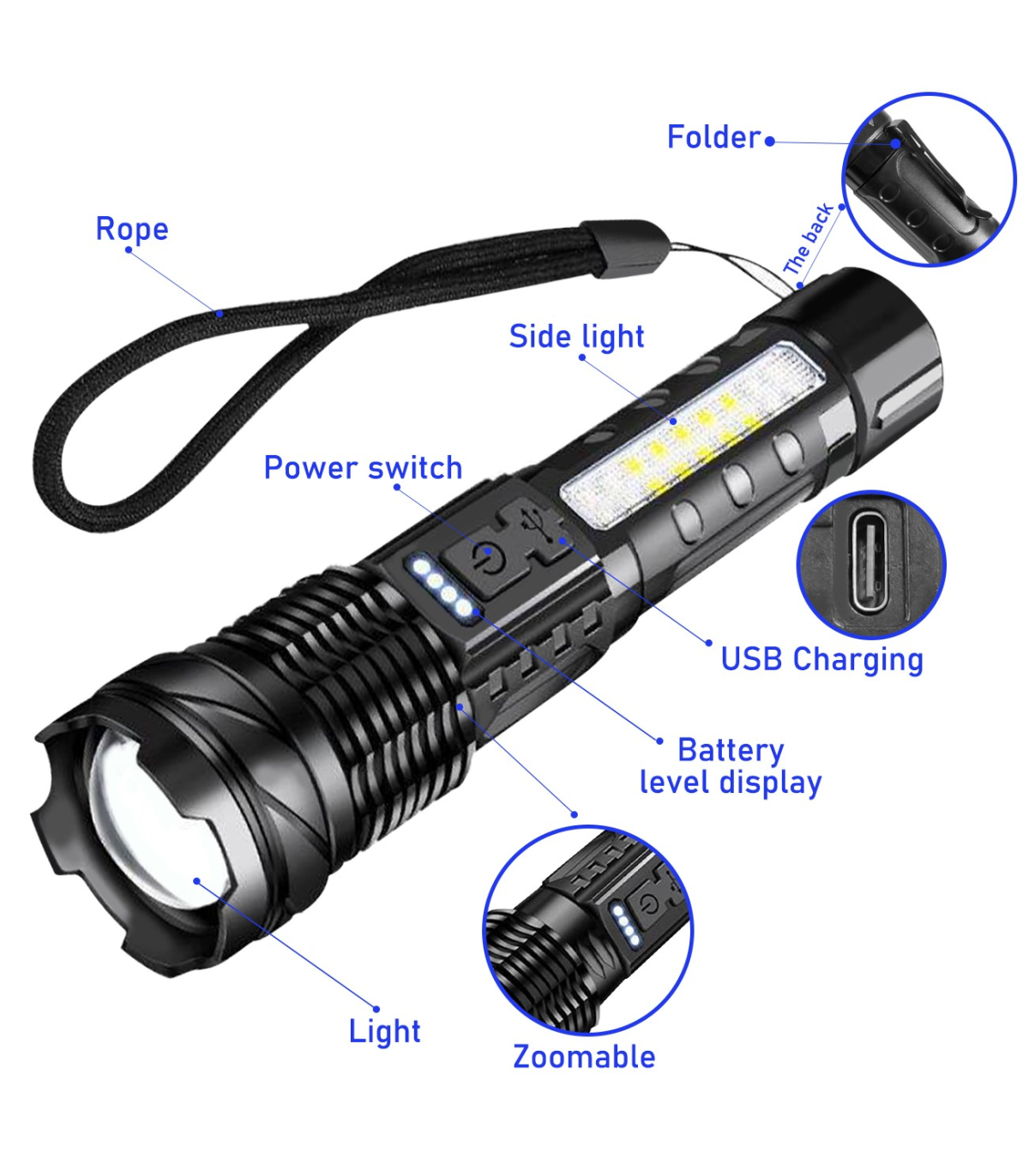 【USB Input and Power display 】 Rechargeable flashlight has an Type-C input port and power display. Support USB charging. You can charge with a laptop, car charger, charging treasure, etc.