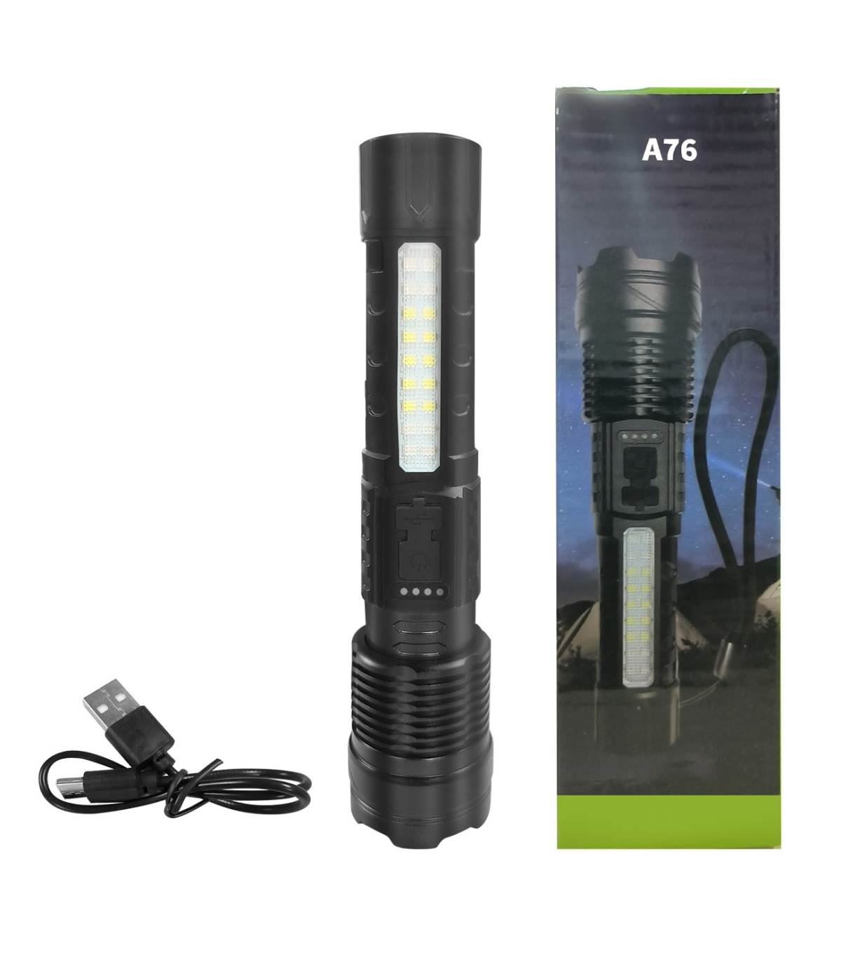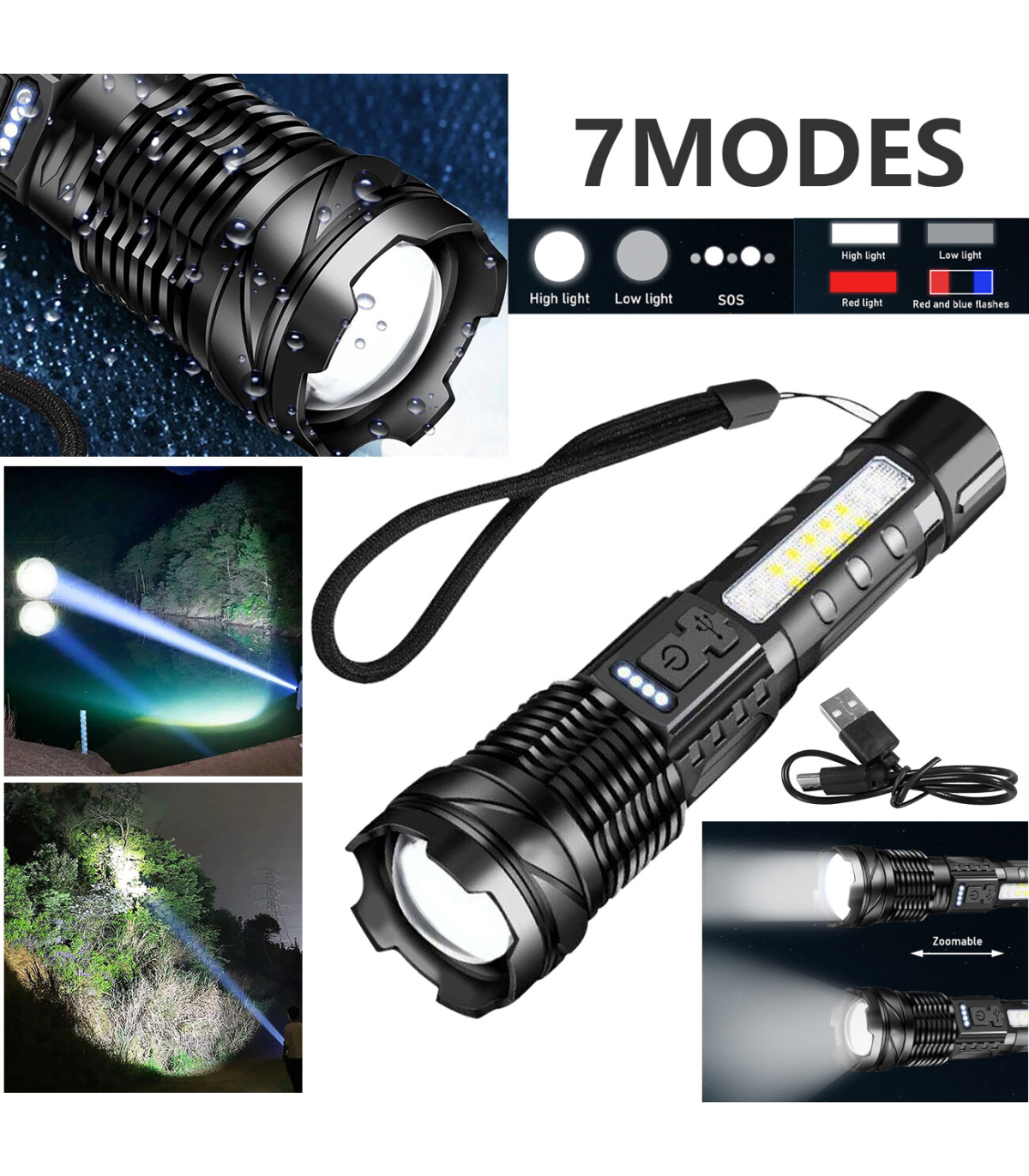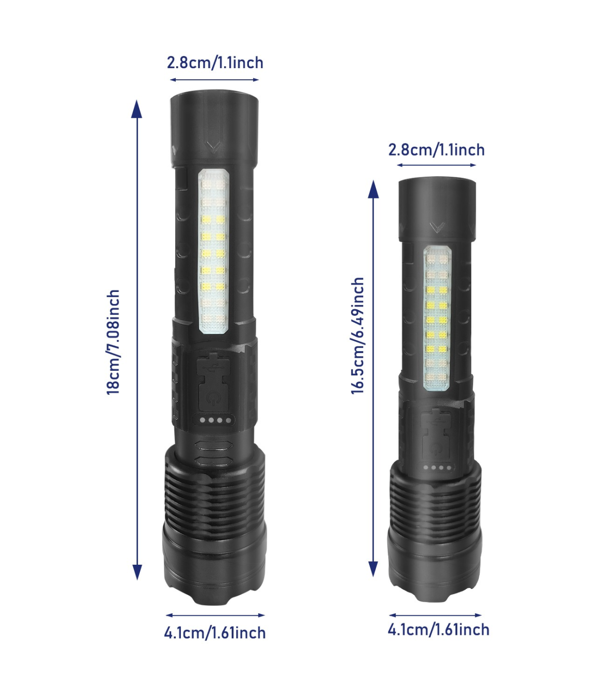 【7 Modes 】 3 main light modes, click the switch to give (super bright / medium bright / flashing). 4 side lights modes, long press the switch to give (super bright / medium bright / red / red and blue flashing). The flashlight can be turned off directly after 10 seconds of operation in any mode, without going through all modes.