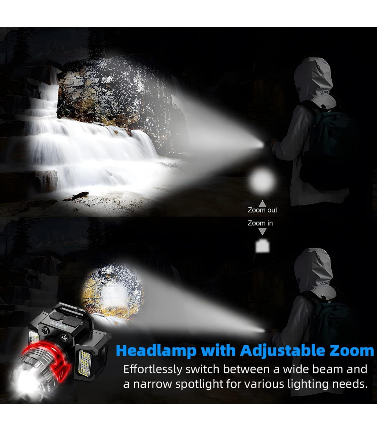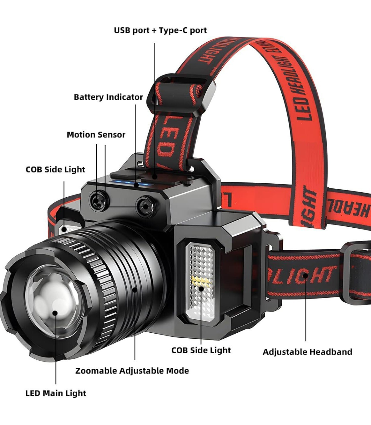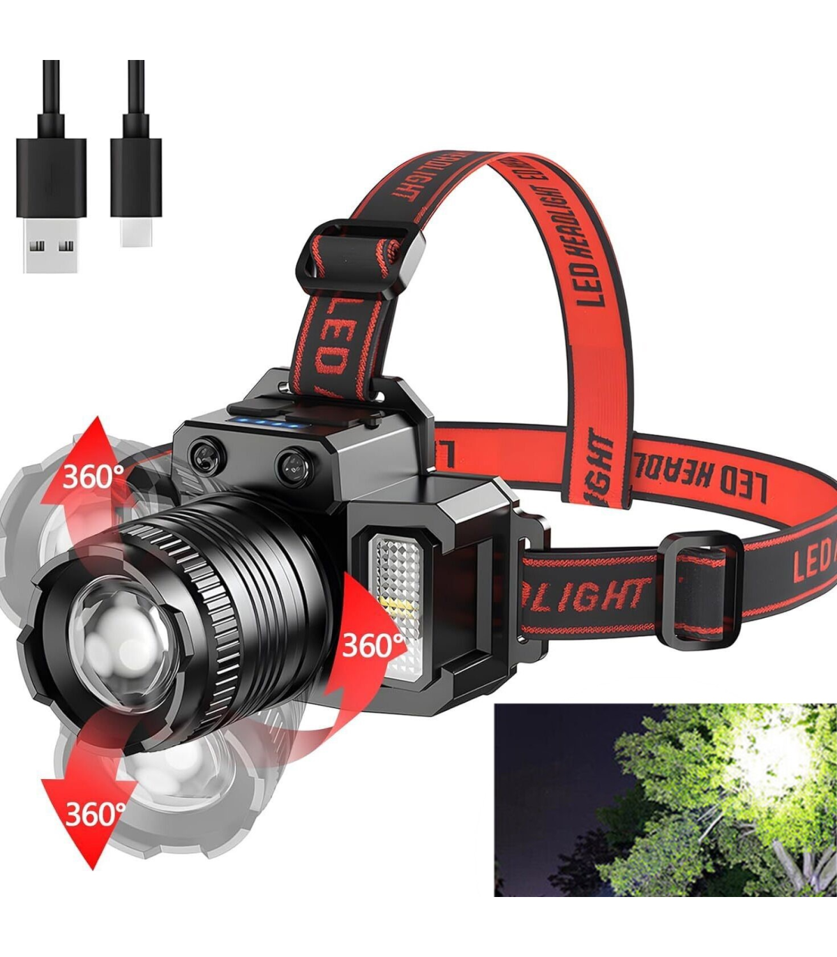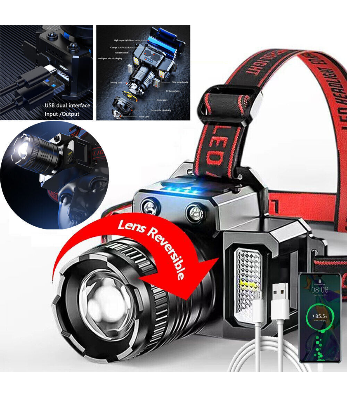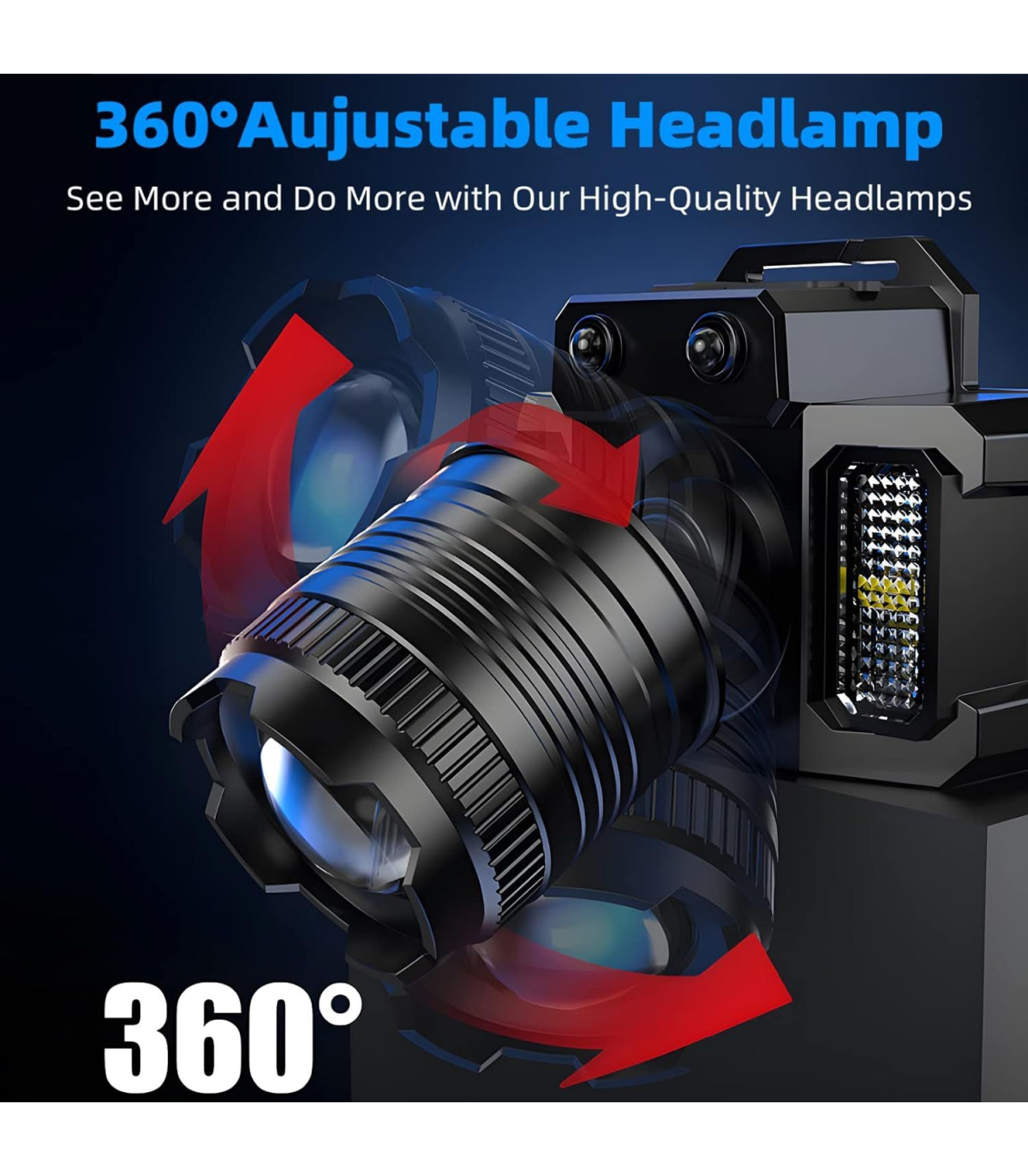 6. Lighting mode: 5 gears (main light: super bright / medium bright / flashing. Side lights modes: super bright / red and blue flashing), you can adjust the 90°angle and light source according to your own needs, easy to operate and easy to use.