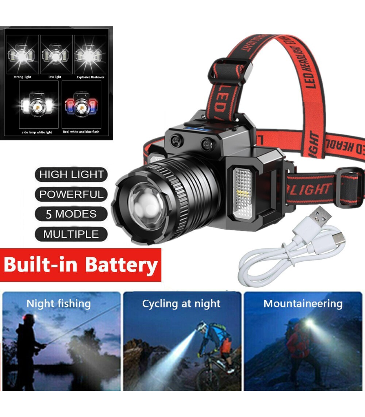 Lighting mode: 5 gears (Main light: super bright / medium bright / flashing. Side lights modes: super bright / red and blue flashing)