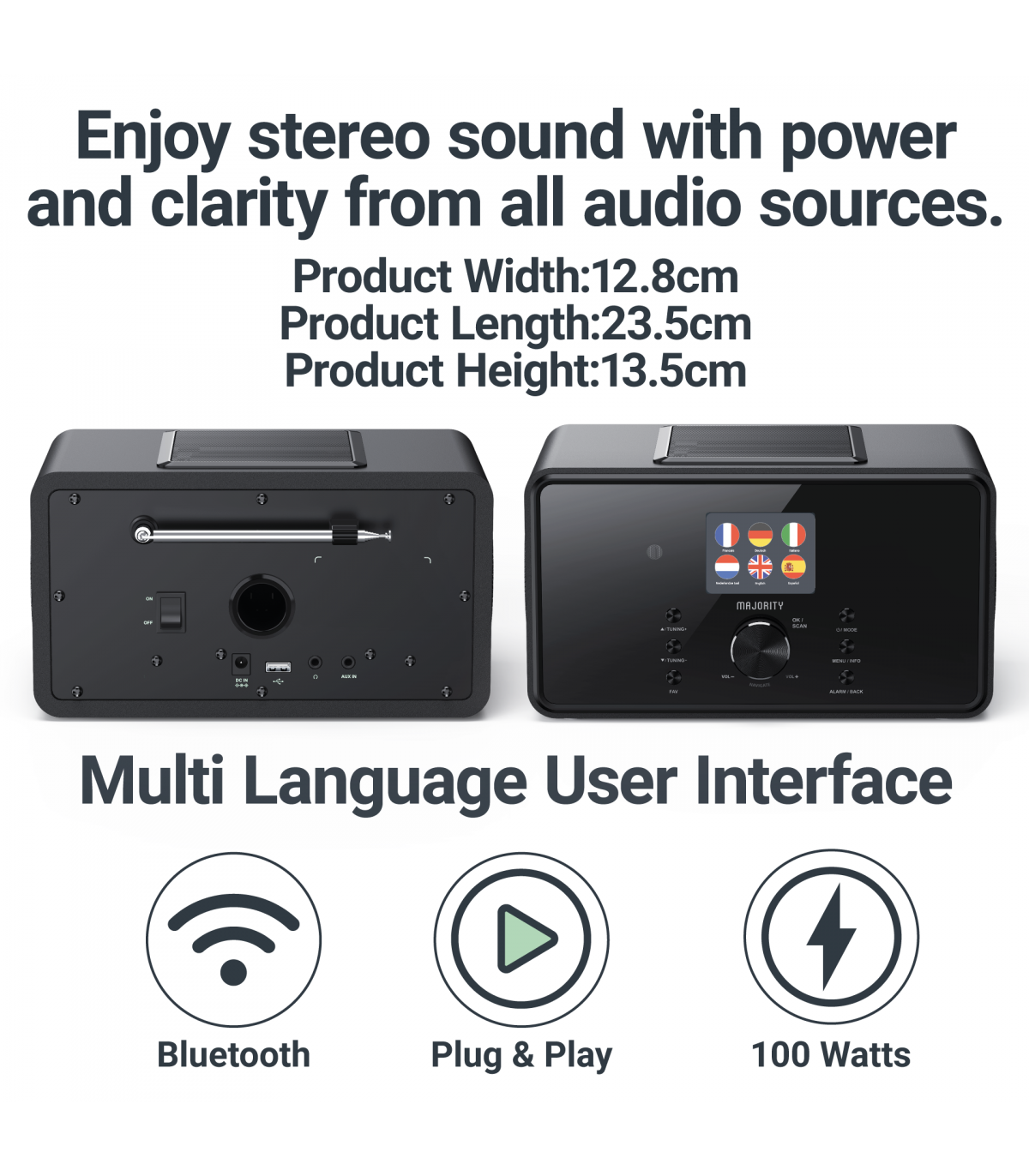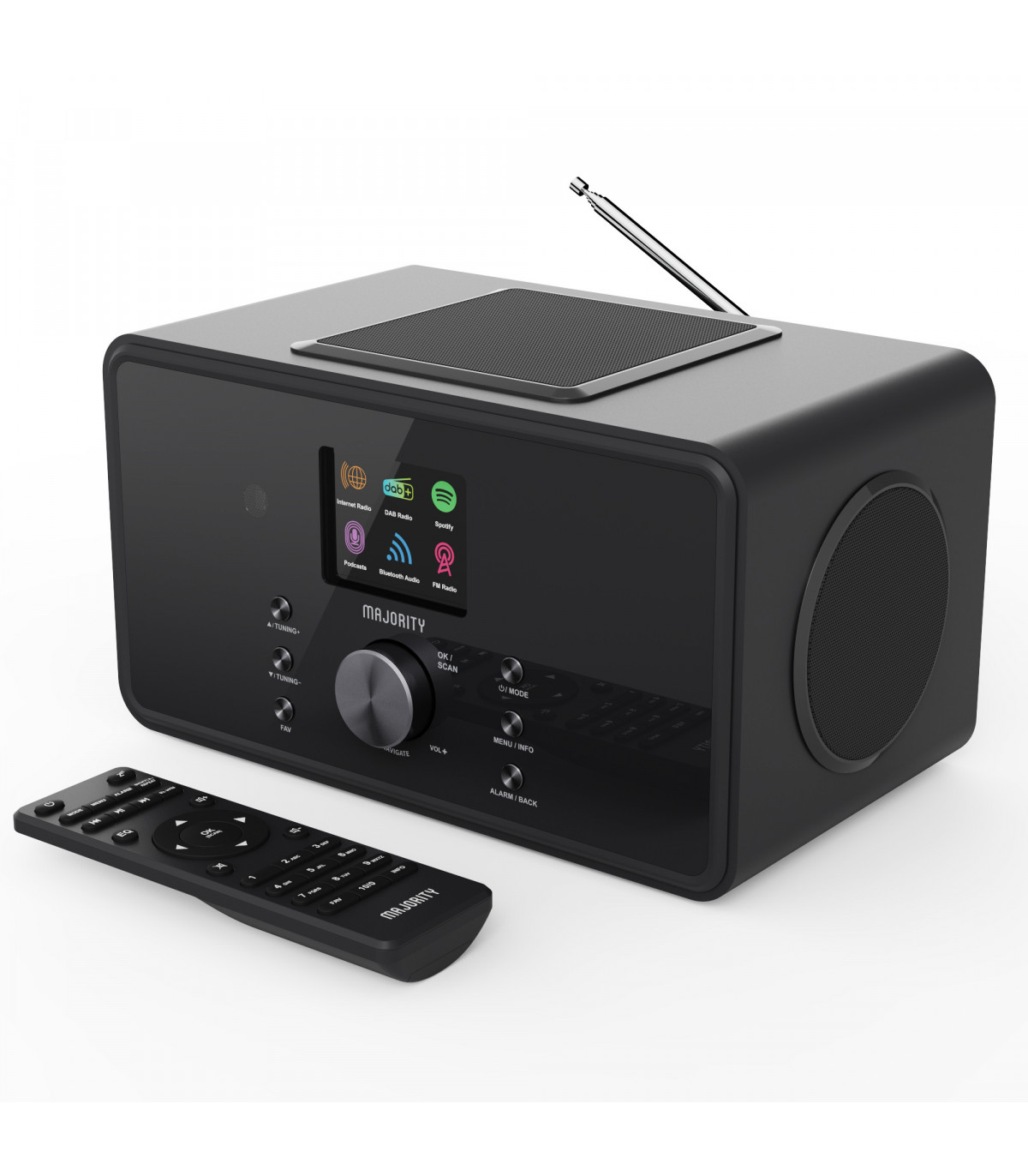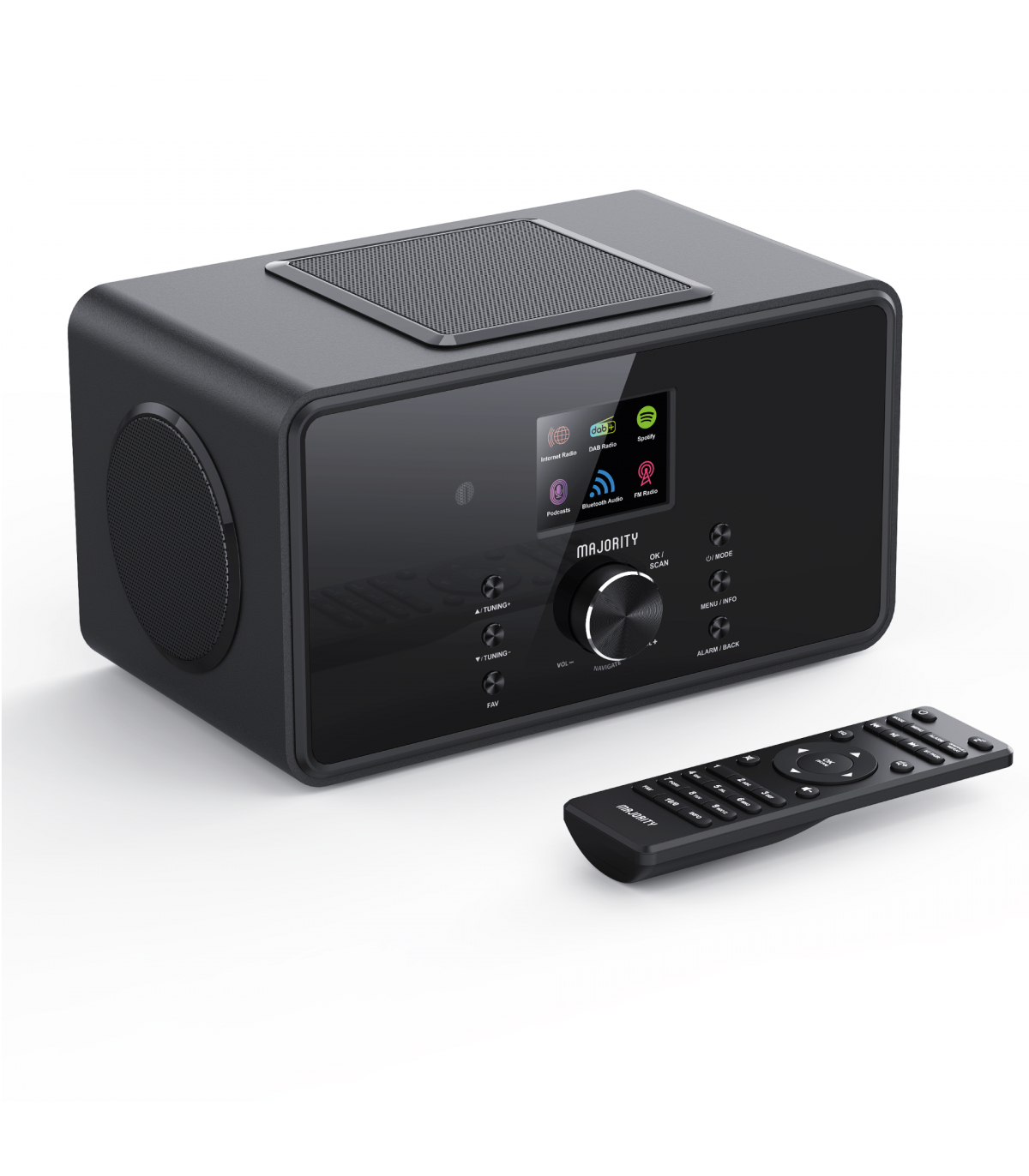 You’ll be spoilt for choice with the Majority Bard, a feature-packed music system designed to deliver outstanding sound and endless listening options. With built-in internet radio, you can explore thousands of stations and podcasts from around the world, while DAB+ and FM radio let you enjoy a huge variety of local content. Stream your favourite playlists wirelessly using Bluetooth or Spotify Connect, and enjoy them through powerful dual 4" speakers and a 5" subwoofer that delivers deep bass, crisp treble, and a booming 100 W output.