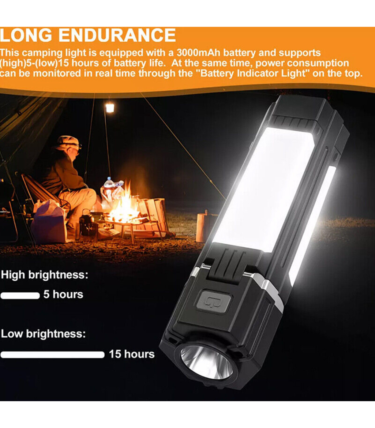 Rechargeable and Long-lasting:The camping light is built-in 3000mAh rechargeable Lithium battery, Can be charged anytime, anywhere through USB devices such as power banks and PC,which can last up to 15 hours at the lowest brightness and 5 hours at the highest brightness.