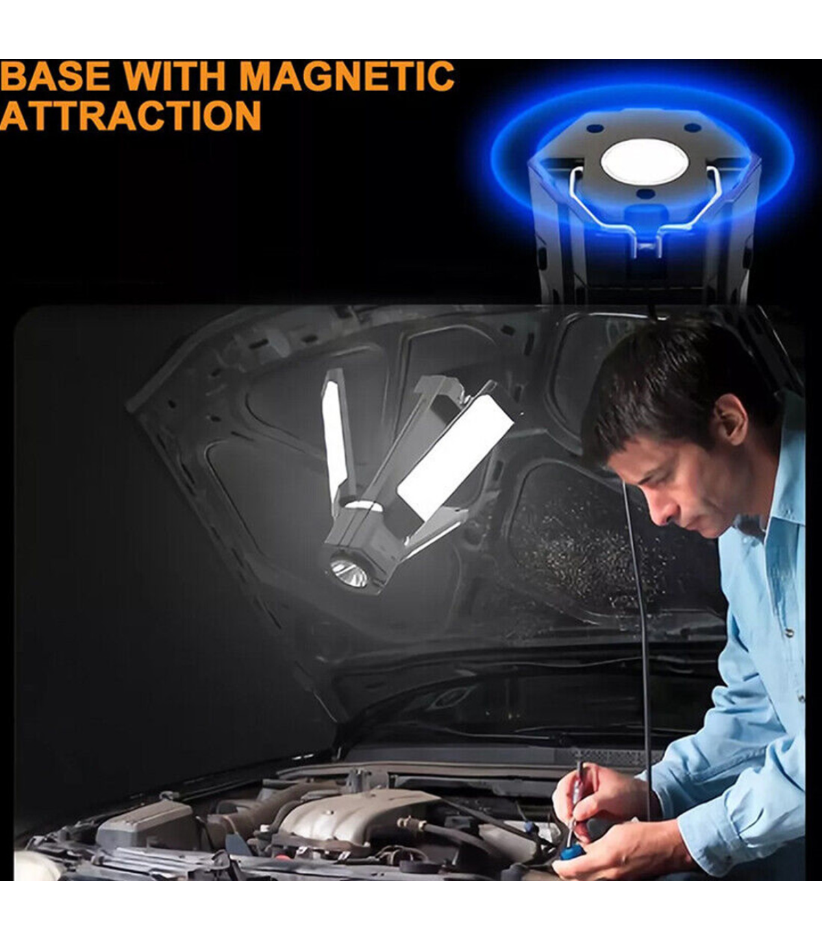 It has a magnetic suction and hook on the top and can serve as a maintenance light for illumination.