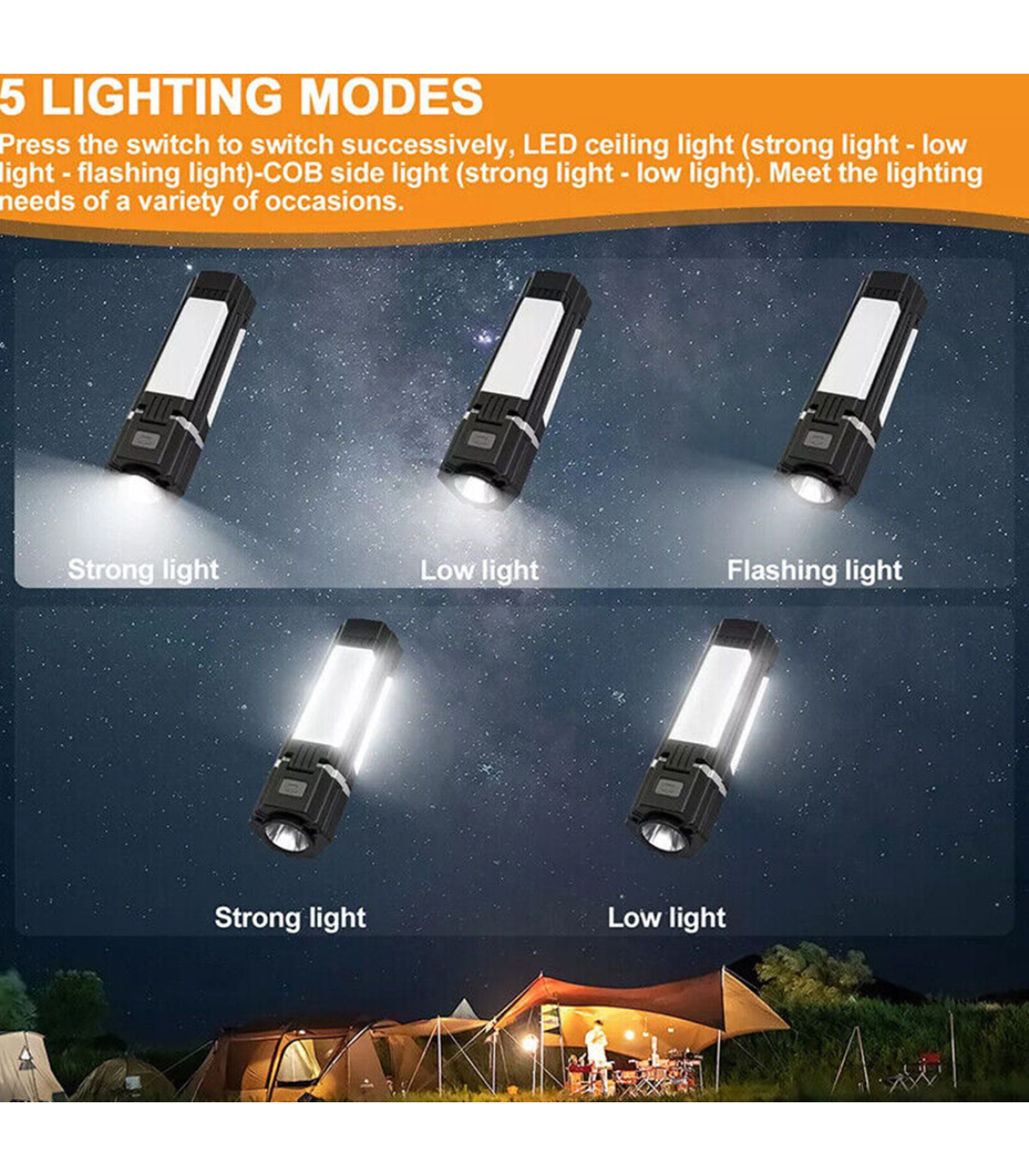 Versatile Camping Light:This foldable camping light has multiple lighting methods and can be used as a flashlight, desk lamp, or camping light.