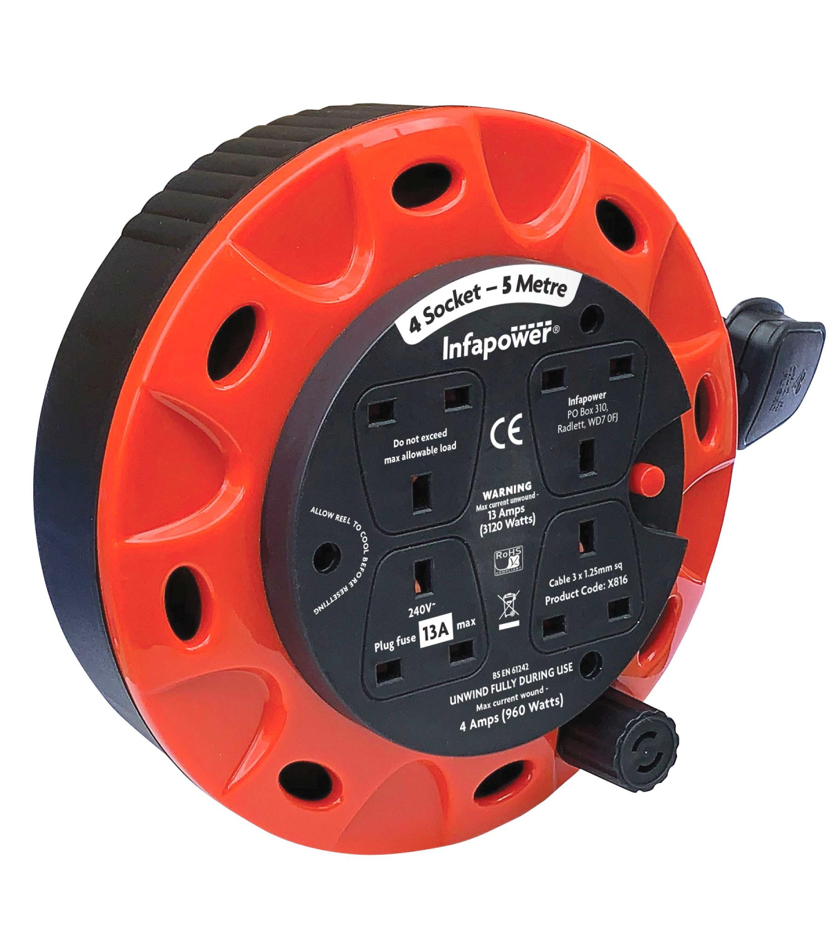1. Reinforced casing for better protection and impact resistance 2. Made from flame retardant self-extinguishing material 3. Childproof shutters for protection 4. Rated at 13 AMP for a maximum load of 3120 Watts 5. Tough plug for rough usage, 13 AMP - BS 1363/A 6. Compliant with latest European standards BS EN 61242 7. Fitted with a thermal cut out to prevent overheating 8. Markings printed with indelible ink so they can’t be rubbed off during use. 9. Ventilated section ensures the reel is less prone to overheating