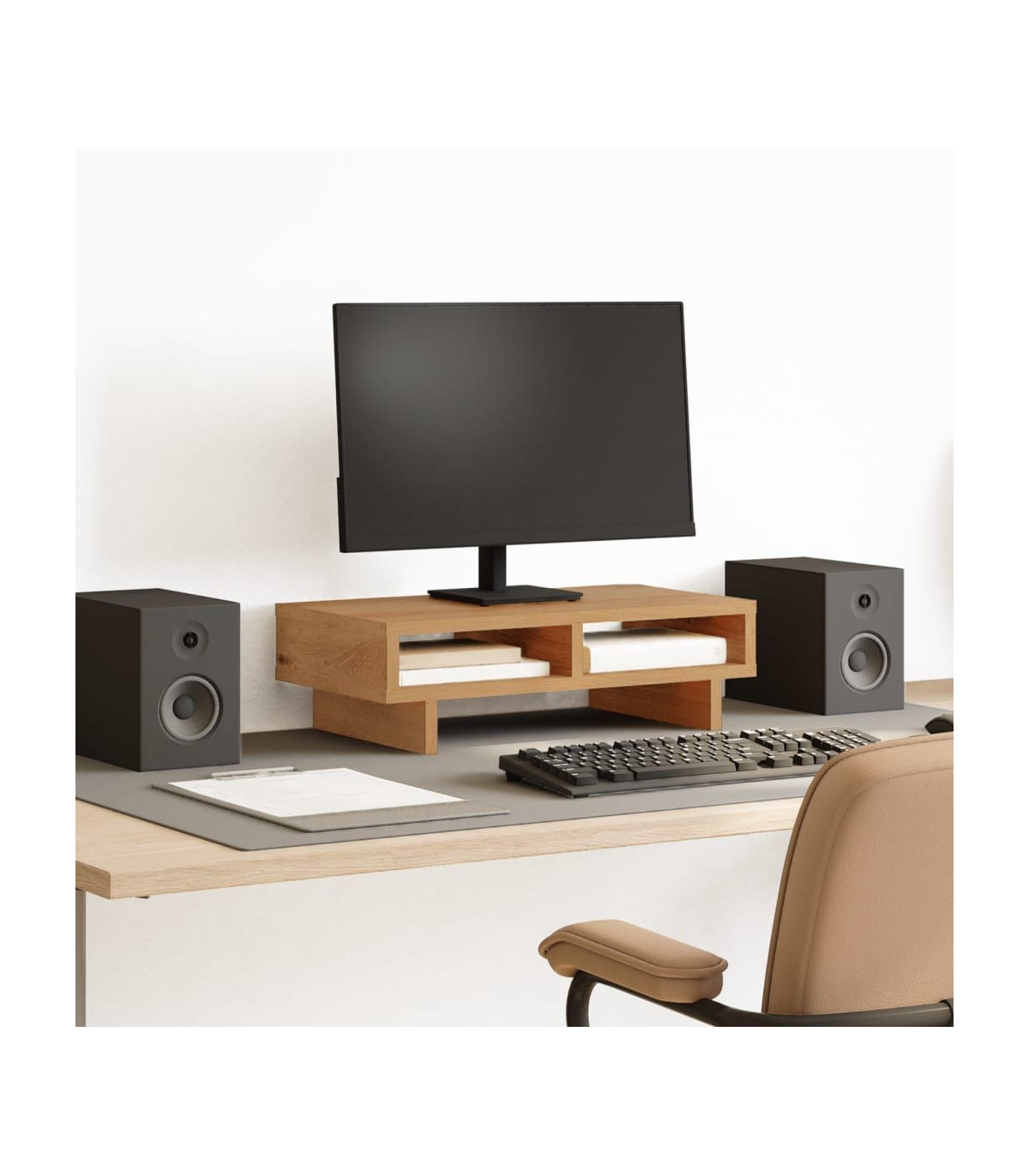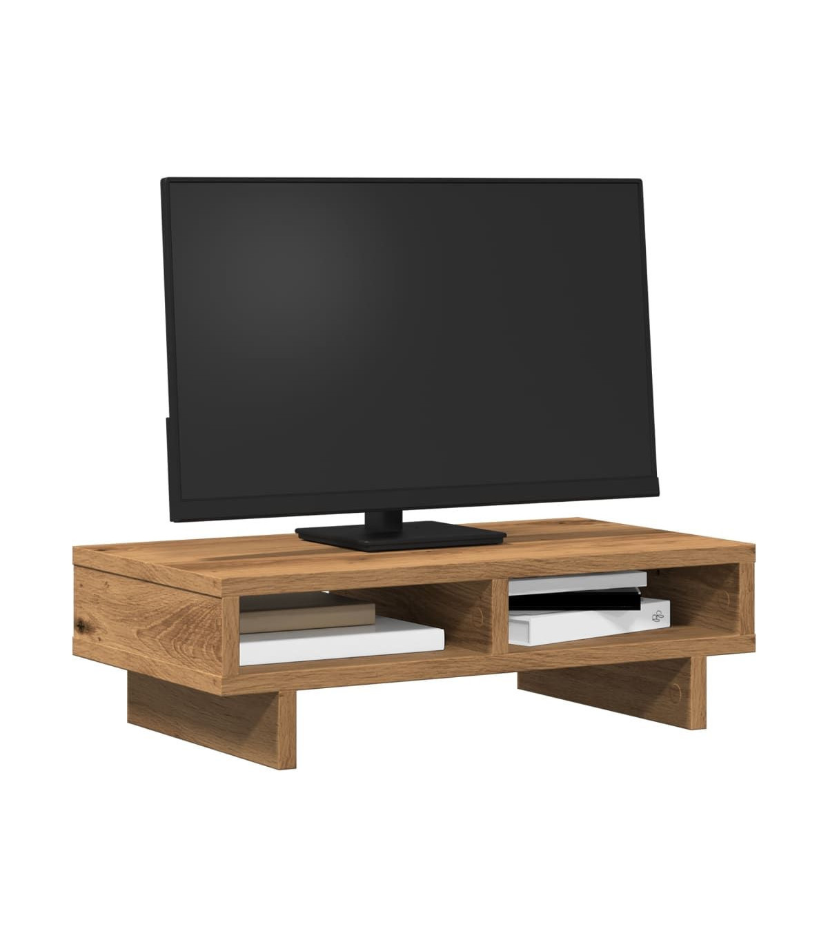Enhance your workspace with this practical monitor stand for better viewing comfort and style. Stable and durable material: Engineered wood is a durable and stable material with a smooth surface that is resistant to moisture, warping, and splitting, making it a reliable choice for various projects.Ample storage space: The screen stand includes 2 compartments, offering extensive storage options for all your office essentials and helping to keep your workspace organized and clutter-free.Easy maintenance: Thanks to its smooth surface, the monitor platform is easy to clean with a damp cloth and requires less maintenance.