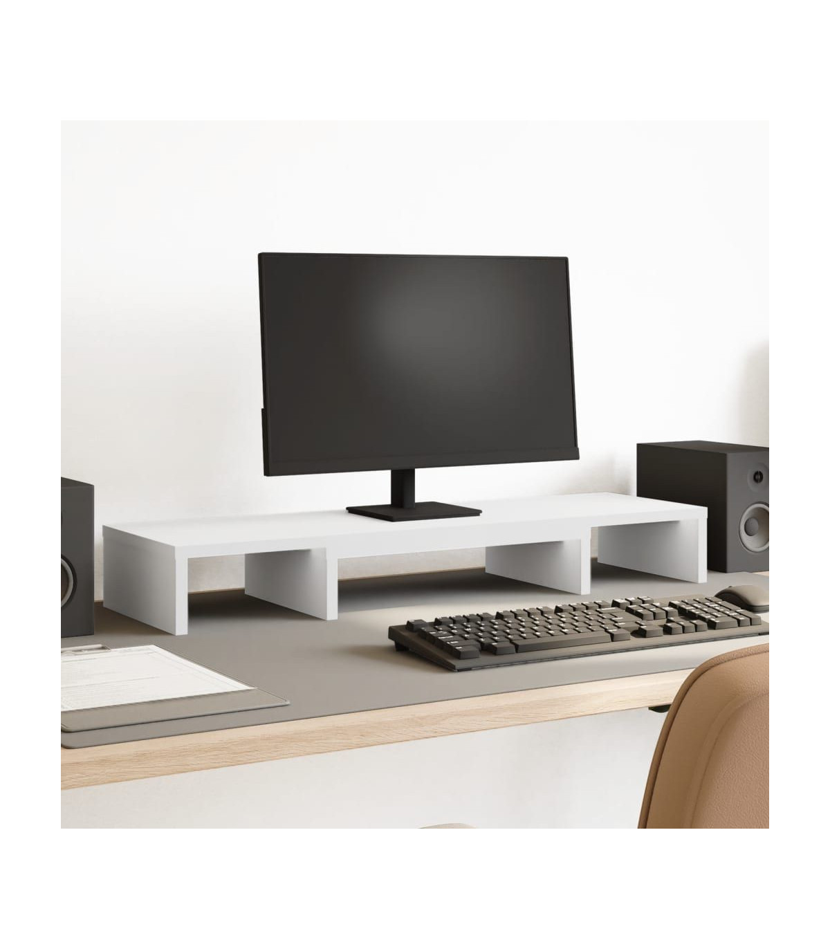 Enhance your workspace with the adjustable monitor stand for better viewing comfort and style! Stable and durable material: Engineered wood is a durable and stable material with a smooth surface that is resistant to moisture, warping, and splitting, making it a reliable choice for various projects.Customisable length: By extending the two larger monitor stands, this configuration maximizes the overall stand's length, offering a spacious platform ideally suited for two monitors.Customisable viewing angle: By adjusting the angles of the two larger stand risers, you can find the perfect viewing angle for reduced strain and increased productivity.Additional storage: The lower section includes ample storage compartments, offering generous space to neatly organize books, notebooks, keyboards, and accommodate a laptop.Easy maintenance: Thanks to its smooth surface, the computer monitor stand is easy to clean with a damp cloth and requires less maintenance.