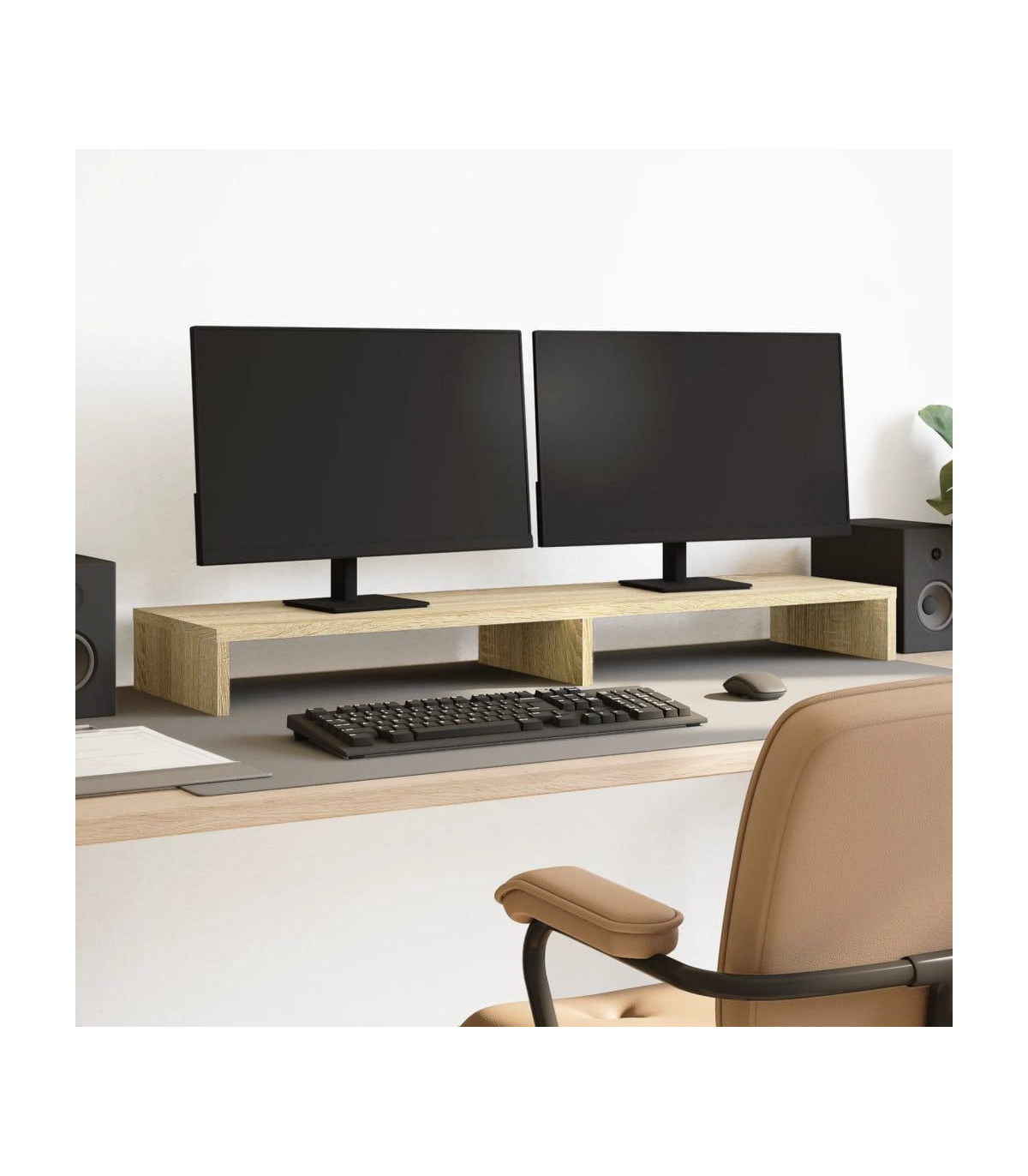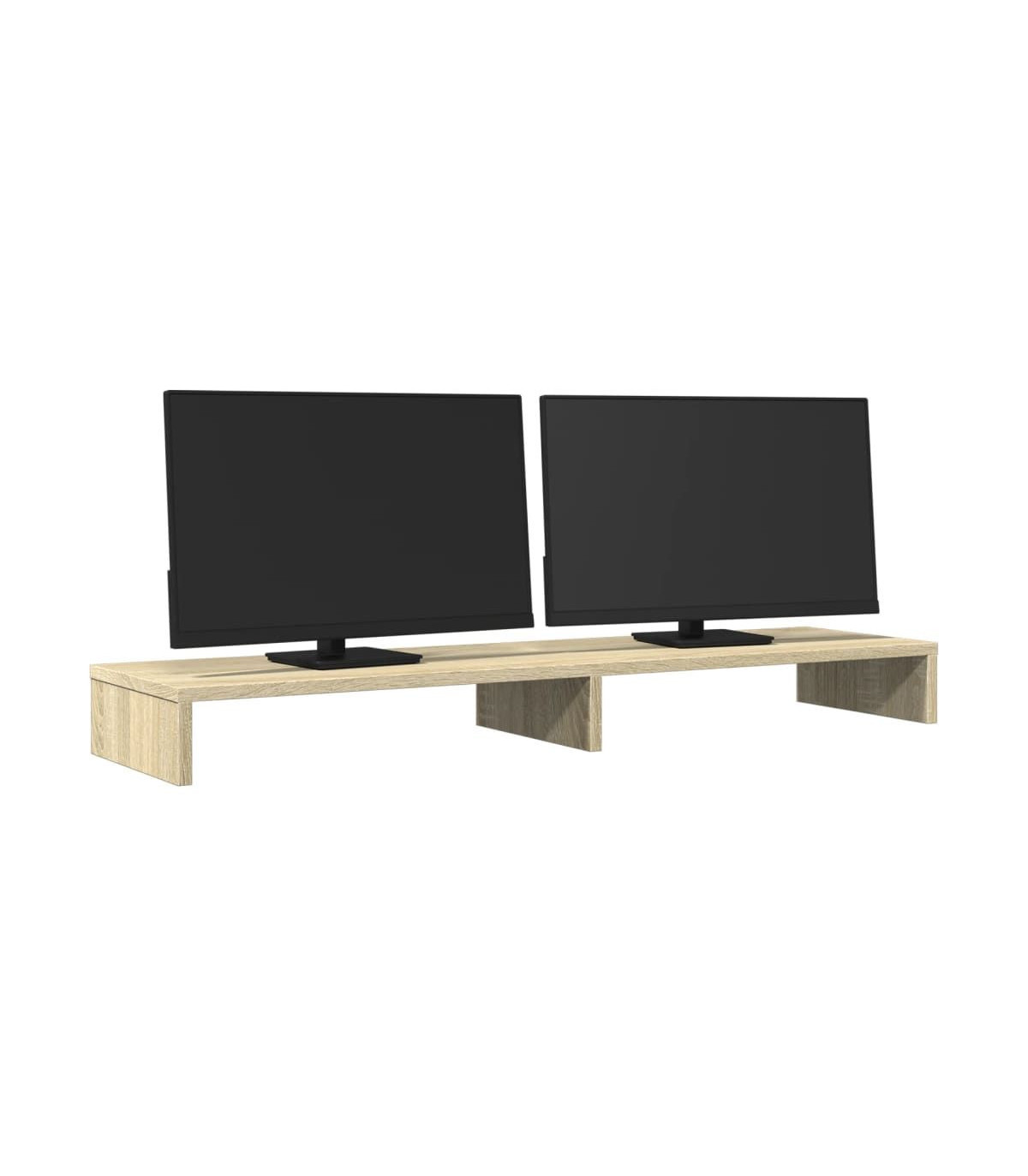 Enhance your workspace with the monitor stand for better viewing comfort and style! Stable and durable material: Engineered wood is a durable and stable material with a smooth surface that is resistant to moisture, warping, and splitting, making it a reliable choice for various projects.Ergonomic design: Elevate your monitor to eye level for better posture and reduced neck strain, thanks to the raised platform design.Additional storage: The lower section includes storage compartments, offering space to neatly organize books, notebooks, keyboards, and accommodate a laptop.Easy maintenance: Thanks to its smooth surface, the dual monitor stand is easy to clean with a damp cloth and requires less maintenance.