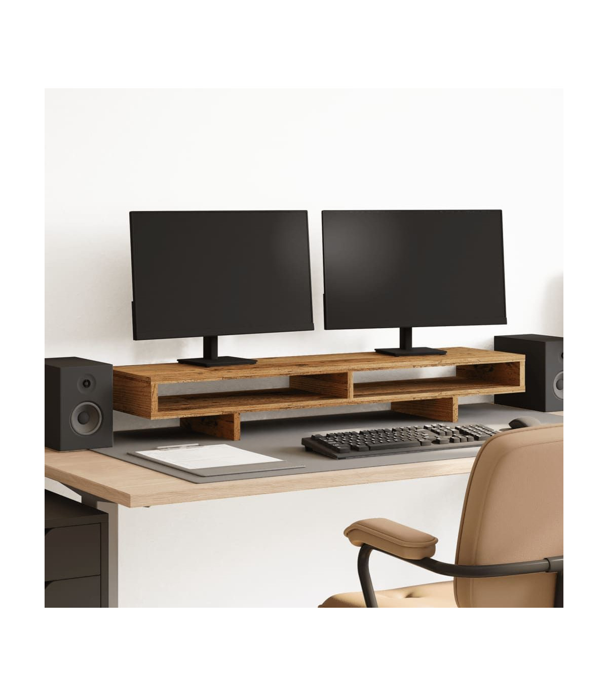 Enhance your workspace with this practical monitor stand for better viewing comfort and style. Stable and durable material: Engineered wood is a durable and stable material with a smooth surface that is resistant to moisture, warping, and splitting, making it a reliable choice for various projects.Ample storage space: The screen stand includes 2 compartments, offering extensive storage options for all your office essentials and helping to keep your workspace organized and clutter-free.Easy maintenance: Thanks to its smooth surface, the monitor platform is easy to clean with a damp cloth and requires less maintenance.