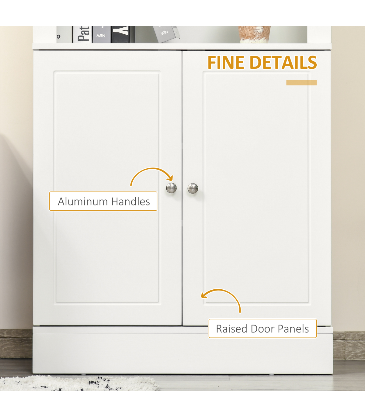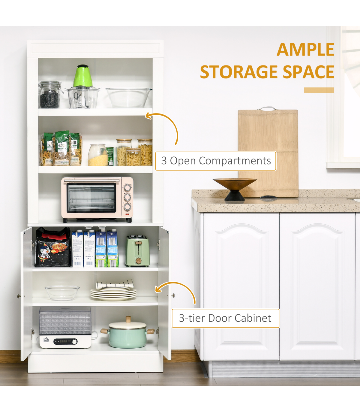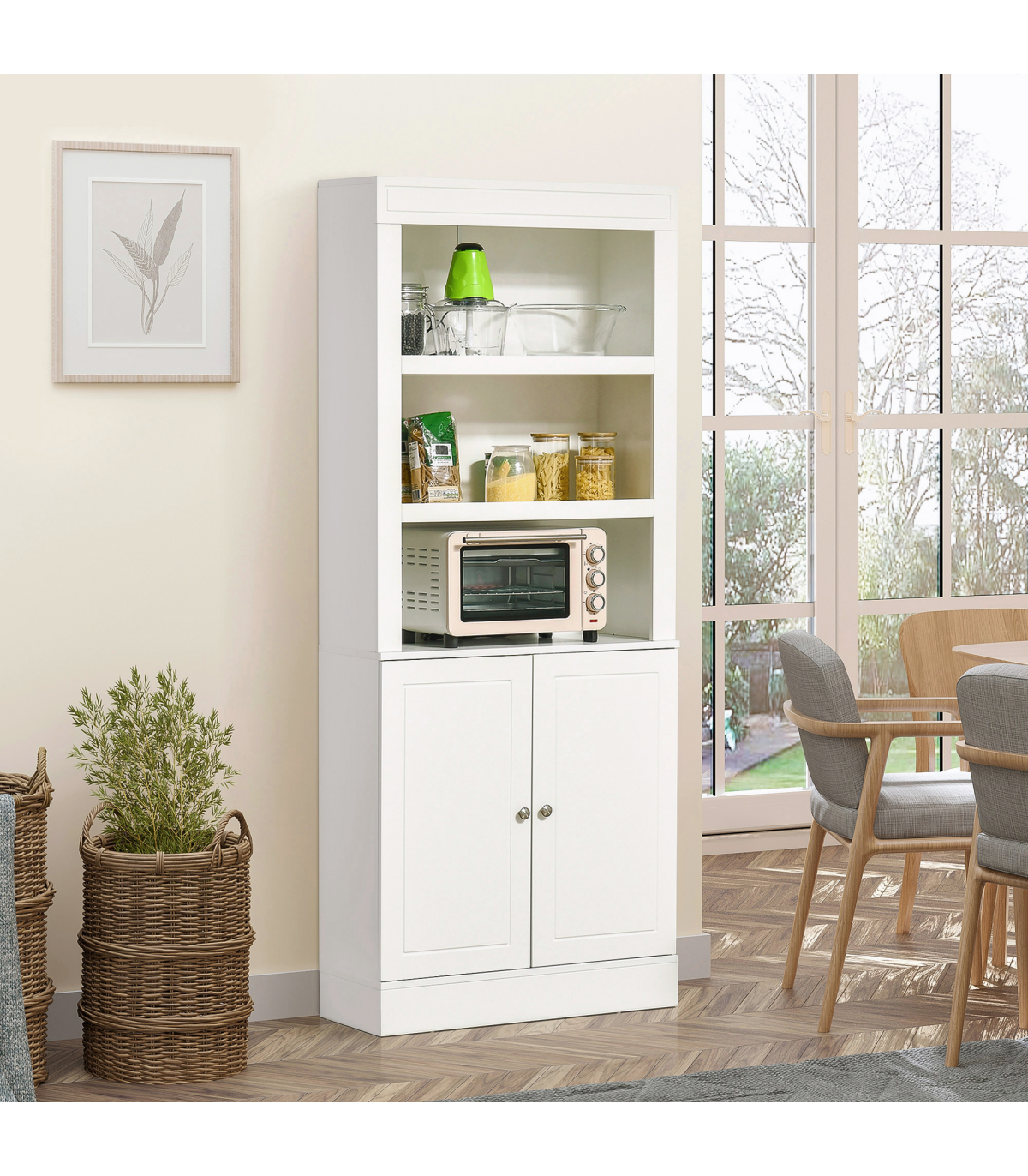 Need more storage options in the kitchen? Then this HOMCOM kitchen cabinet is here to help! Six tiers are formed of two adjustable shelves in the bottom cupboard, with three open shelves on the top, a mix of open and discreet storage. Made from a blend of MDF and particle board, the structure of the kitchen dresser is sturdy and reliable for daily use. Add style, whilst reducing visible clutter with this handy kitchen cupboard.