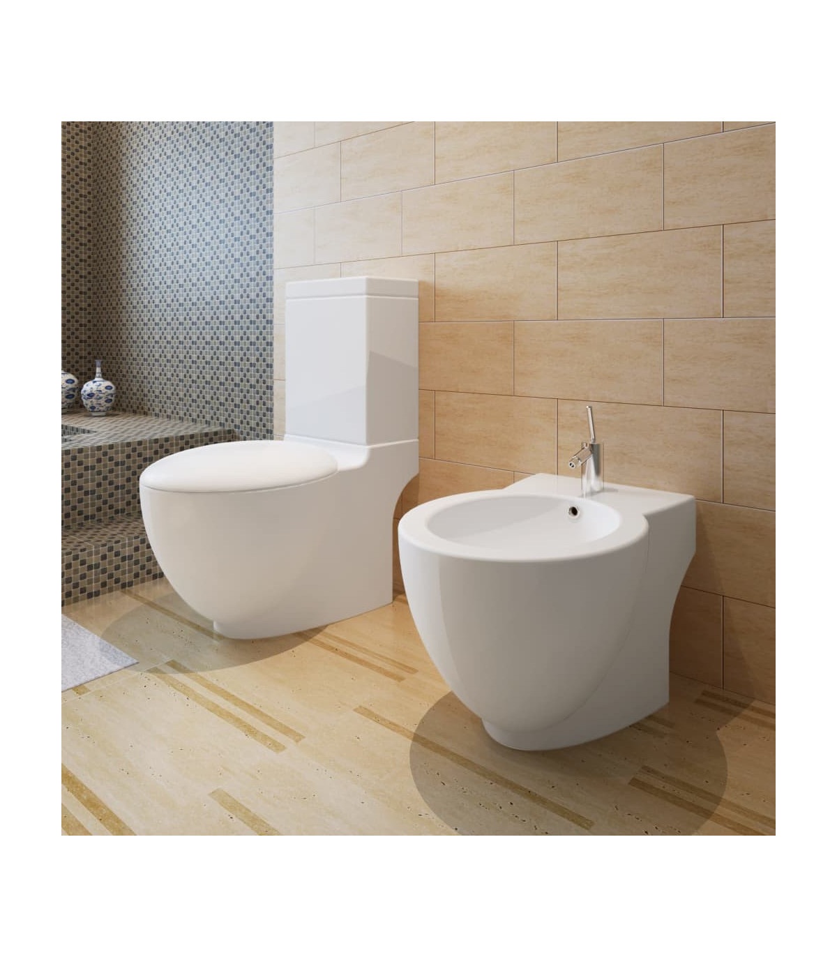 The floor-standing toilet & bidet set has a timeless design which will surely bring a touch of style to wherever it goes to. Coming complete with a cistern, this toilet flushes in a practical mechanism, which allows enough water to flow through. Its modern dual flush system ensures 3 or 6 litre flushing. The toilet seat has a soft close mechanism which prevents loud slamming of the lid on the toilet bowl. Just a fingertip touch and the lid closes all by itself. The bidet has a unique design which offers comfort at the highest level. It is a perfect choice for cleansing of the body and offering relief of certain health conditions. Made of quality ceramic, this toilet & bidet set is durable for years of use. Note: The drain pipe is at the back and horizontally exits behind the toilet connecting to wall.