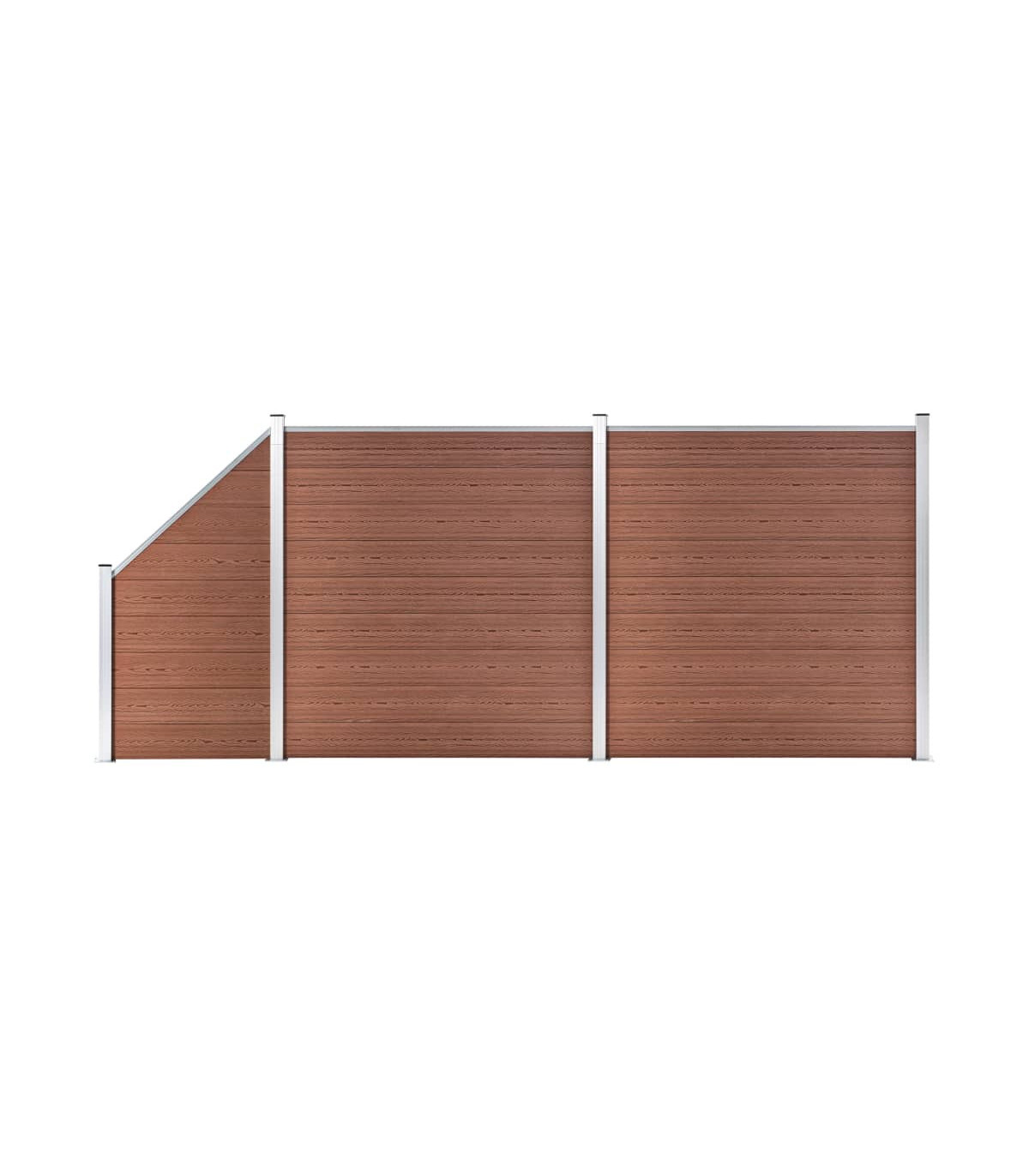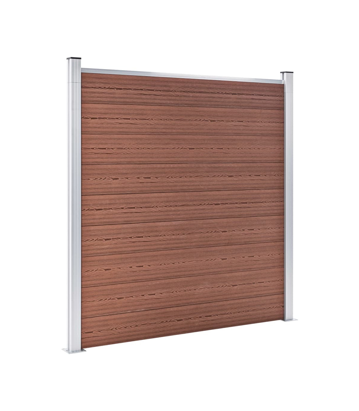 Our fence panel set can be used as garden barrier or residential fence for privacy and security. This WPC fence has a wood grain print on one side and regular print on the other side, so you can choose the design you like best. Our wood-plastic composite panel does not require any additional treatment like oiling or painting. It is very durable and resistant to rot or rust. Thanks to the aluminium top profile, the fence boards can be tightly attached to each other, which increases their rigidity and strength against impact. Designed with the modular system, the fence boards are easy to install and allow you to expand the fence freely. These posts feature three slots, which enable you to assemble the fence in various ways, for example, in a straight line (180 degrees), right angle (90 degrees) or "T"-shape. The multifunctional steel feet can be fixed in two ways. The first one is by screwing them onto a surface, using the supplied anchor screws. The second way is by anchoring them into a cement base, using the ground spike (not included). This fence set is easy to assemble. Delivery includes 9 WPC boards, 2 posts, 2 steel bases and 1 aluminium bar.