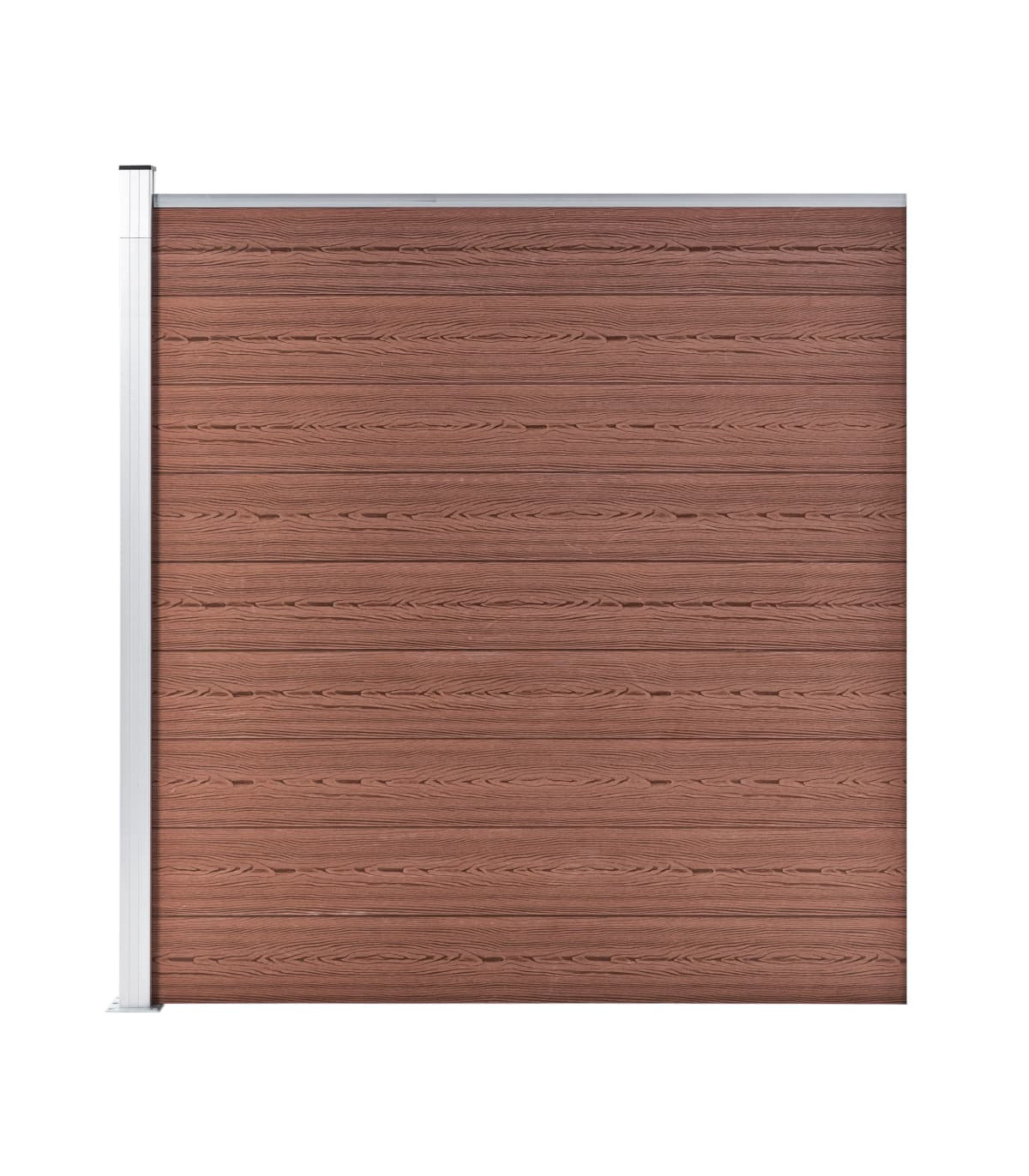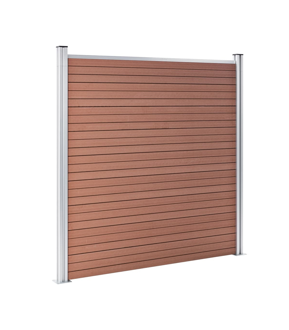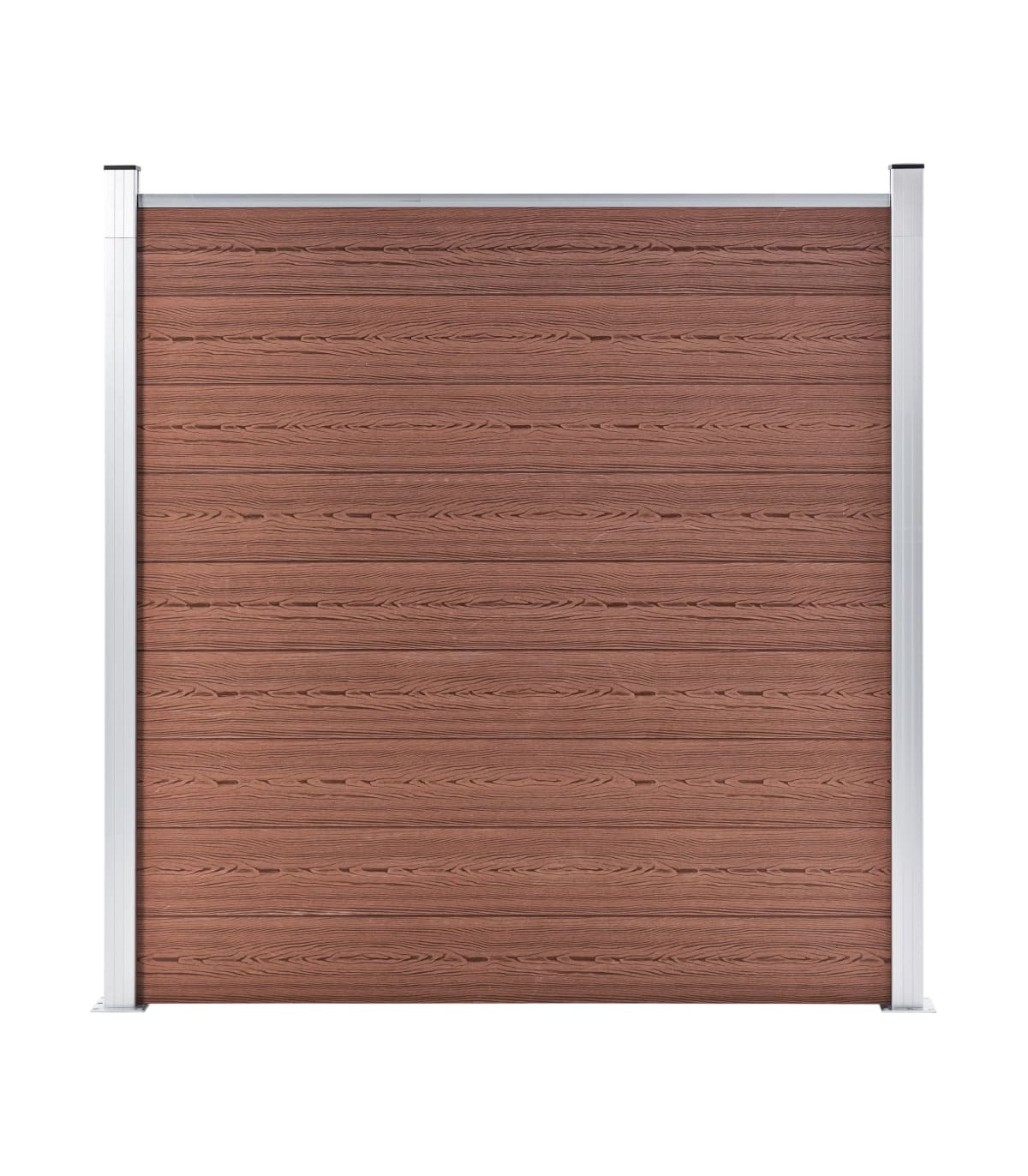 Our fence panel set can be used as garden barrier or residential fence for privacy and security. This WPC fence has a wood grain print on one side and regular print on the other side, so you can choose the design you like best. Our wood-plastic composite panel does not require any additional treatment like oiling or painting. It is very durable and resistant to rot or rust. Thanks to the aluminium top profile, the fence boards can be tightly attached to each other, which increases their rigidity and strength against impact. Designed with the modular system, the fence boards are easy to install and allow you to expand the fence freely. These posts feature three slots, which enable you to assemble the fence in various ways, for example, in a straight line (180 degrees), right angle (90 degrees) or "T"-shape. The multifunctional steel feet can be fixed in two ways. The first one is by screwing them onto a surface, using the supplied anchor screws. The second way is by anchoring them into a cement base, using the ground spike (not included). This fence set is easy to assemble. Delivery includes 9 WPC boards, 2 posts, 2 steel bases and 1 aluminium bar.
