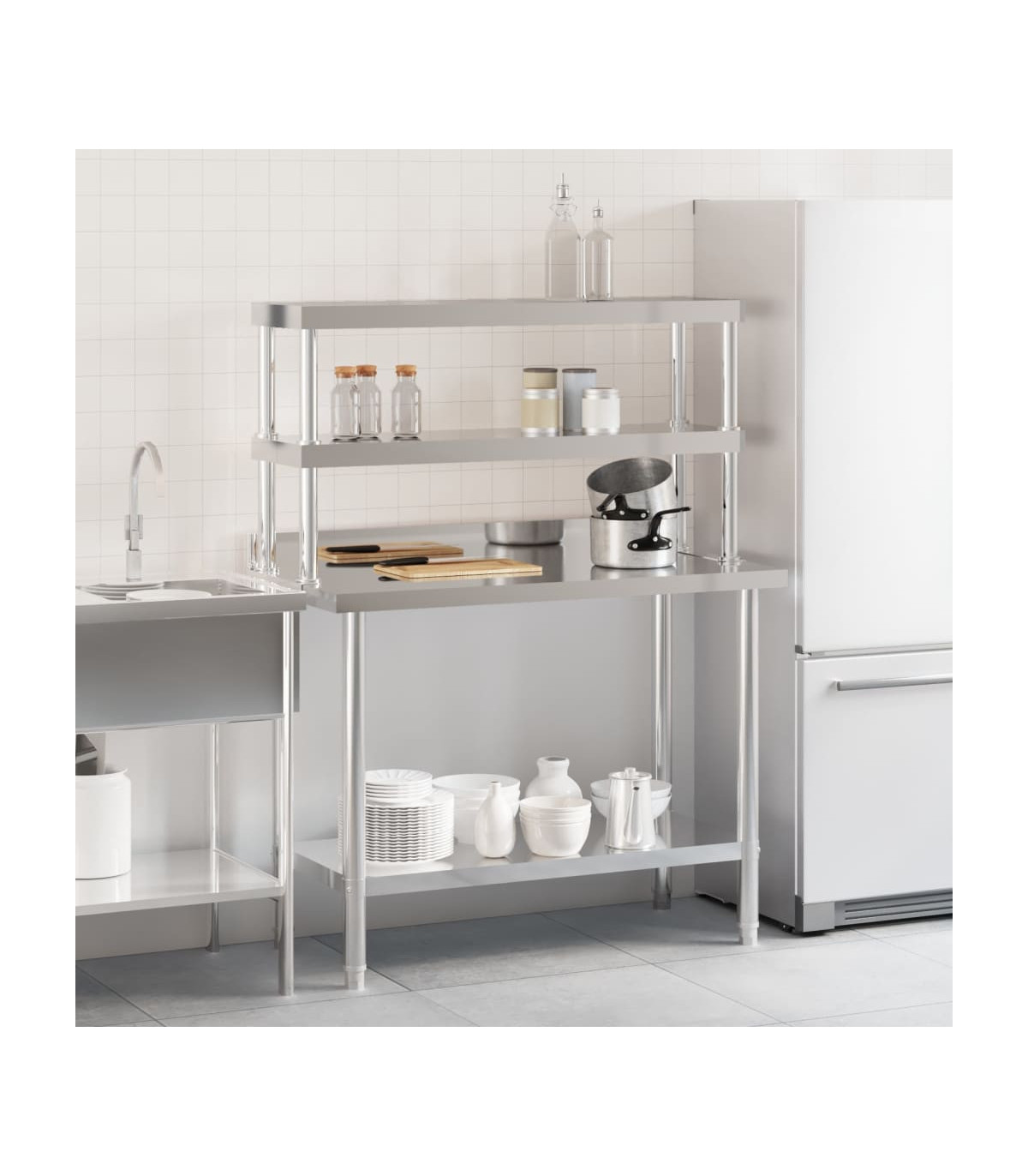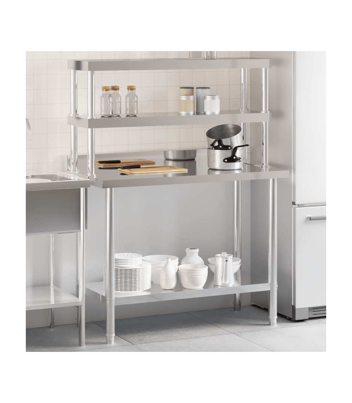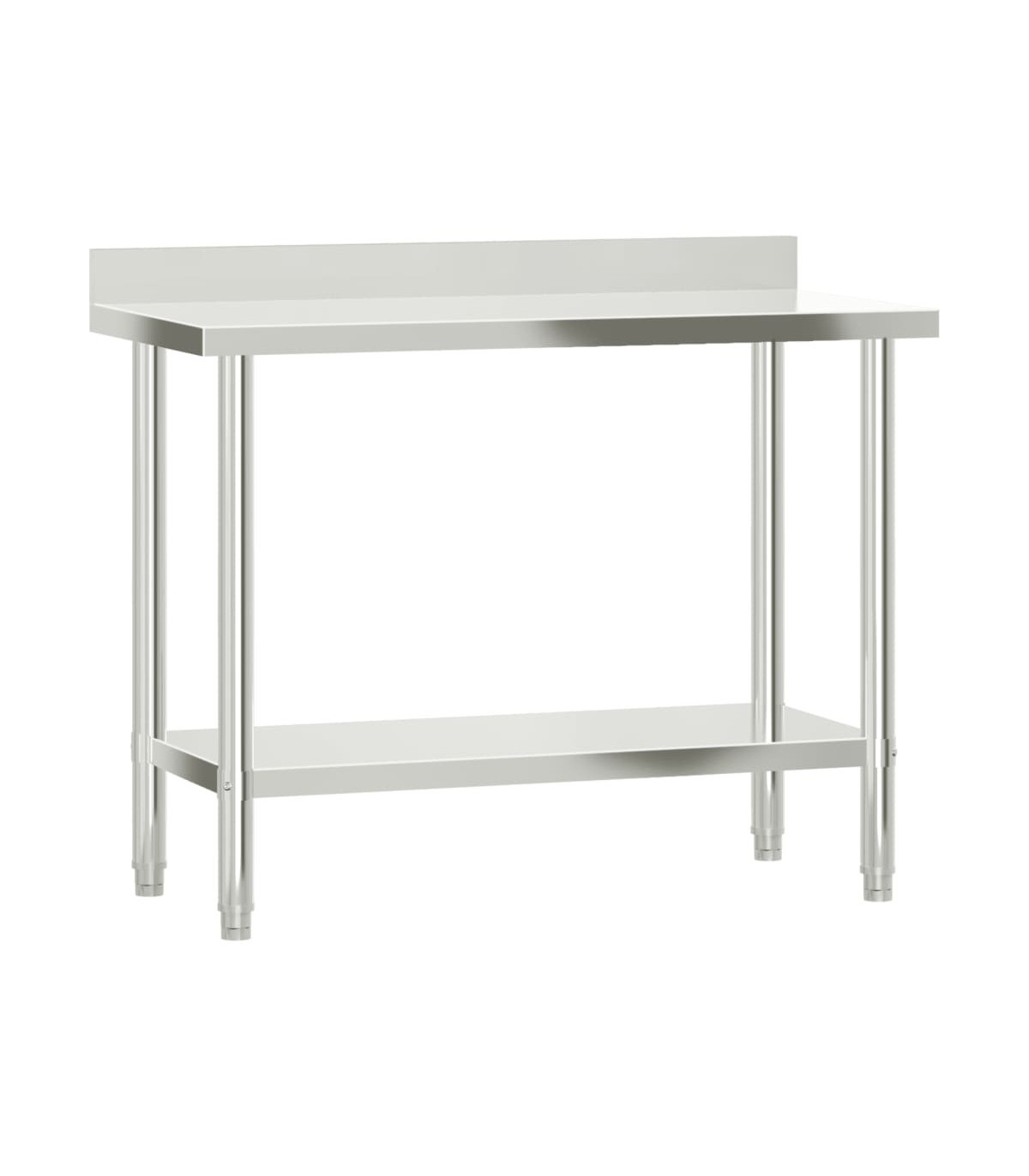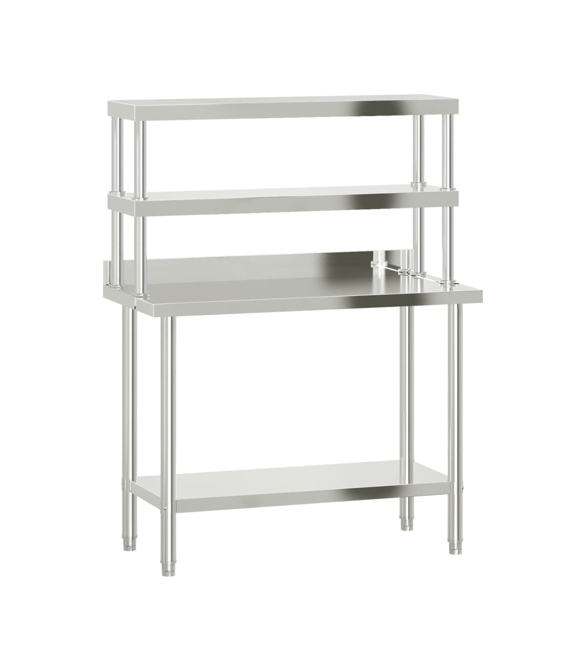 This kitchen work table is perfect for food prep and storage and is ideal for a kitchen bar, restaurant, school, as well as other commercial places. Durable and stable construction: The work table is made of stainless steel, providing resistance to corrosion and rust for years of reliable use. The smooth surface is easy to clean and maintain, ensuring a hygienic food preparation area.Ample workplace: The stainless steel prep table is designed with a bottom shelf and a 2-tier overshelf for customised storage space, providing ample storage space for your microwave oven, kitchen utensils, or any other tools you may need.Practical backsplash: The backslash effectively protects your walls from scratches and dirty water, ensuring a clean and tidy kitchen.Adjustable feet: The adjustable feet with a non-slip design ensure the kitchen prep table remains stable and will stay put, protecting the floor from damage. Warning:To prevent it from tipping over, this product must be used with the provided wall attachment device.