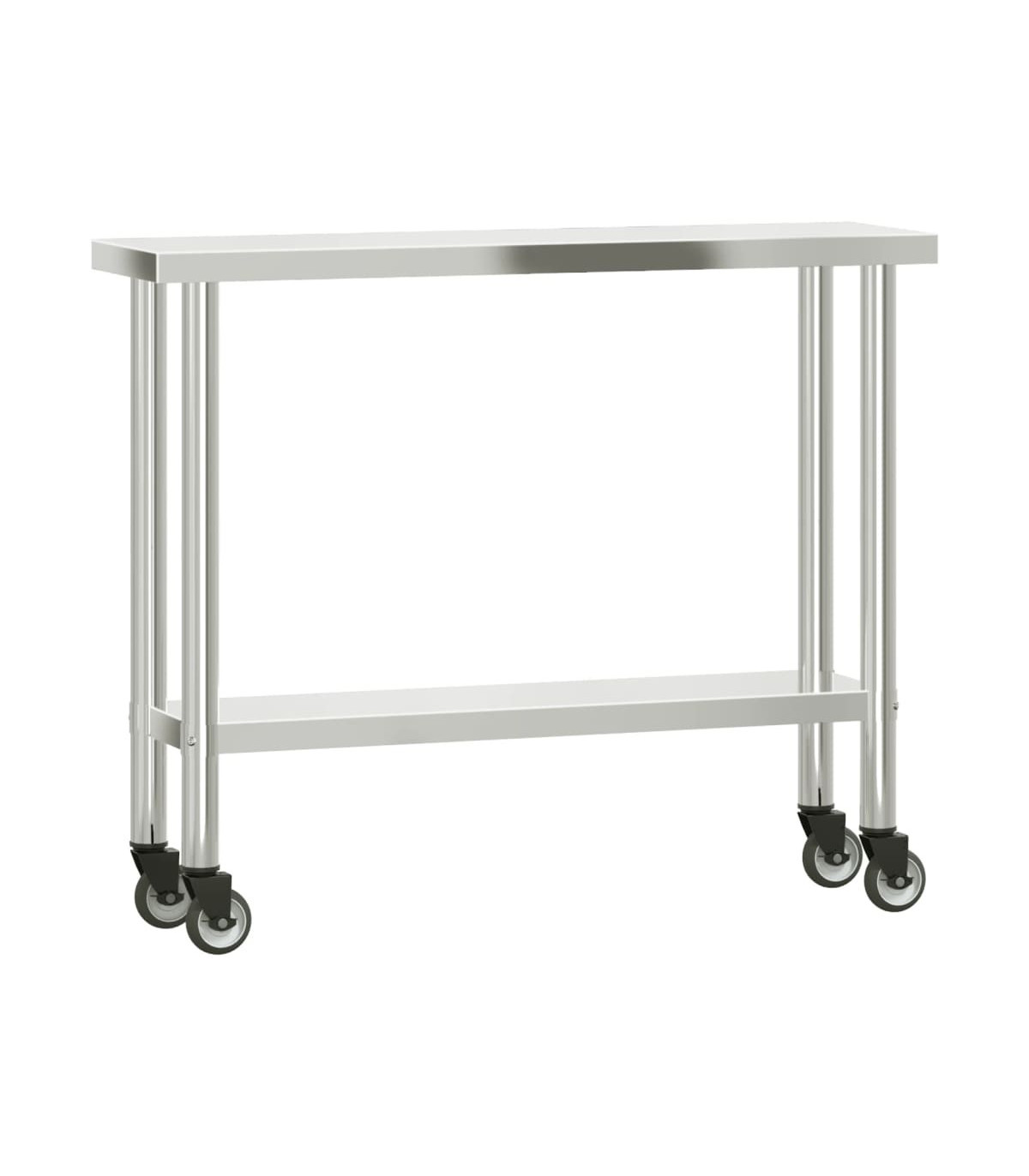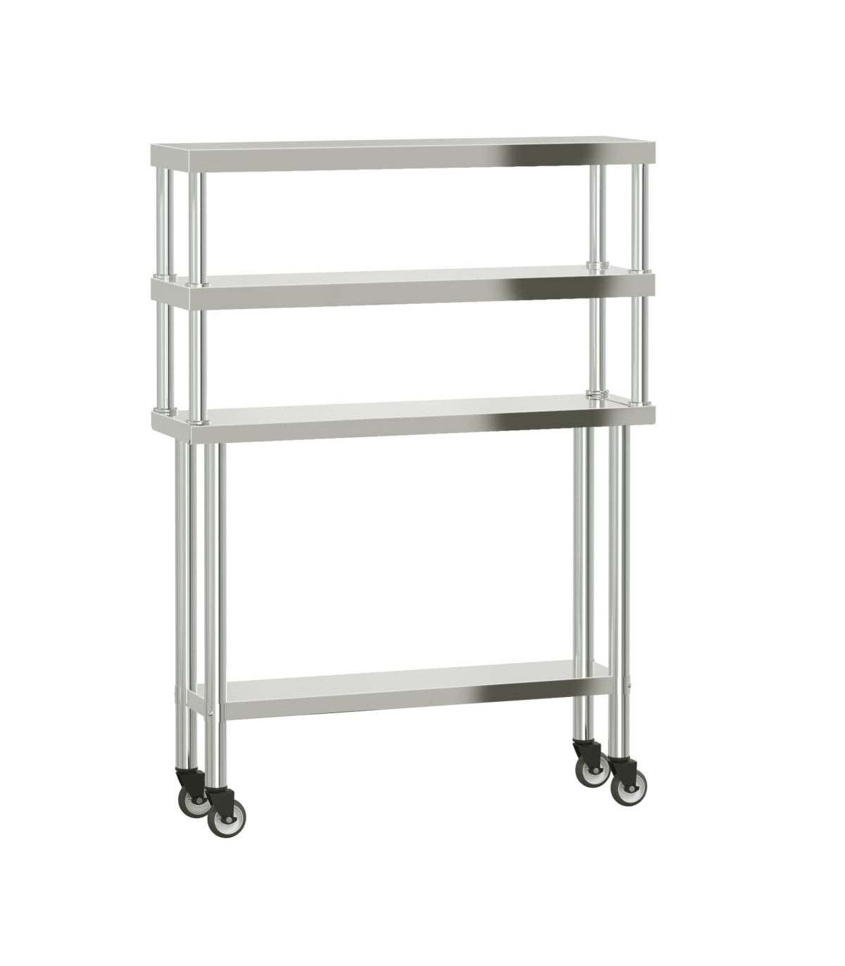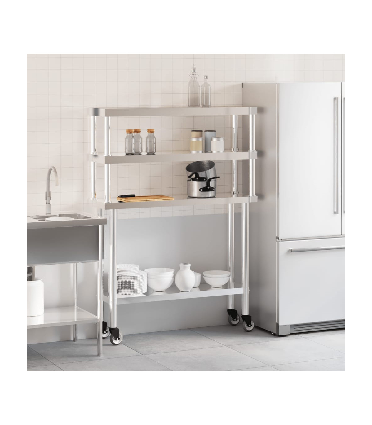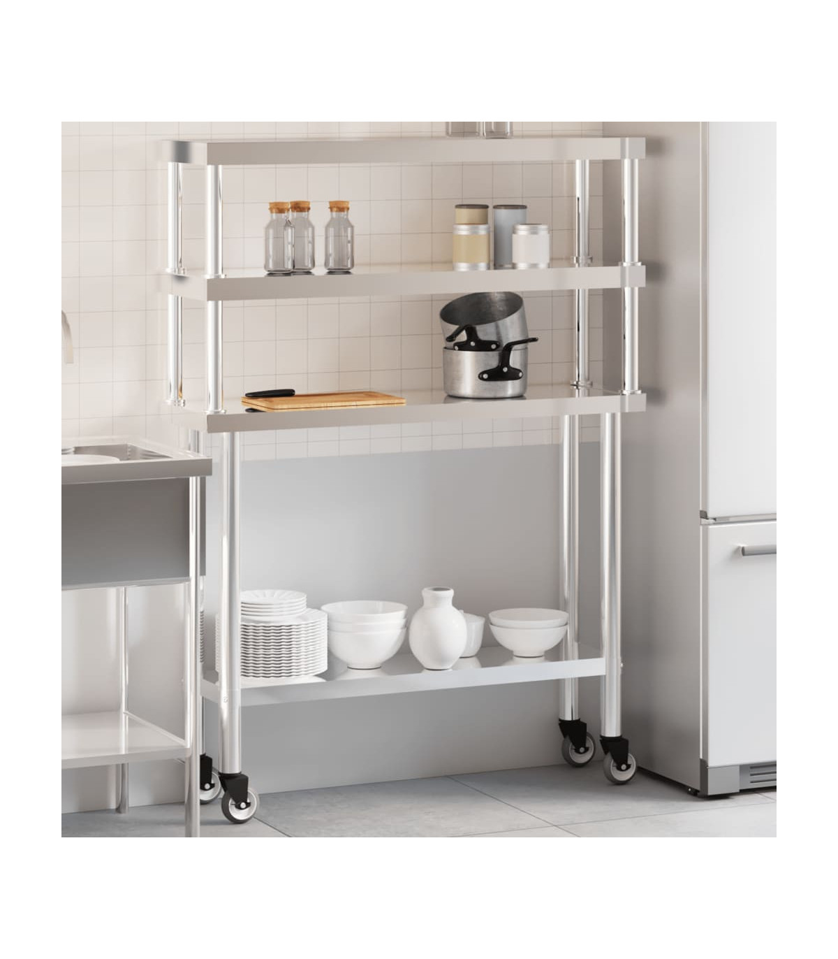 This kitchen work table is perfect for food prep and storage and is ideal for a kitchen bar, restaurant, school, as well as other commercial places. Durable and stable construction: The work table is made of stainless steel, providing resistance to corrosion and rust for years of reliable use. The smooth surface is easy to clean and maintain, ensuring a hygienic food preparation area.Ample workplace: The stainless steel prep table is designed with a bottom shelf and a 2-tier overshelf for customised storage space, providing ample storage space for your microwave oven, kitchen utensils, or any other tools you may need.Flexible movement: The prep table comes with 4 wheels, making it easy and convenient to roll it wherever you need it. Additionally, 2 wheels are lockable for added control and safety. Warning:To prevent it from tipping over, this product must be used with the provided wall attachment device.