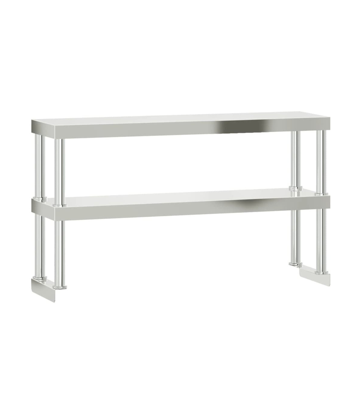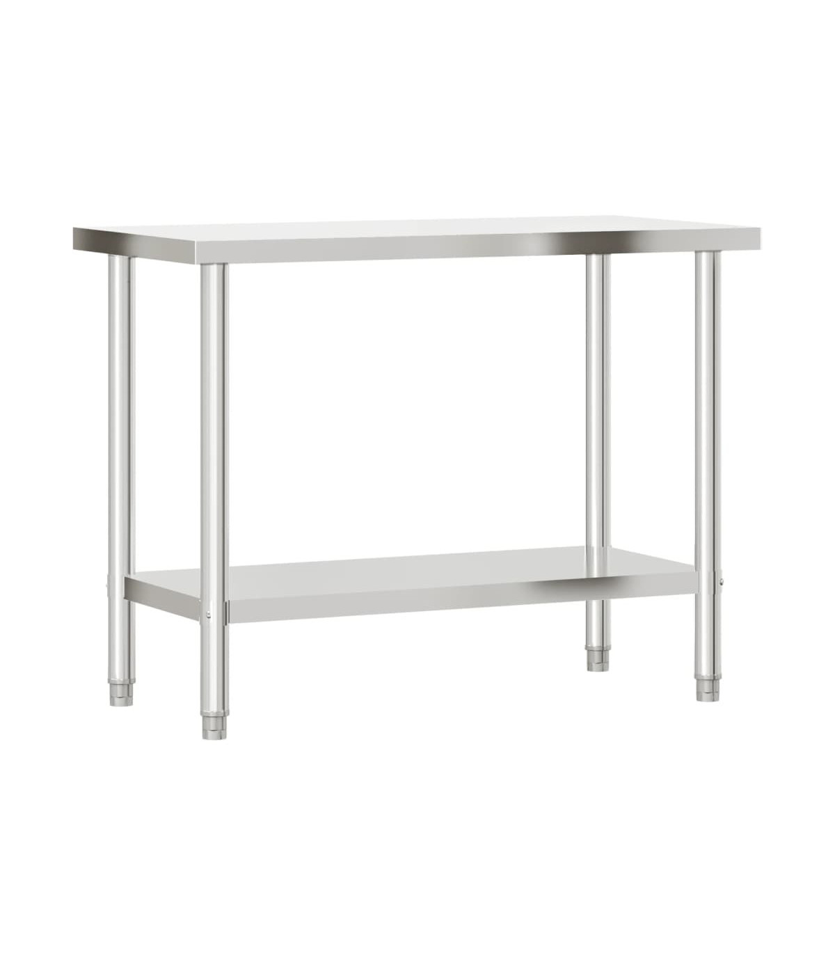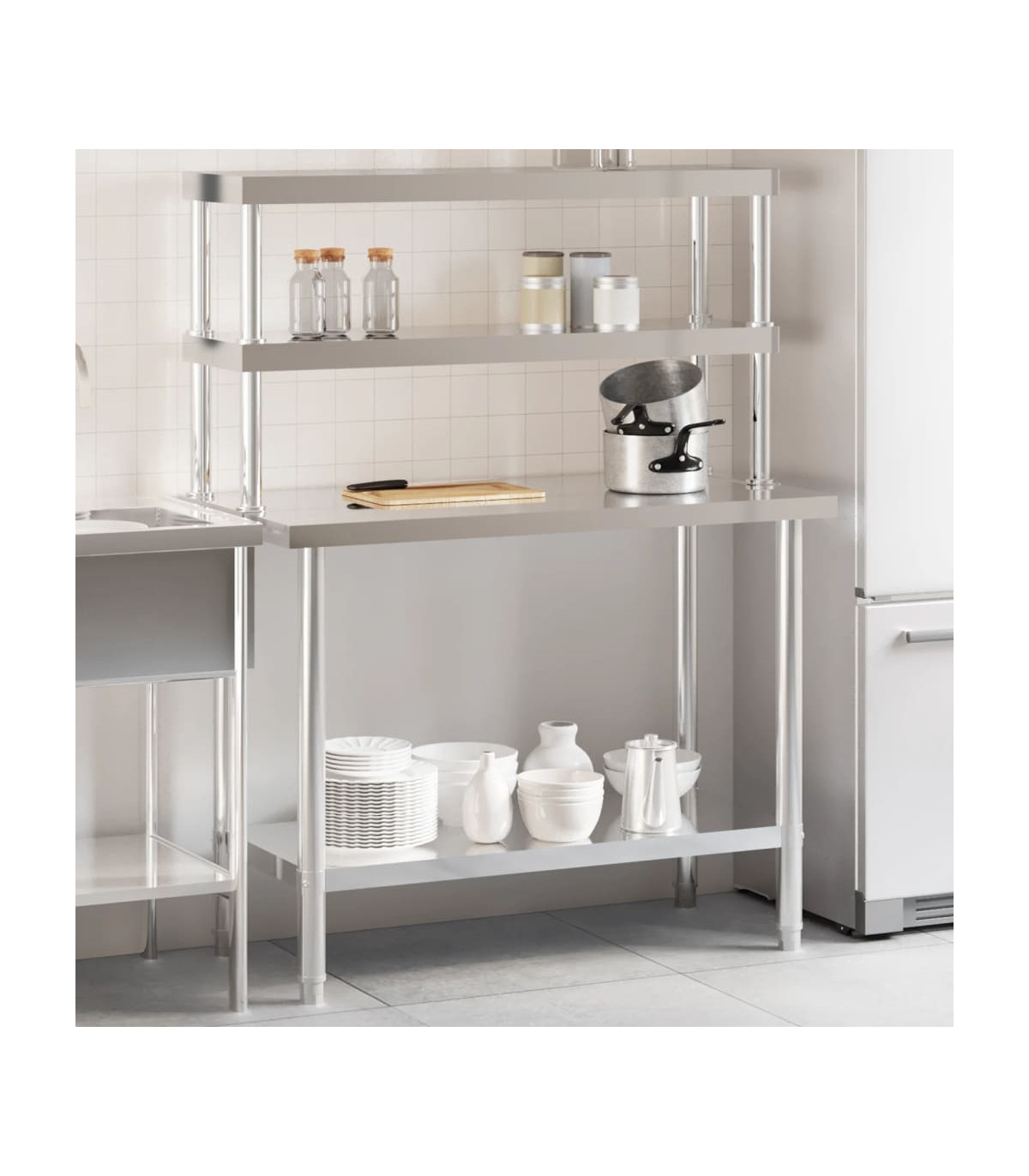 This kitchen work table is perfect for food prep and storage and is ideal for a kitchen bar, restaurant, school, as well as other commercial places. Durable and stable construction: The work table is made of stainless steel, providing resistance to corrosion and rust for years of reliable use. The smooth surface is easy to clean and maintain, ensuring a hygienic food preparation area.Ample workplace: The stainless steel prep table is designed with a bottom shelf and a 2-tier overshelf for customised storage space, providing ample storage space for your microwave oven, kitchen utensils, or any other tools you may need.Adjustable feet: The adjustable feet with a non-slip design ensure the kitchen prep table remains stable and will stay put, protecting the floor from damage. Warning:To prevent it from tipping over, this product must be used with the provided wall attachment device.