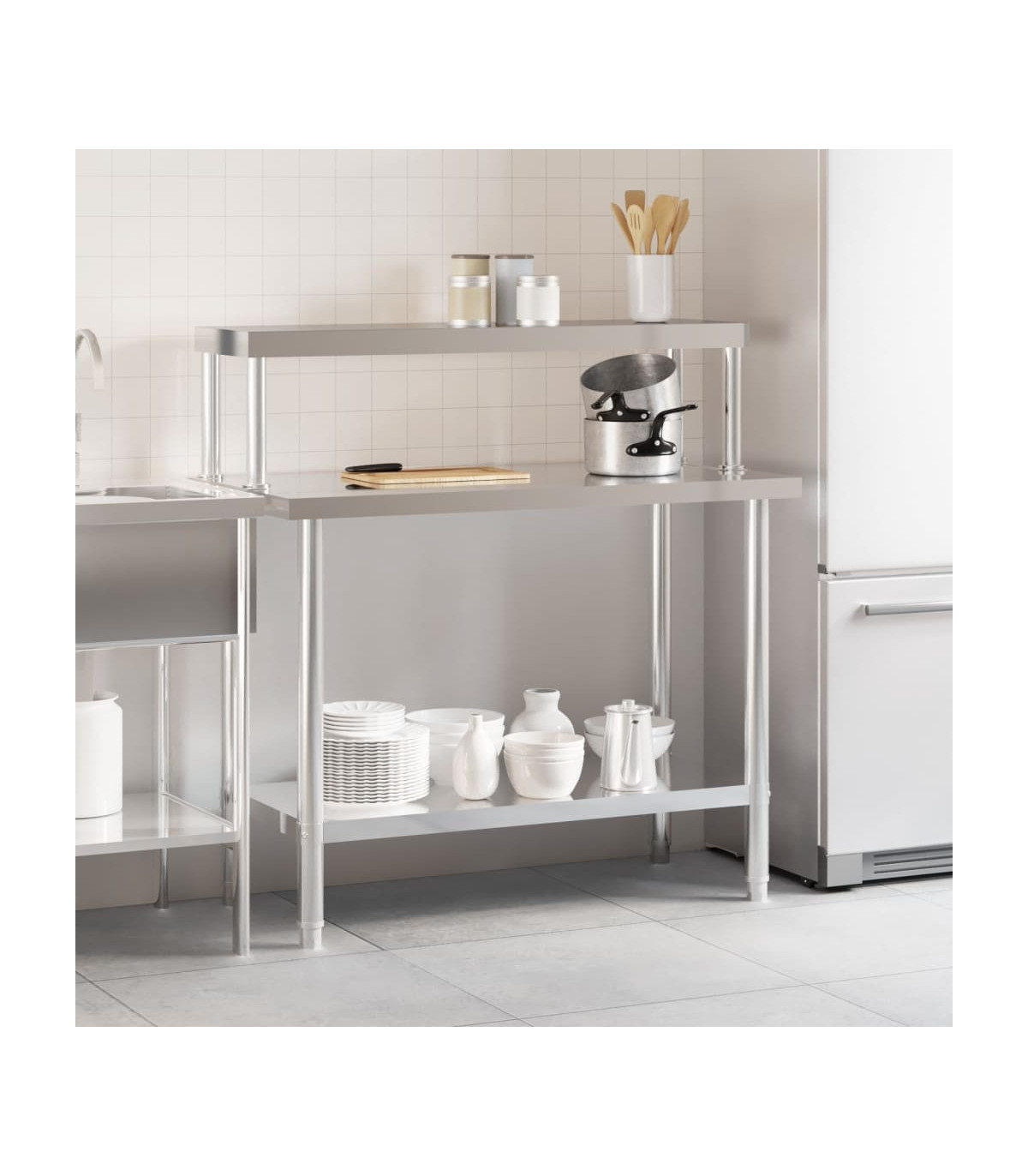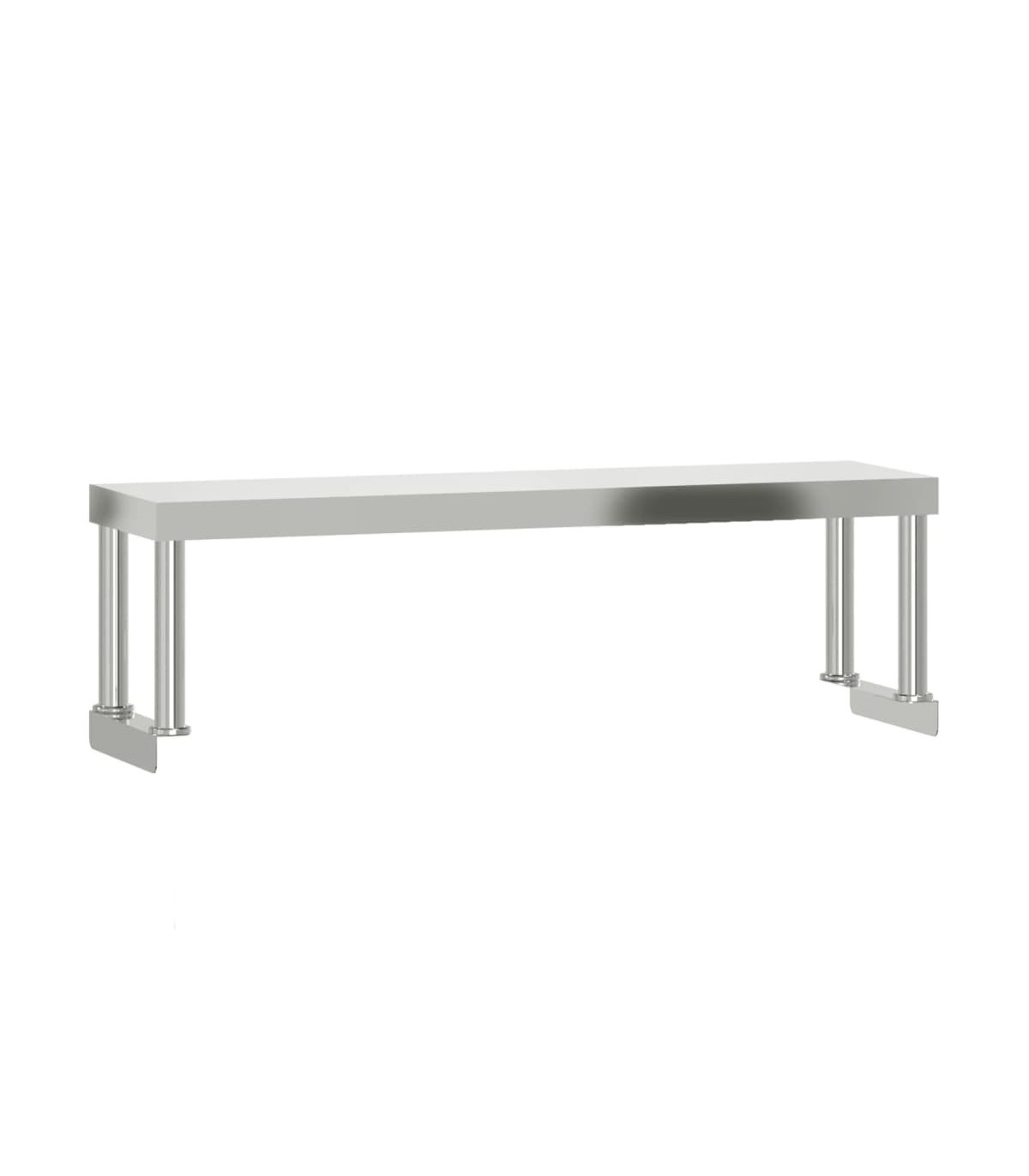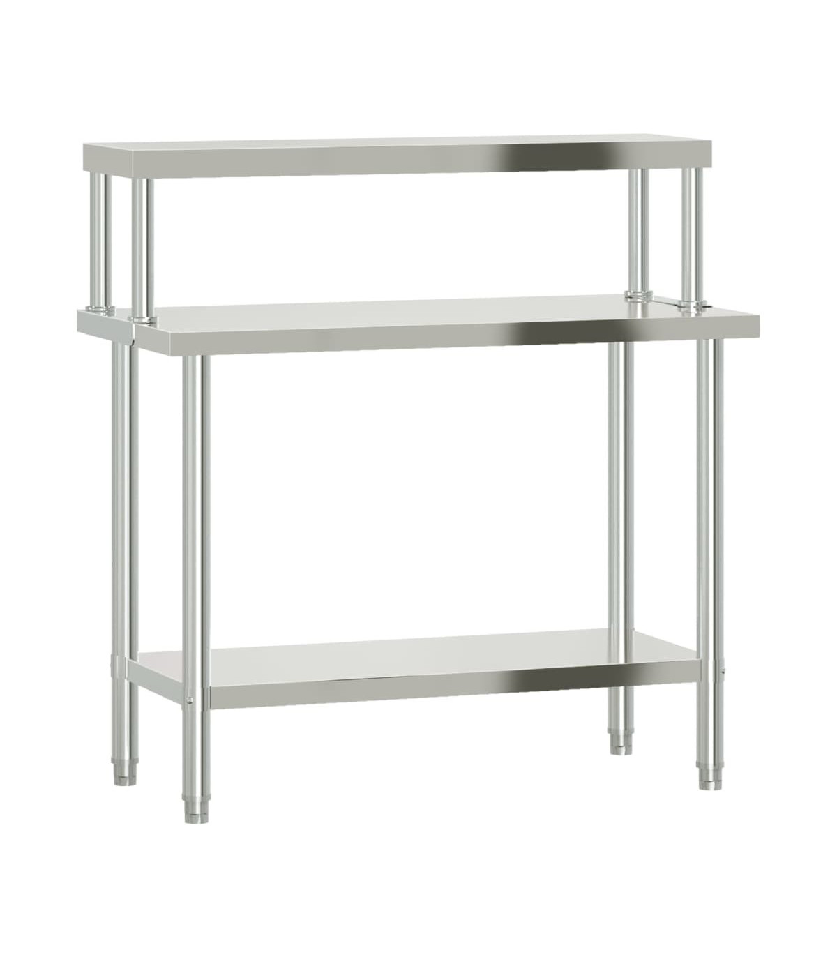 This kitchen work table is perfect for food prep and storage and is ideal for a kitchen bar, restaurant, school, as well as other commercial places. Durable and stable construction: The work table is made of stainless steel, providing resistance to corrosion and rust for years of reliable use. The smooth surface is easy to clean and maintain, ensuring a hygienic food preparation area.Ample workplace: The stainless steel prep table is designed with a bottom shelf and a overshelf for customised storage space, providing ample storage space for your microwave oven, kitchen utensils, or any other tools you may need.Adjustable feet: The adjustable feet with a non-slip design ensure the kitchen prep table remains stable and will stay put, protecting the floor from damage. Warning:To prevent it from tipping over, this product must be used with the provided wall attachment device.