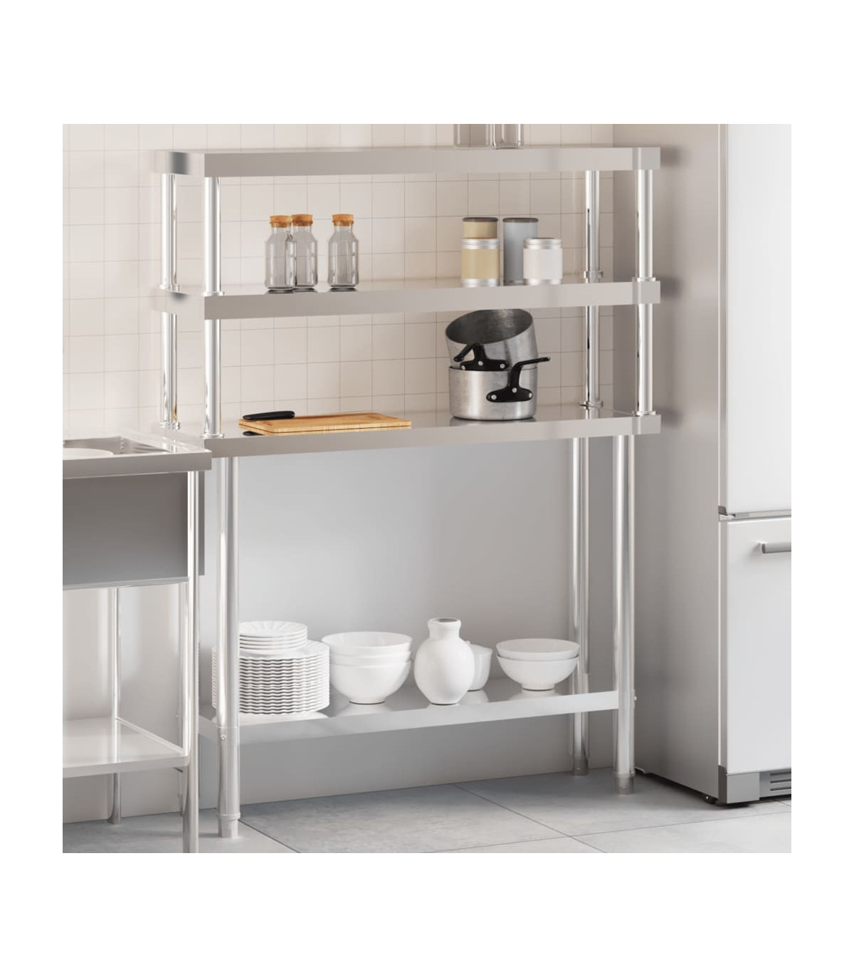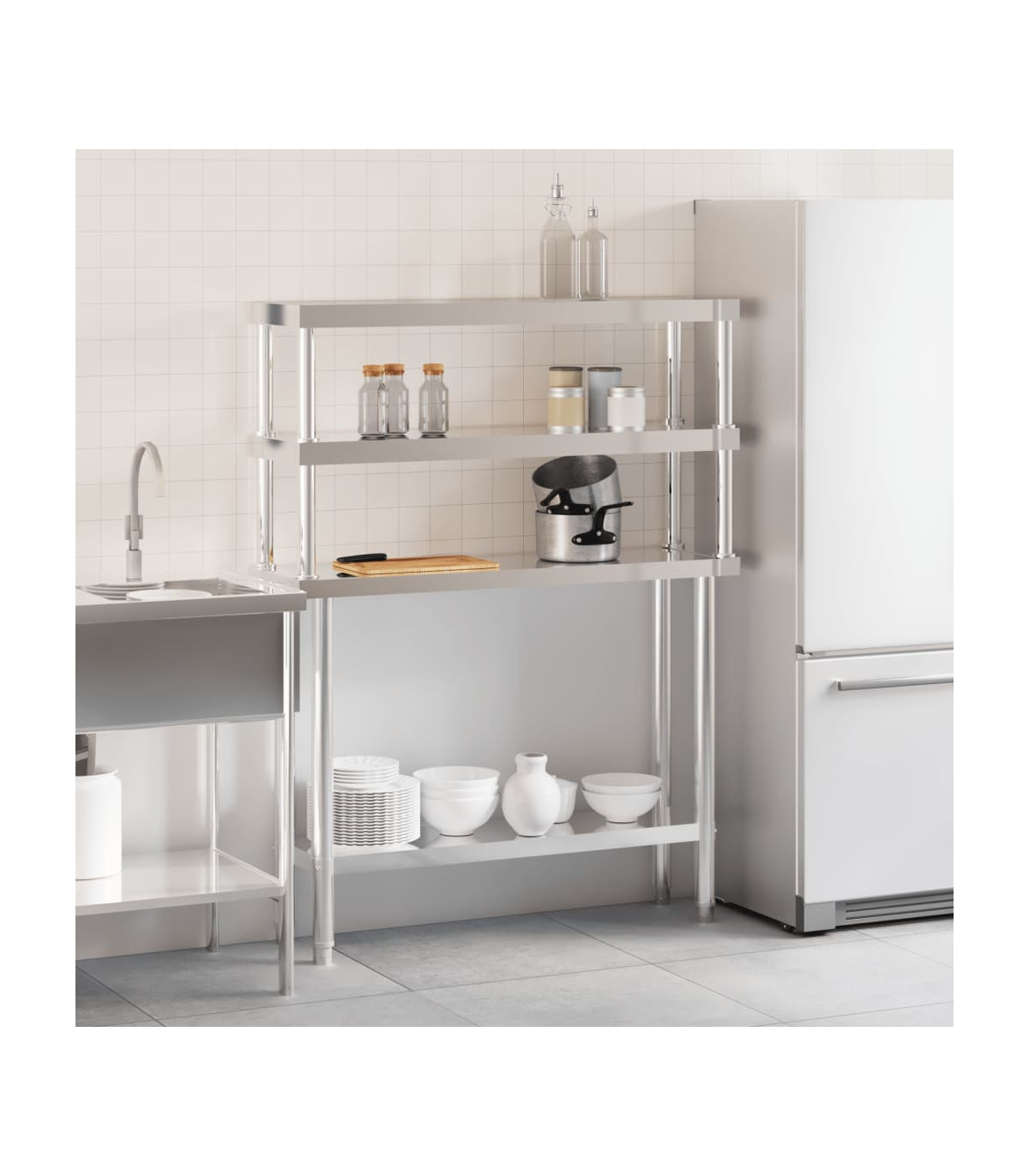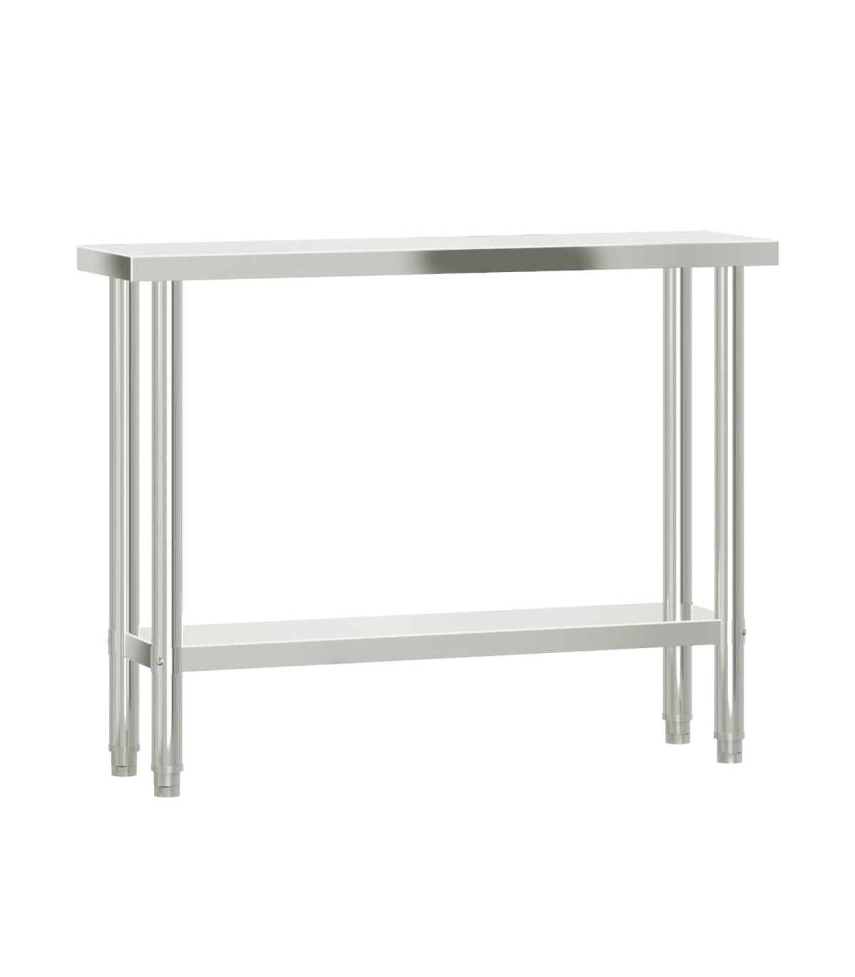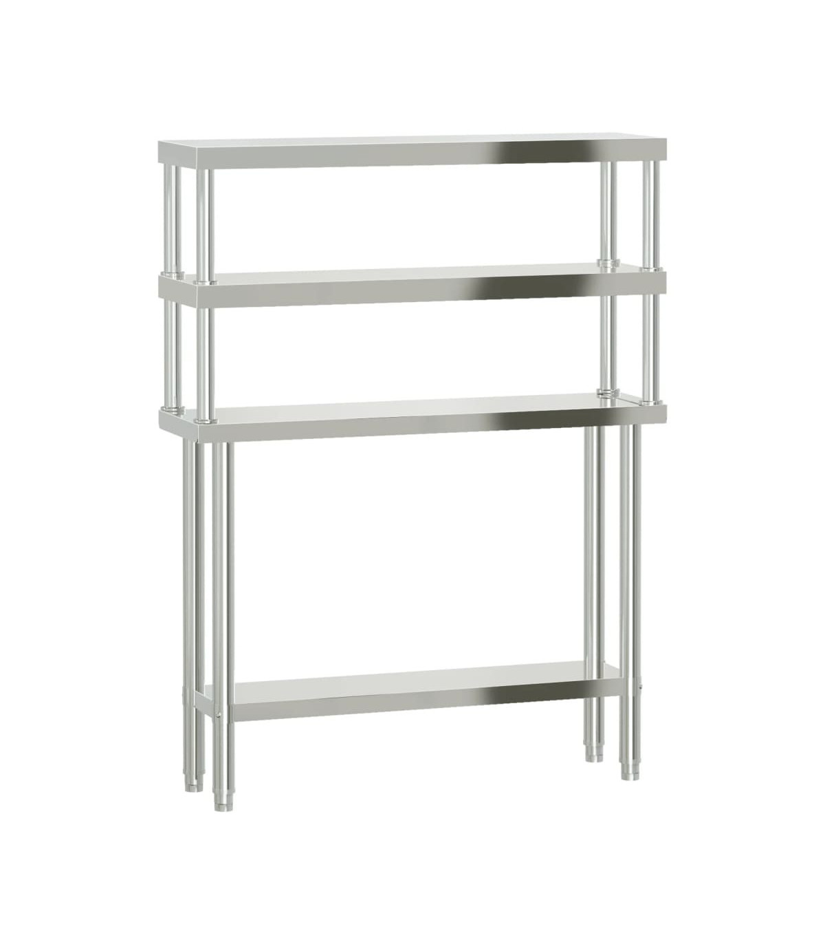This kitchen work table is perfect for food prep and storage and is ideal for a kitchen bar, restaurant, school, as well as other commercial places. Durable and stable construction: The work table is made of stainless steel, providing resistance to corrosion and rust for years of reliable use. The smooth surface is easy to clean and maintain, ensuring a hygienic food preparation area.Ample workplace: The stainless steel prep table is designed with a bottom shelf and a 2-tier overshelf for customised storage space, providing ample storage space for your microwave oven, kitchen utensils, or any other tools you may need.Adjustable feet: The adjustable feet with a non-slip design ensure the kitchen prep table remains stable and will stay put, protecting the floor from damage. Warning:To prevent it from tipping over, this product must be used with the provided wall attachment device.