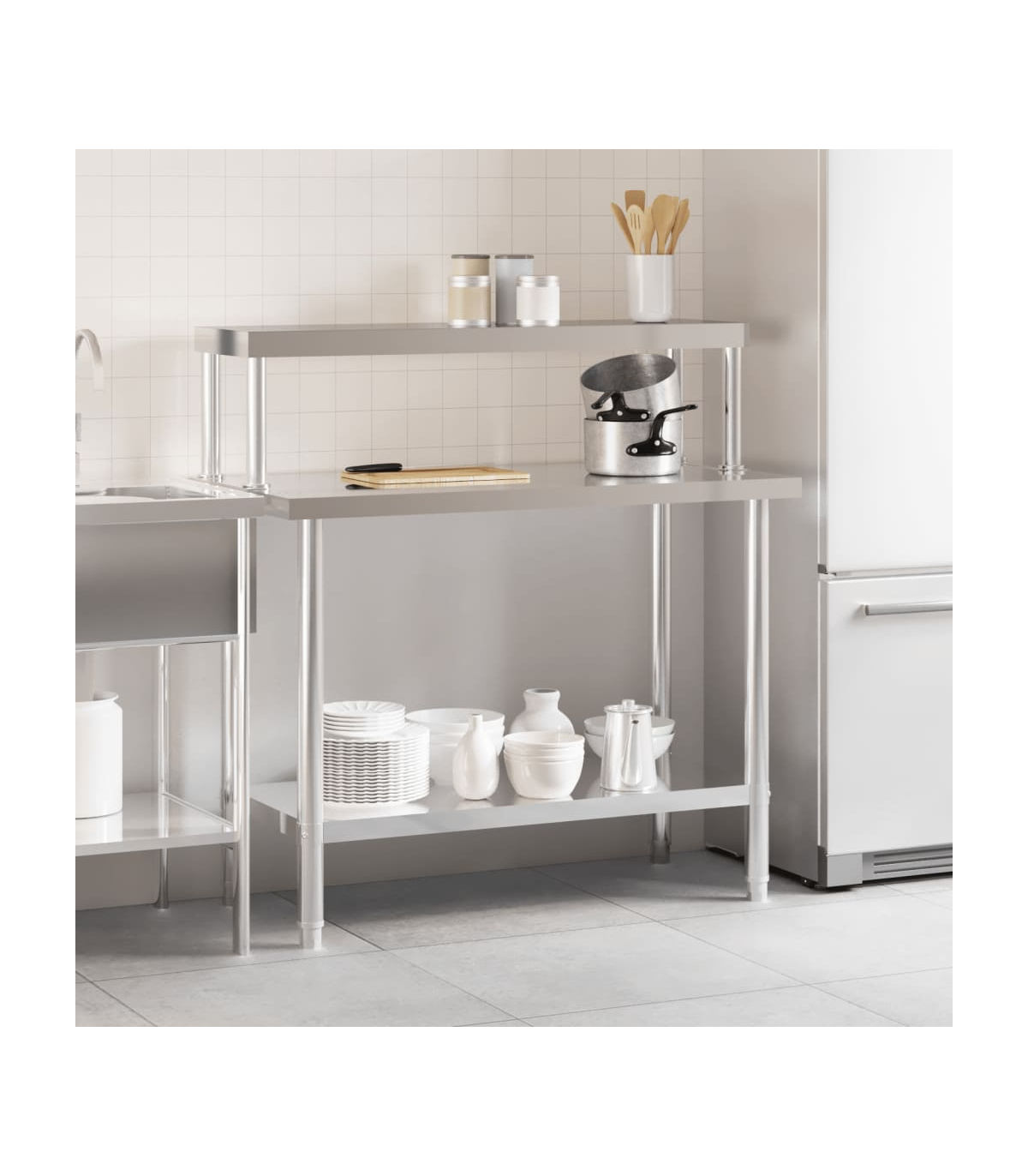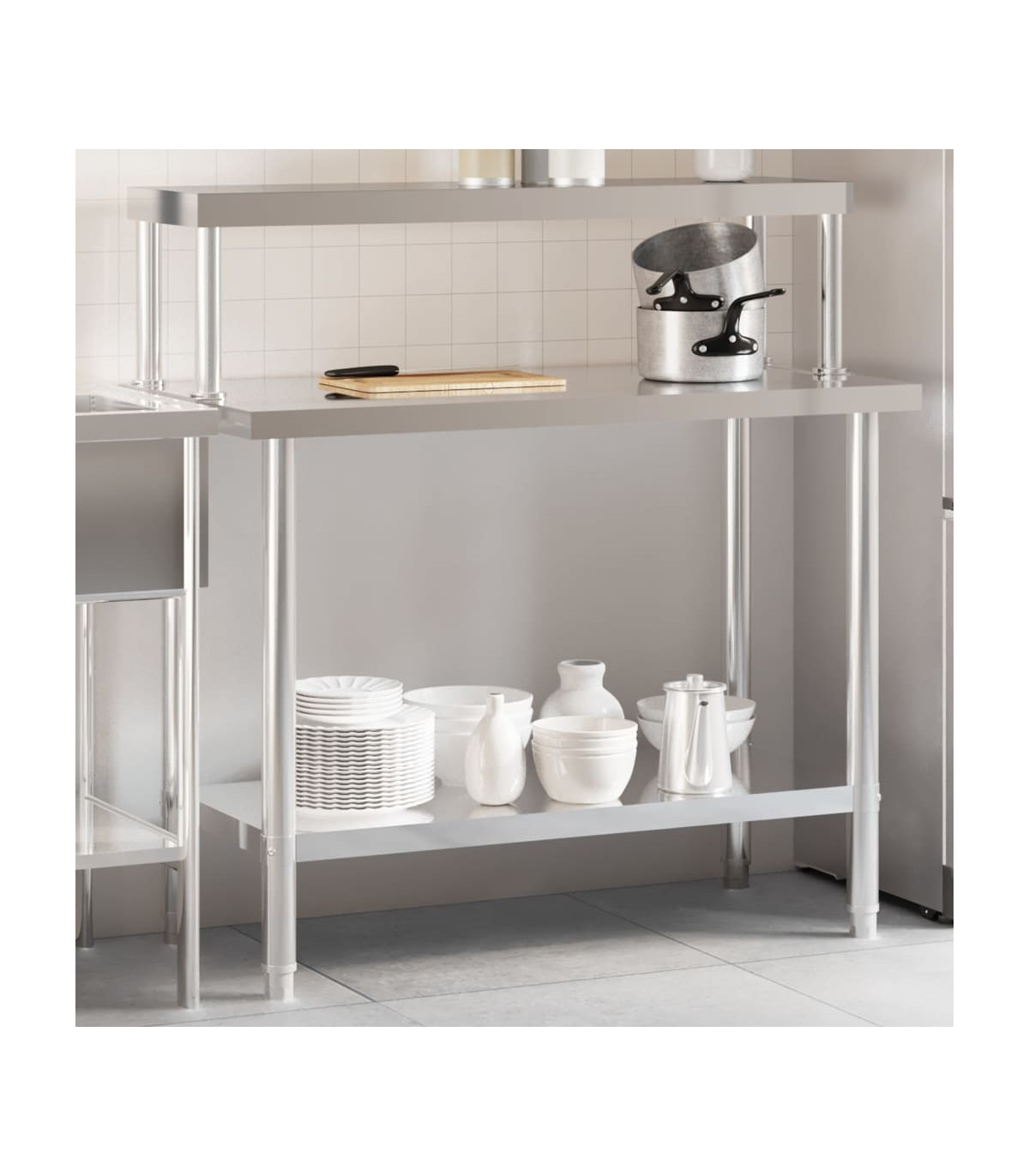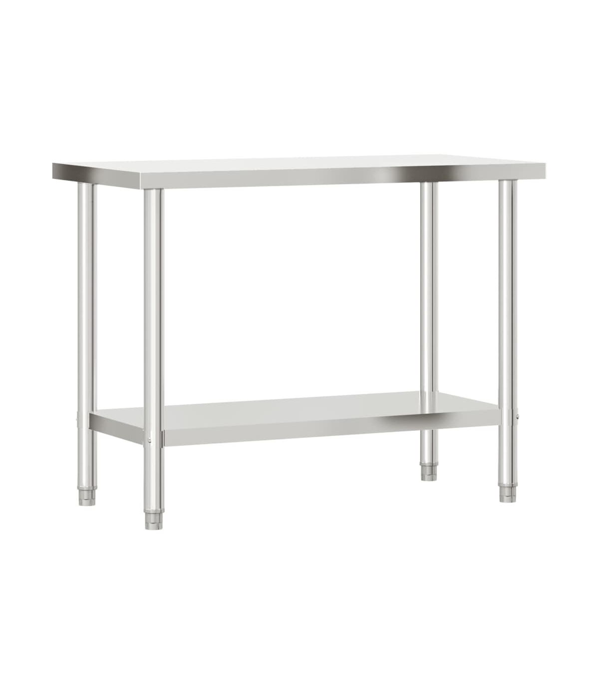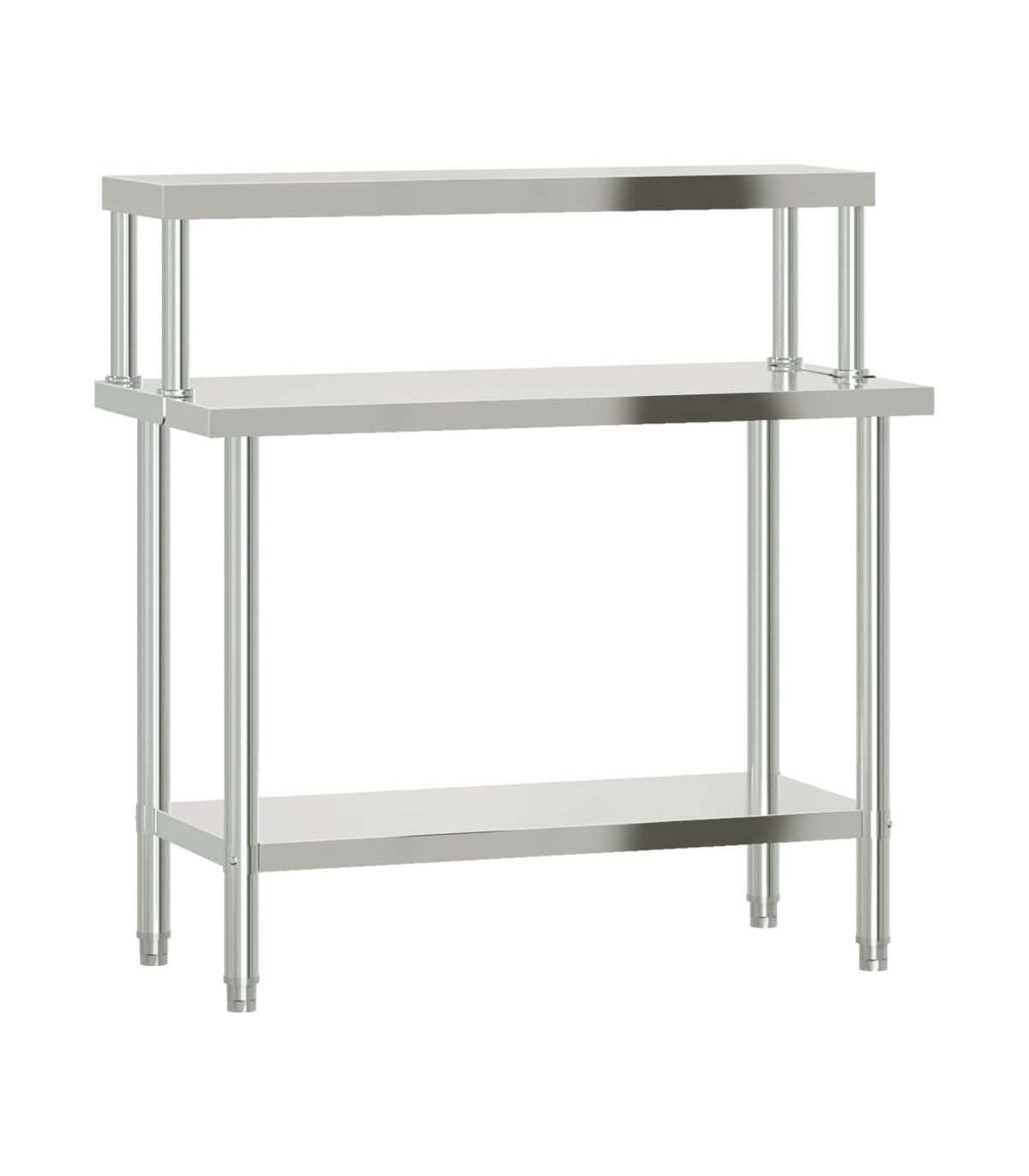 This kitchen work table is perfect for food prep and storage and is ideal for a kitchen bar, restaurant, school, as well as other commercial places. Durable and stable construction: The work table is made of stainless steel, providing resistance to corrosion and rust for years of reliable use. The smooth surface is easy to clean and maintain, ensuring a hygienic food preparation area.Ample workplace: The stainless steel prep table is designed with a bottom shelf and a overshelf for customised storage space, providing ample storage space for your microwave oven, kitchen utensils, or any other tools you may need.Adjustable feet: The adjustable feet with a non-slip design ensure the kitchen prep table remains stable and will stay put, protecting the floor from damage. Warning:To prevent it from tipping over, this product must be used with the provided wall attachment device.