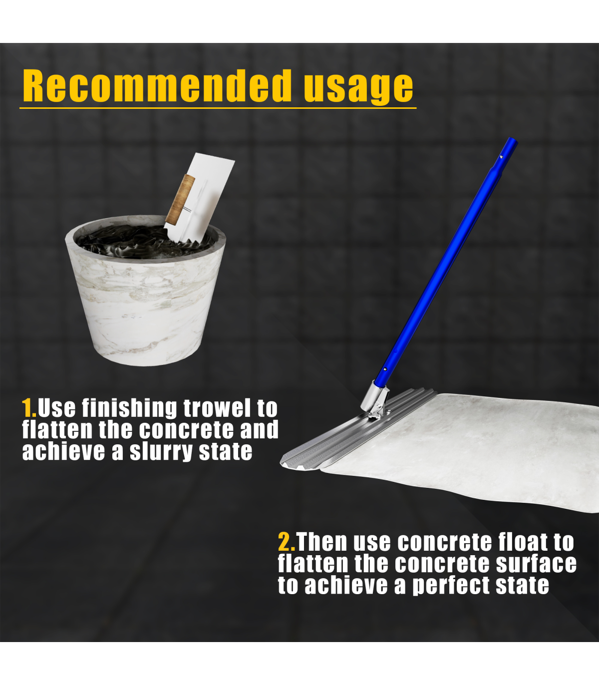 - Excellent Quality-The concrete float’s board uses magnesium aluminum alloy as raw material, and the integrated cutting ensures its integrity. We have passivated some sharp areas to prevent cuts. The special material coating on the surface can resist the corrosive effect of concrete, making its service life longer. And make it easier to clean.