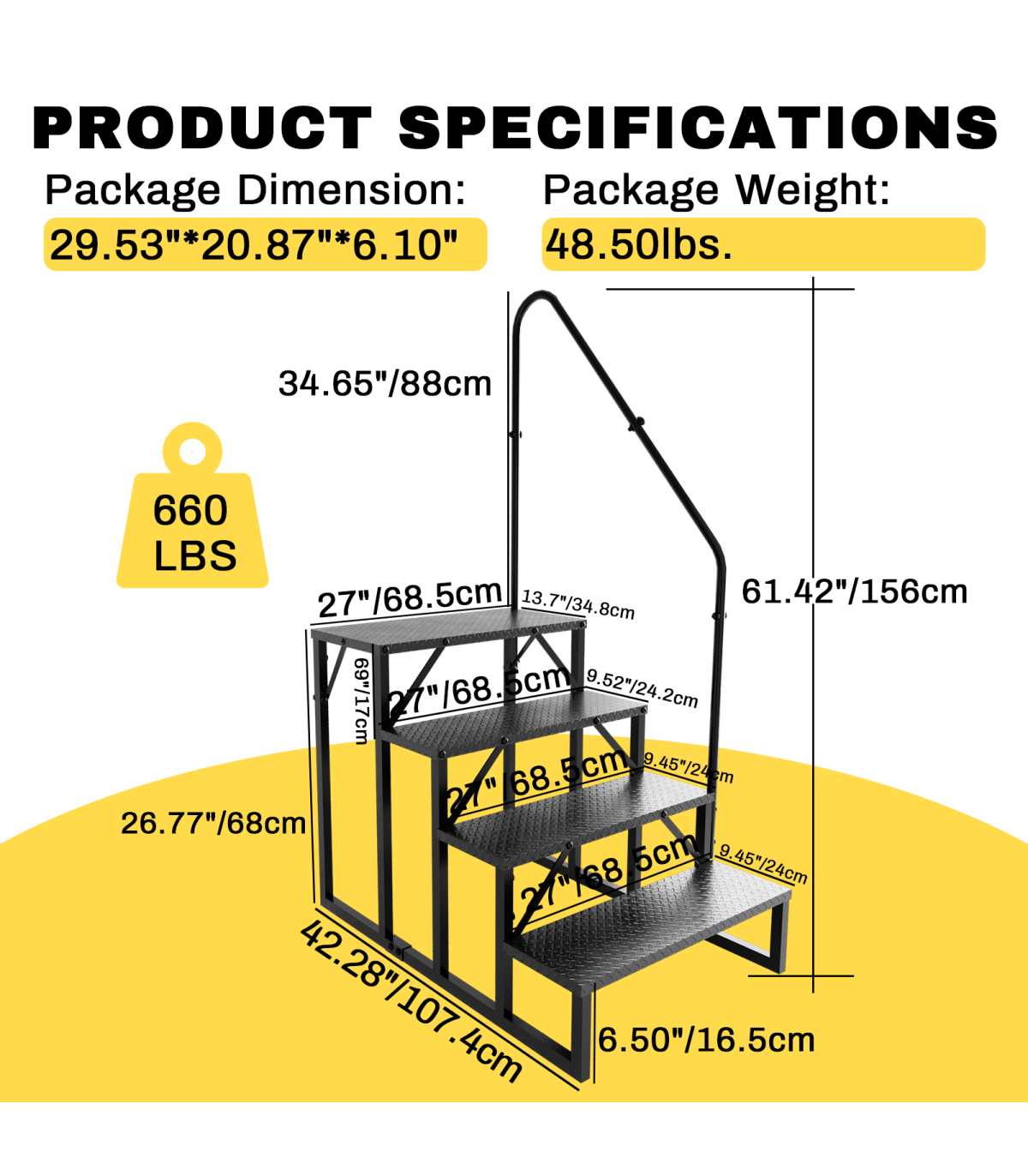 - 【Sturdy Steps】The weight capacity of our portable rv steps is 660 pounds, thus 5th-wheel RV stairs can withstand a lot of weight. Our rv steps with handrail and platform is electrostatically sprayed to enhance corrosion resistance. The triangular bars of heavy-duty metal steps provide better stability and reduce the risk of swings and falls during use