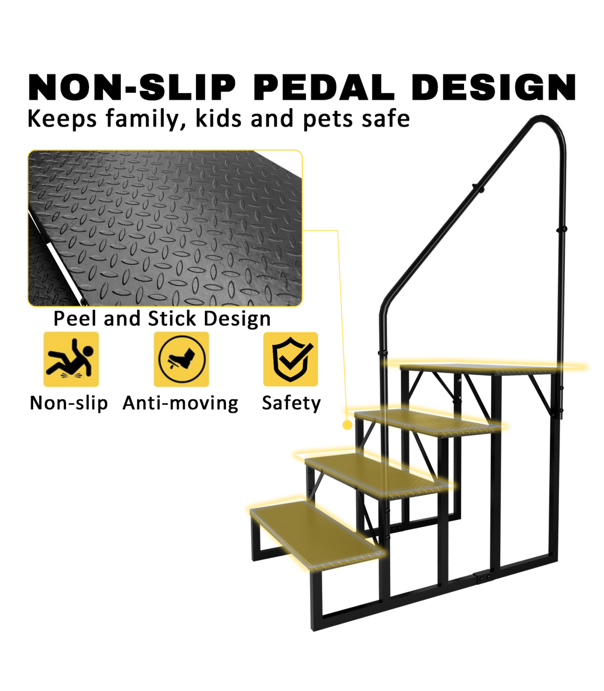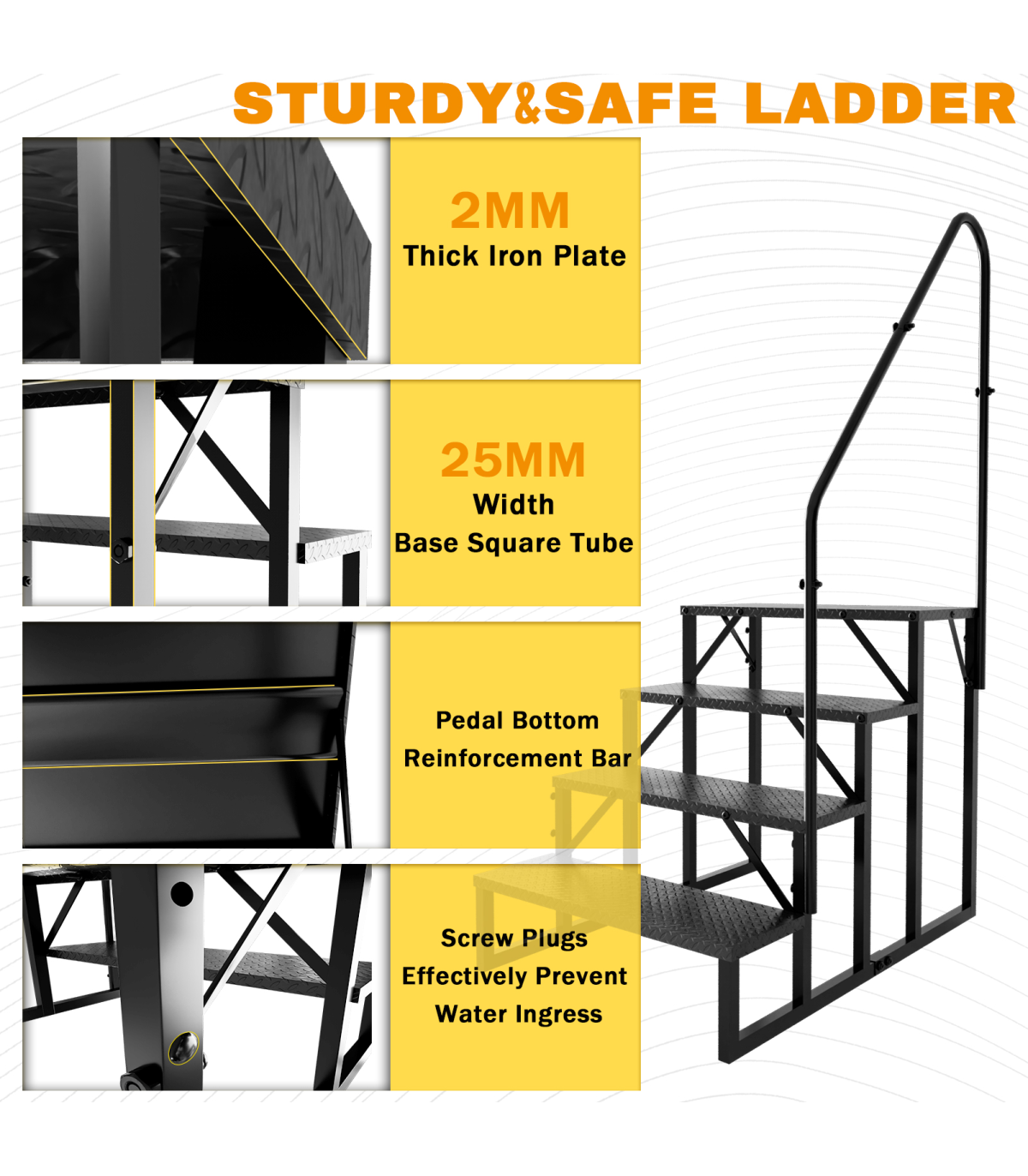 - 【Upgrade RV Step with Handrails】To make the step stool ladder safer, we have upgraded the platform and added extra anti-slip particles. The whole thicken of the rv step is 2mm. You can install the handrail on either side of the rv step stabilizer. RV handrails provide extra support especially for elderly and kids.