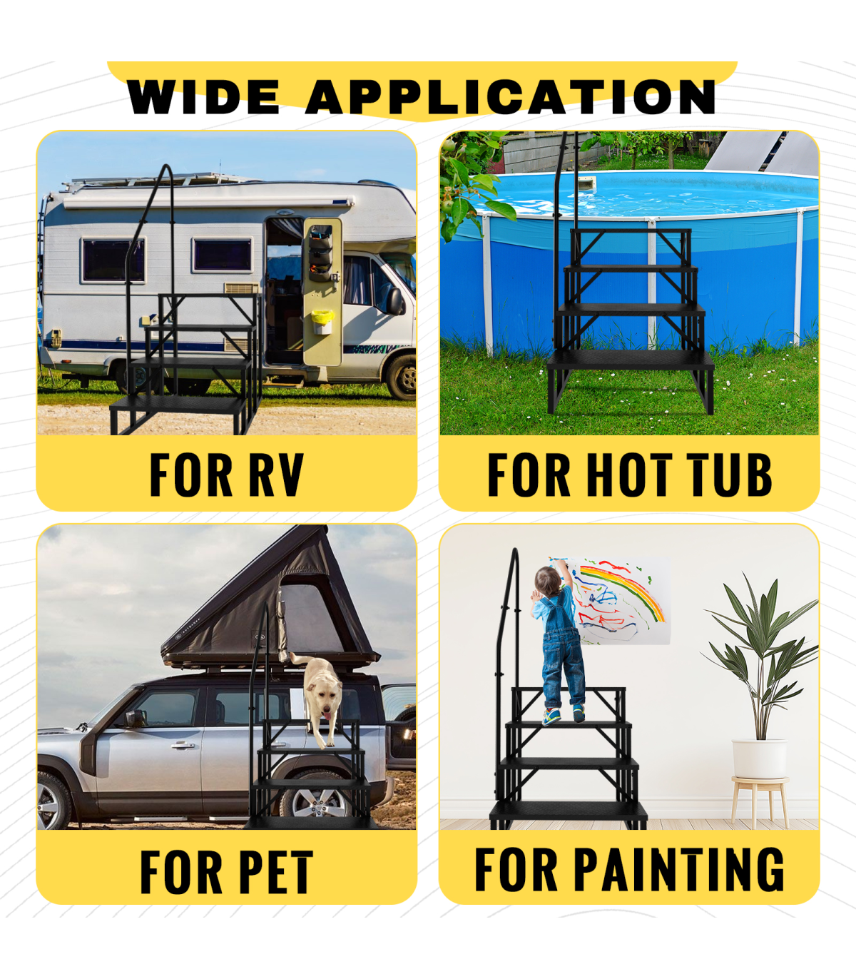 - 【Versatile Outdoor RV Step Stool】 Our 4 step stairs can be used as the threshold of an RV, campervan, or travel trailer step. And our stairs can also be used for RV stairs, mobile home steps, pool steps, hot tub steps, above-ground swimming spa steps, porch steps, bunk bed ladders