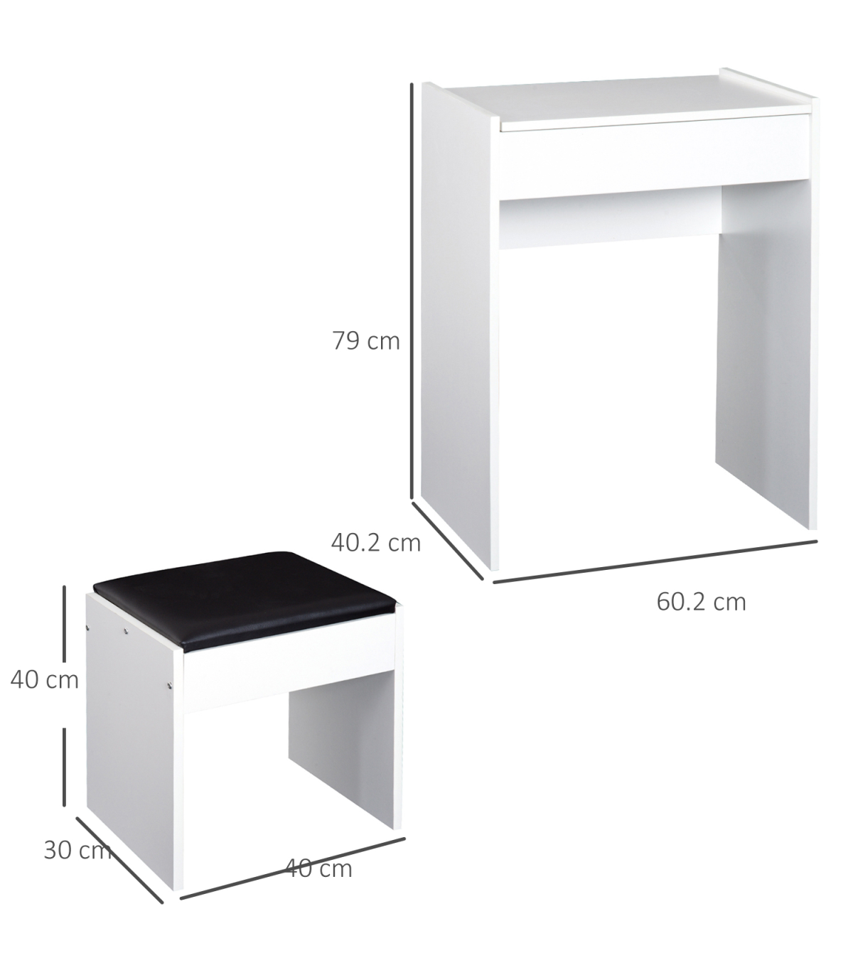 - Flip-up mirror on the lid for convenient making up - Hidden space with removable divider under the lid for ample storage - Easy to convert from a chic dressing table to a writing desk - Padded stool with smooth leather and soft sponge for added comfort This Dressing Table Set in White is a versatile and stylish addition to any bedroom or dressing area. The flip-up mirror on the lid allows for convenient makeup application, while the hidden space with a removable divider provides ample storage for all your beauty essentials. The table can easily convert from a chic dressing table to a functional writing desk, making it a multi-purpose piece of furniture. The padded stool features smooth leather and soft sponge for added comfort during use. Assembly is required for this set. - Dimensions: 306L x 48D x 82H cm - Weight: 47.4 kg - Colour: White