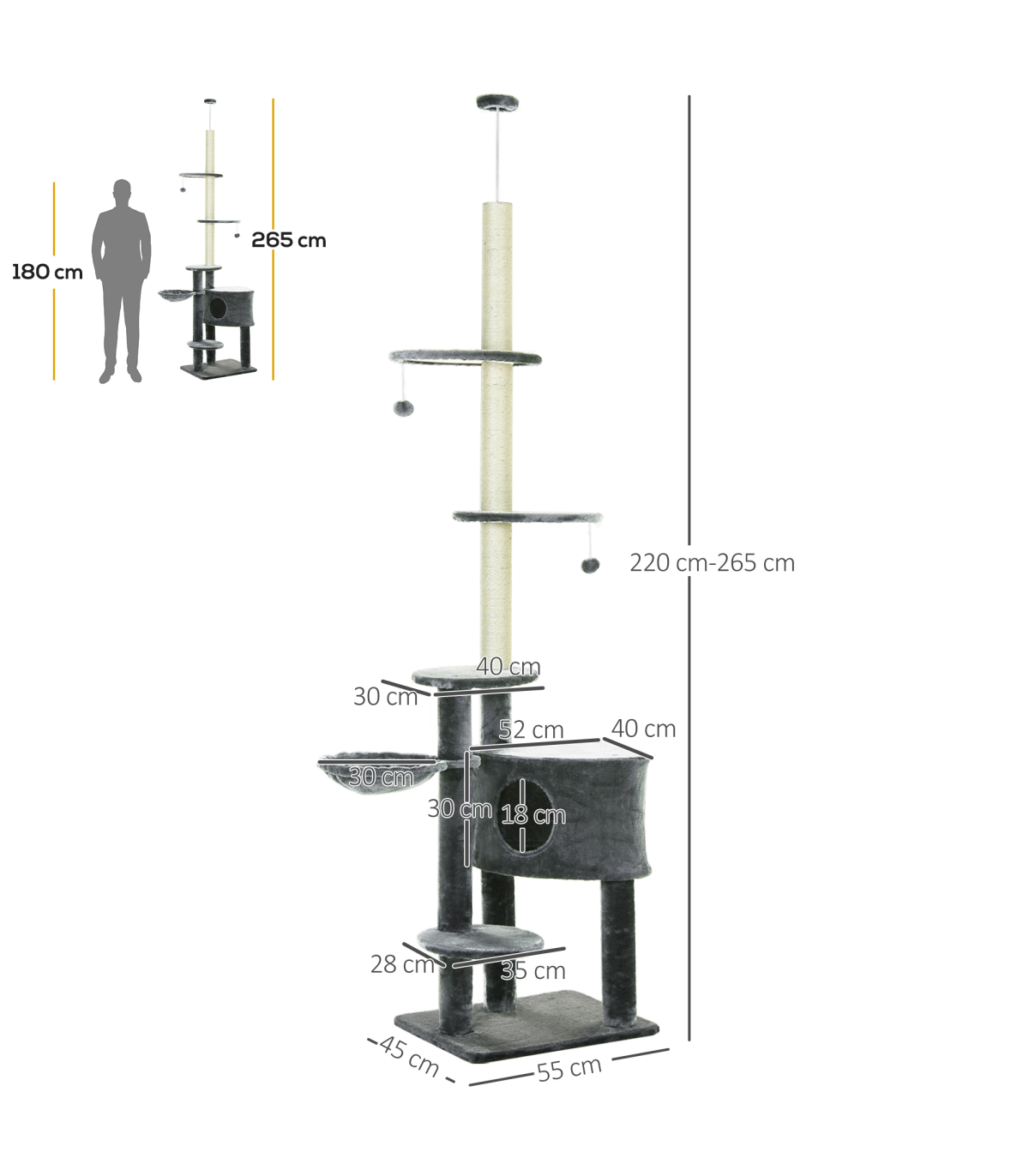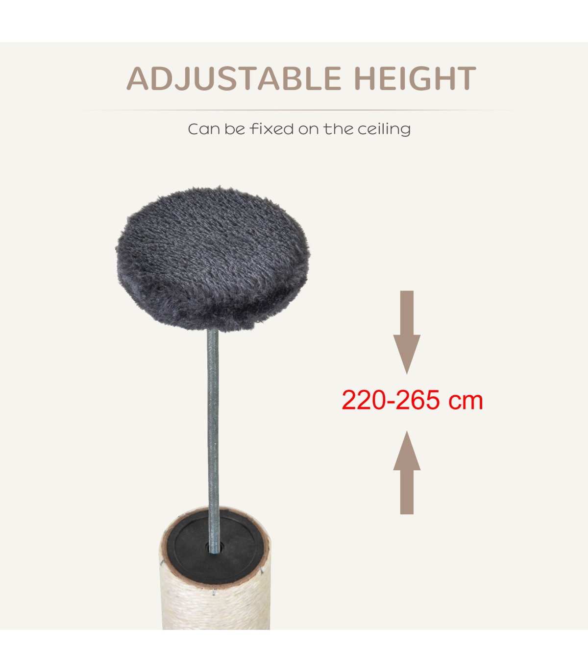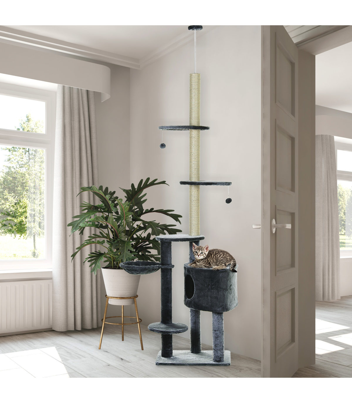 The PawHut cat climbing tower is a 5-tier grey sisal multi-level cat tree tower that provides a paradise for indoor cats to explore and play. With a range in height from 220-265cm, this cat tree can be secured to the ceiling using the included tension rod. It features a condo, a side bed, and several jumping platforms for cats to have endless fun.