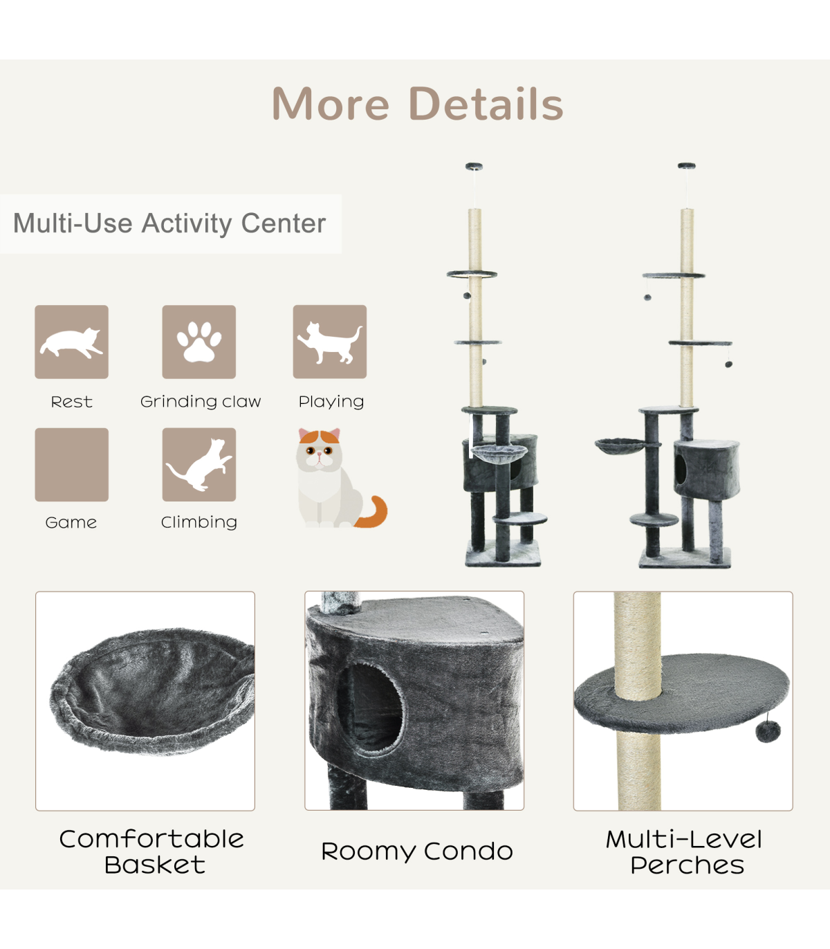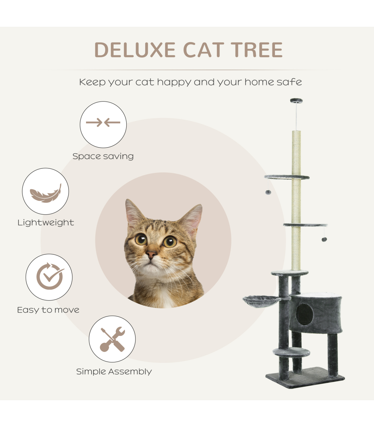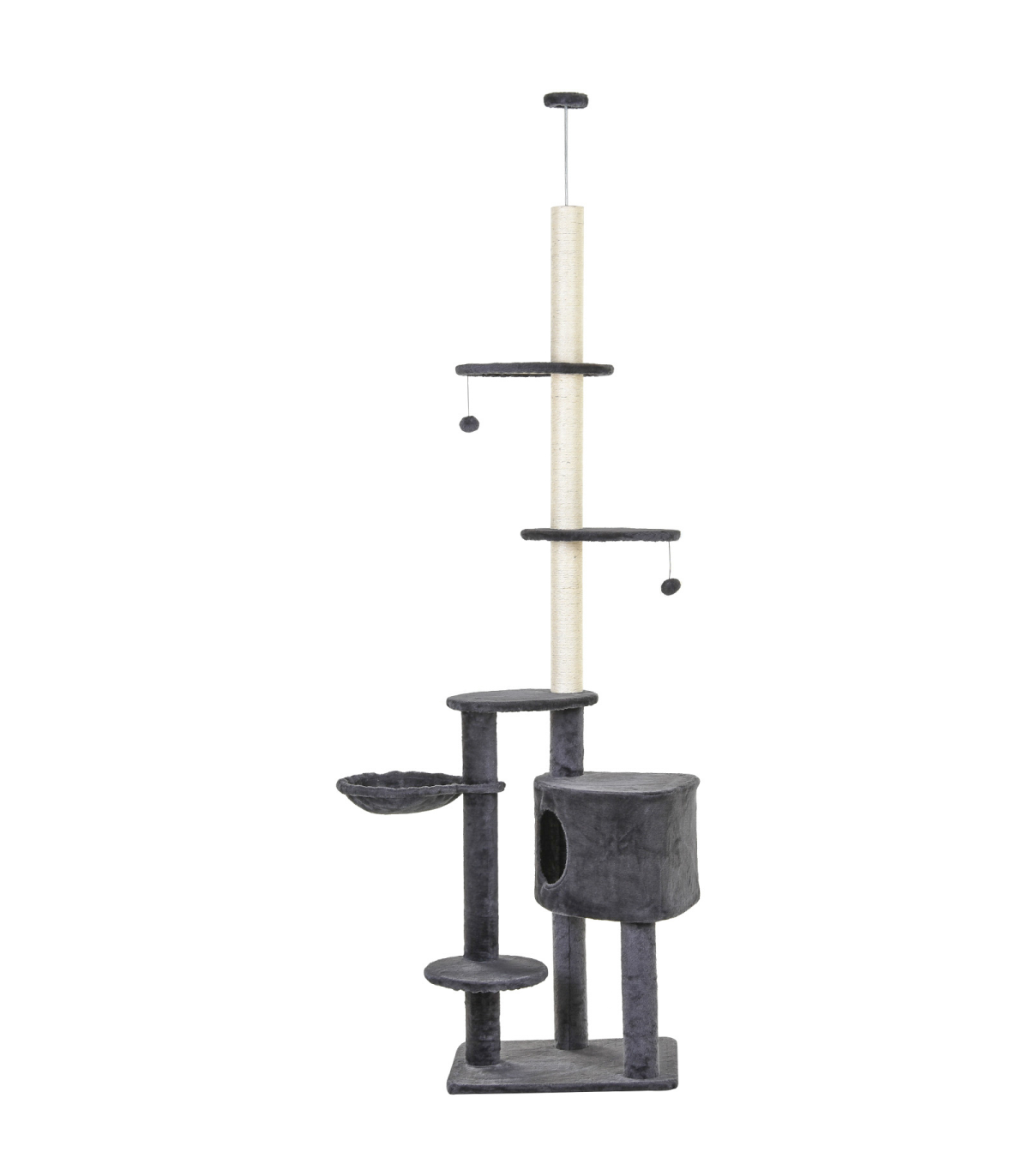 The PawHut cat climbing tower is a 5-tier grey sisal multi-level cat tree tower that provides a paradise for indoor cats to explore and play. With a range in height from 220-265cm, this cat tree can be secured to the ceiling using the included tension rod. It features a condo, a side bed, and several jumping platforms for cats to have endless fun.