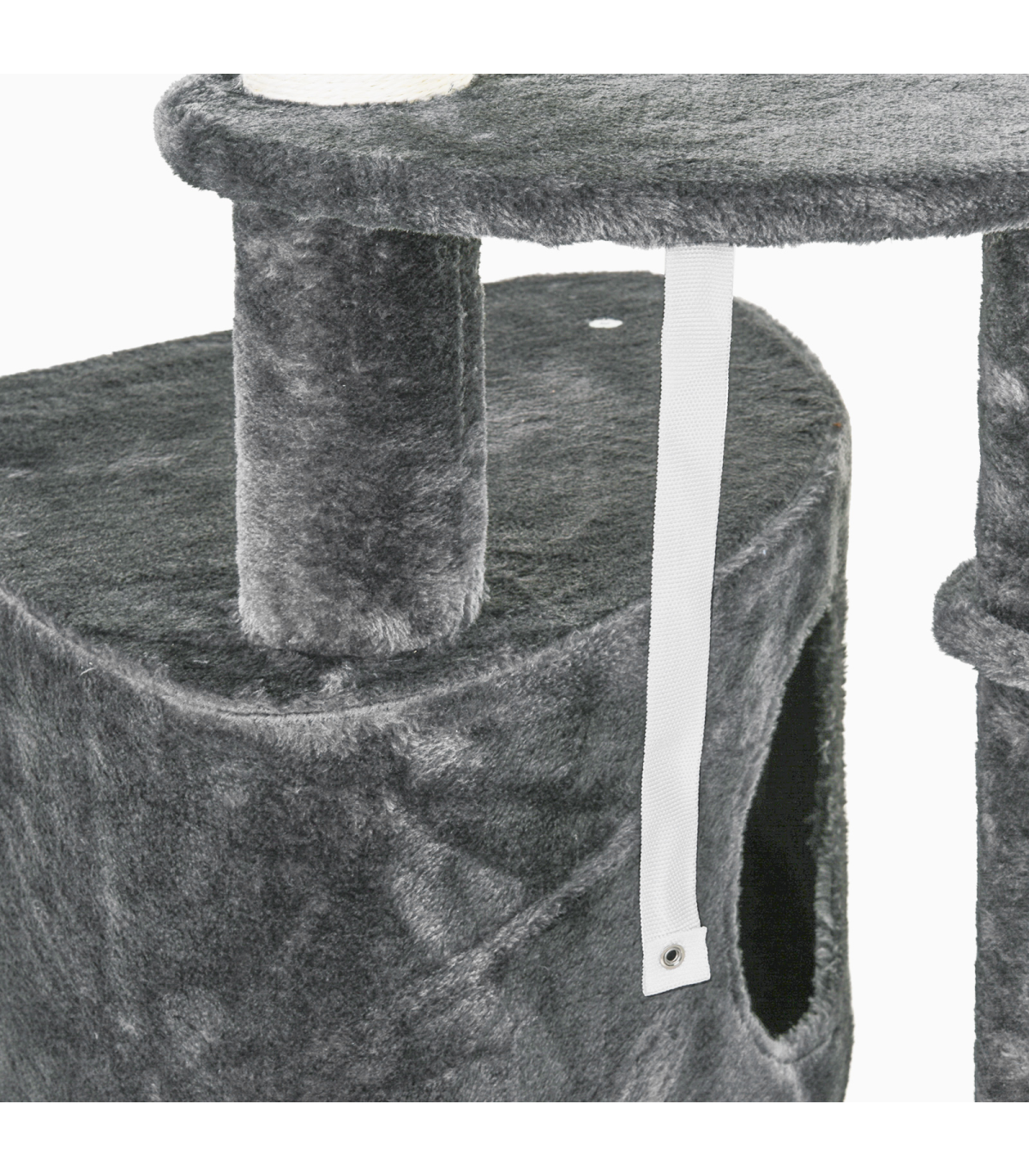 The sisal scratching post helps encourage positive scratching behavior and protects furniture from damage. The sturdy particle board construction can accommodate 2-3 cats within 4.5kg, and the anti-toppling device ensures extra stability. The soft 400gsm short plush covering offers a warm and comfortable touch for your feline friends while they sleep or play.