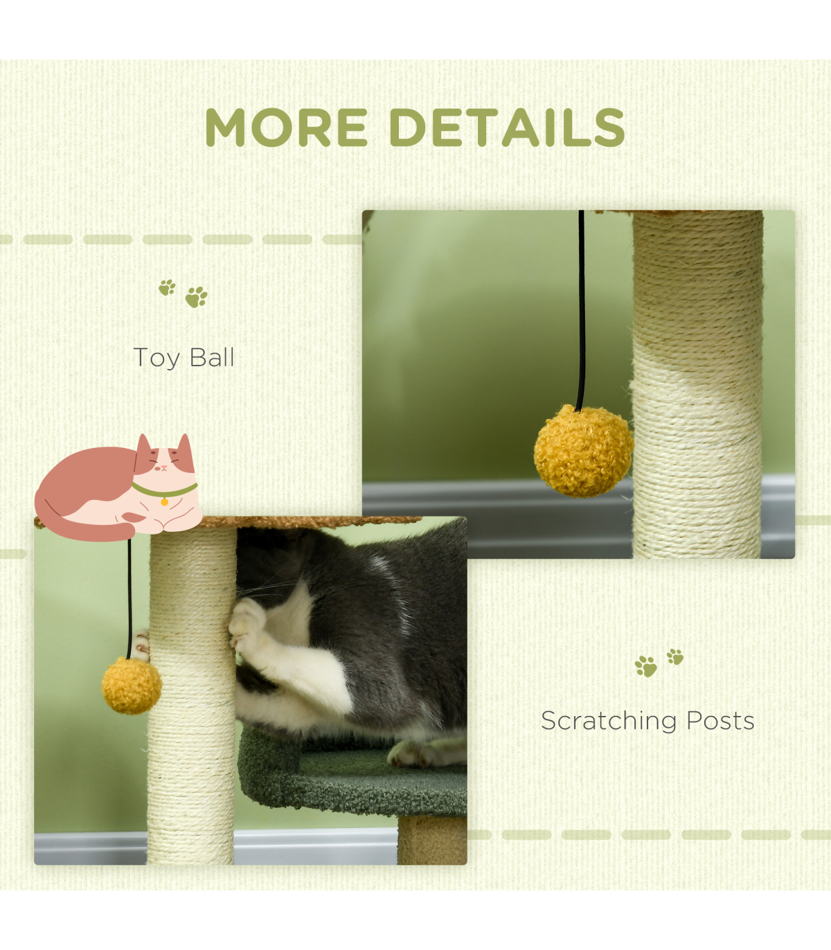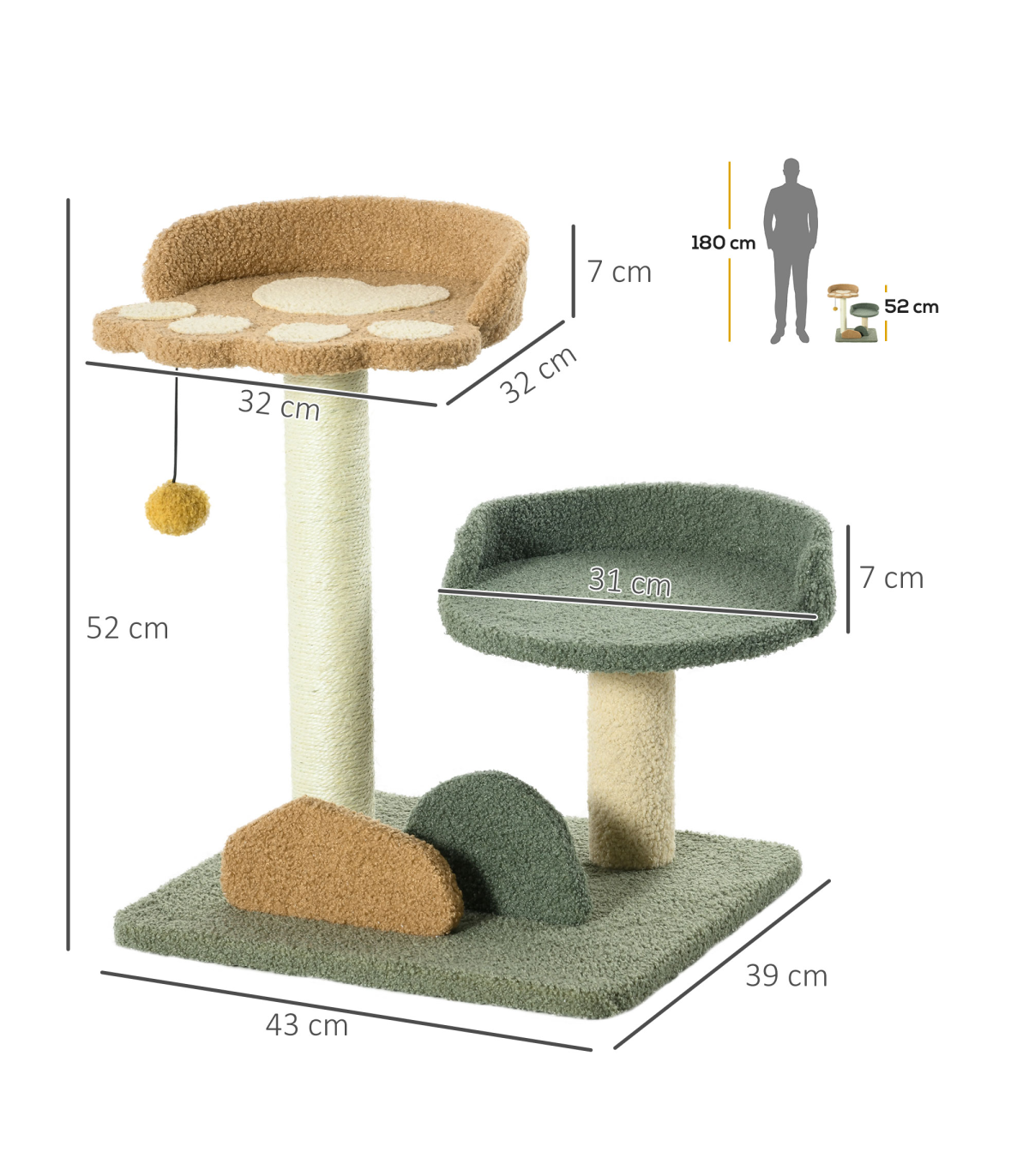 - Colour: Green, Brown, Beige - Material: Particle board, Velvet (100% Polyester), Sisal - Overall Dimensions: 43W x 39D x 52Hcm - Bed Dimensions: 32W x 32D x 7Hcm/ Dia31 x 7Hcm - Interior Dimensions: 31W x 31D x 6Hcm/ Dia30 x 6Hcm - Post Size: Dia6.5cm - Base Size: 43W x 39Dcm - Item Label: D30-732V00MX This 52cm Cat Tree is perfect for indoor cats, providing them with a cozy space to relax and play. The tree features scratching posts, two comfortable beds, and a toy ball for added entertainment. The combination of particle board, velvet, and sisal ensures durability and comfort for your feline friend. Dimensions: - Height: 52cm - Width: 43cm - Depth: 39cm - Weight: 20.00 kg - Colour: Green, Brown, Beige - Made in China
