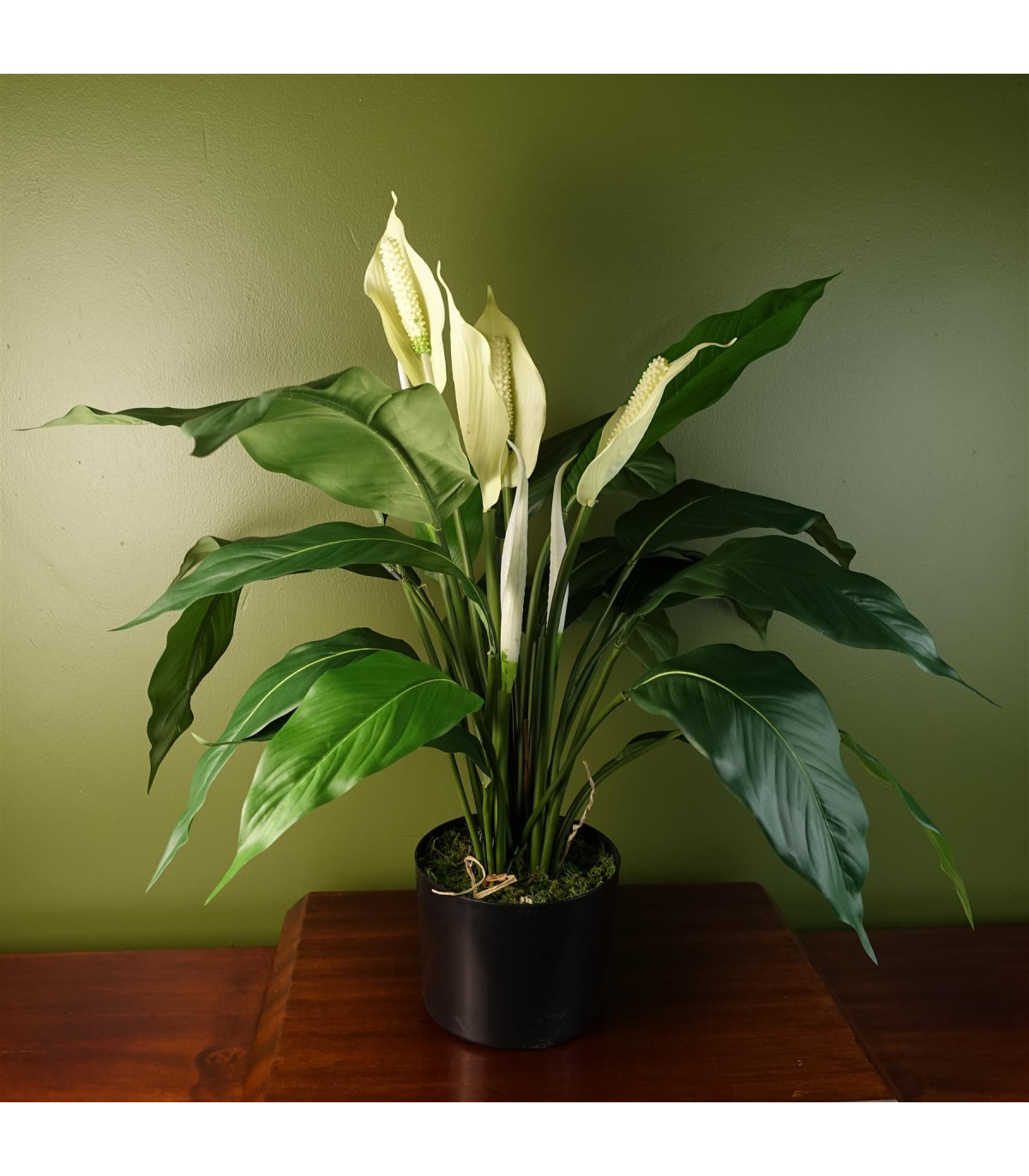 This Artificial Peace Lily White Spathiphyllum features silk leaves and petals with plastic stems that are wired for easy arrangement. The realistic replica is designed for indoor use due to its delicate flowers. It comes in a weighted plastic pot measuring approximately 14cm (d) x 12cm (h). The overall height of the plant, including the pot, is 60cm when measured from the floor. The width and depth of the plant are both 60cm as shown in the photos.