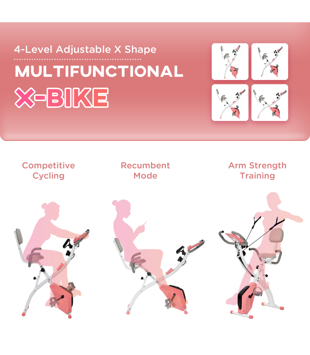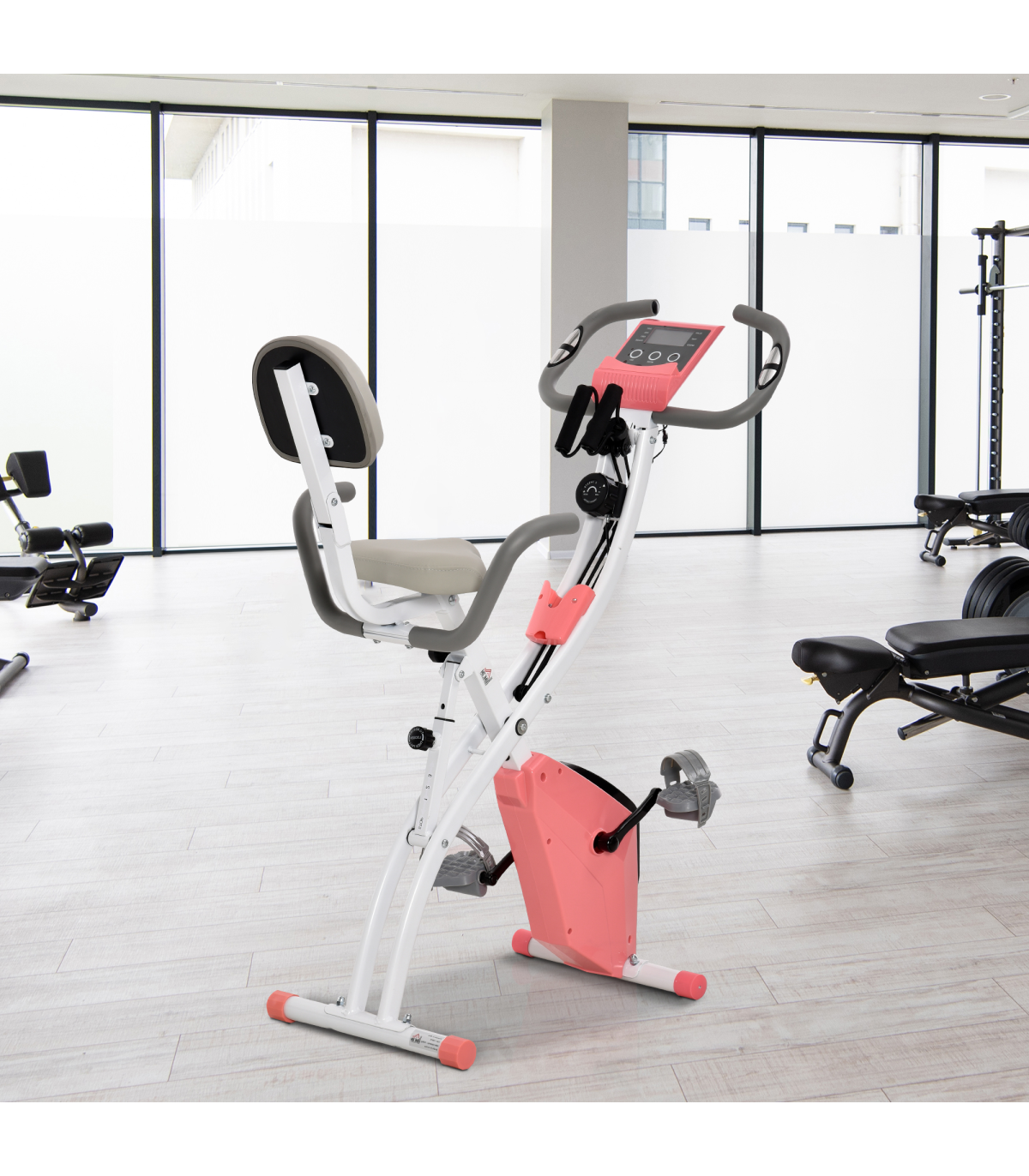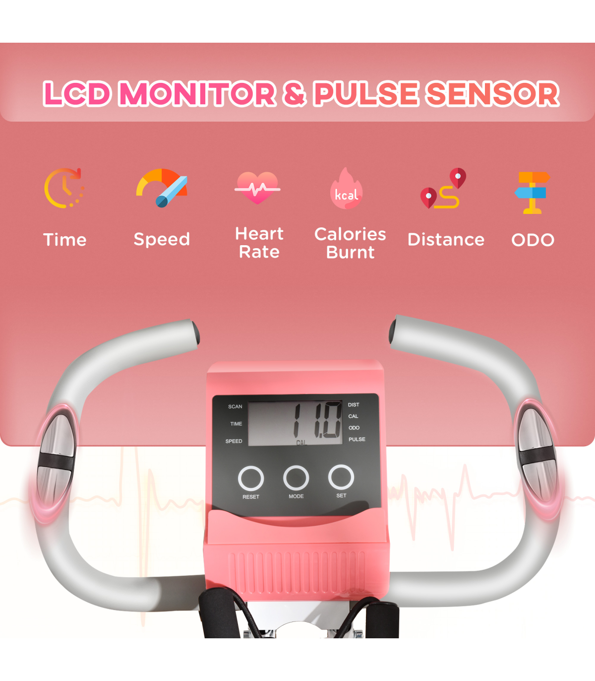 Get a complete cardio workout in the comfort of your own home with an indoor resistance adjustable exercise bike from HOMCOM. With the exercise bike with an LCD that tracks time, speed, distance, heart rate, and calories burned you can monitor your progress while you work out. Come with a phone holder, you can watch your favorite shows during exercise. It can be used as an upright exercise bike, a recumbent bike, and a tension rope to help improve upper body strength.