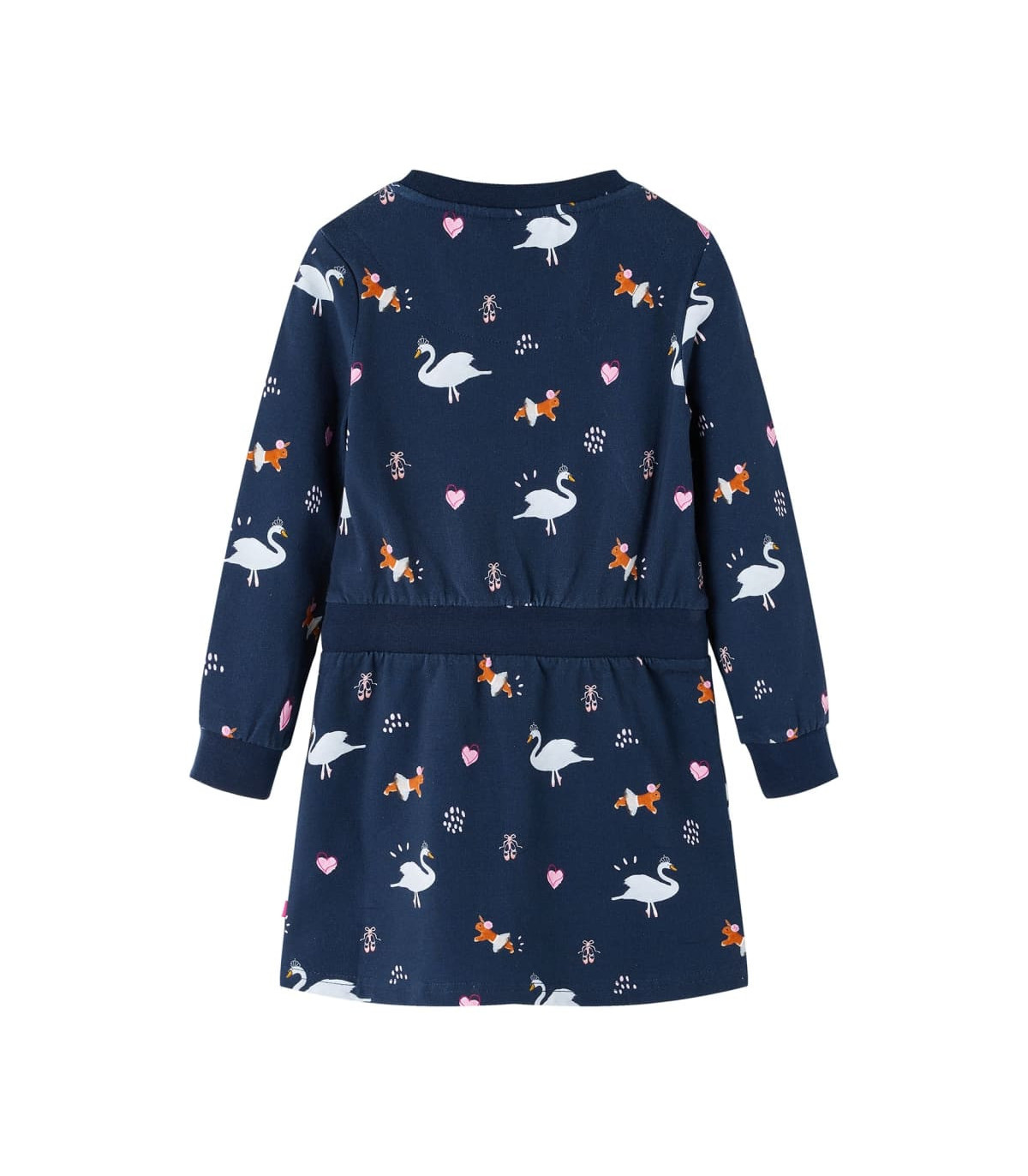 Our children's clothing line is all about affordable, high-quality, and durable everyday wear for kids aged 1.5 to 10. Our range includes jackets, sweaters, shirts, and many more, with a variety in style, size, and colour. Following the high-quality standard in the market, we are using high-grade materials and advanced manufacturing techniques. This kids' dress has long sleeves, a round neckline, and a drawstring waistband. This navy children's dress is printed with swans all over and has ribbed cuffs and a neckline. The kids' short dress is made from soft material that includes cotton, and elastane for comfort and breathability. Good to know: This size chart in the picture provides measurements for kids aged 1.5 to 10, covering the height, chest, waist, and hip. You can easily find the right fit for your child.