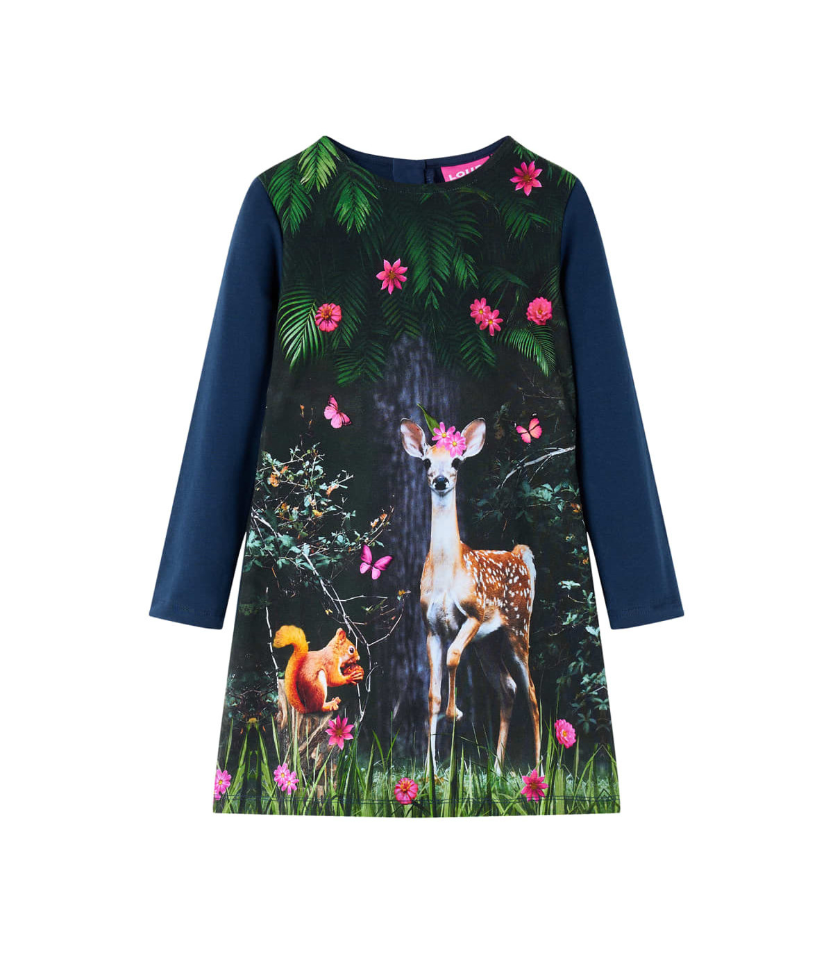 Our children's clothing line is all about affordable, high-quality, and durable everyday wear for kids aged 1.5 to 10. Our range includes jackets, sweaters, shirts, and many more, with a variety in style, size, and colour. Following the high-quality standard in the market, we are using high-grade materials and advanced manufacturing techniques. This kids' dress has long sleeves, a round neckline, and closes with a zipper at the back. This navy children's dress features a lovely deer print. The kids' short dress is made from soft material that includes cotton, and elastane for comfort and breathability. Good to know: This size chart in the picture provides measurements for kids aged 1.5 to 10, covering the height, chest, waist, and hip. You can easily find the right fit for your child.