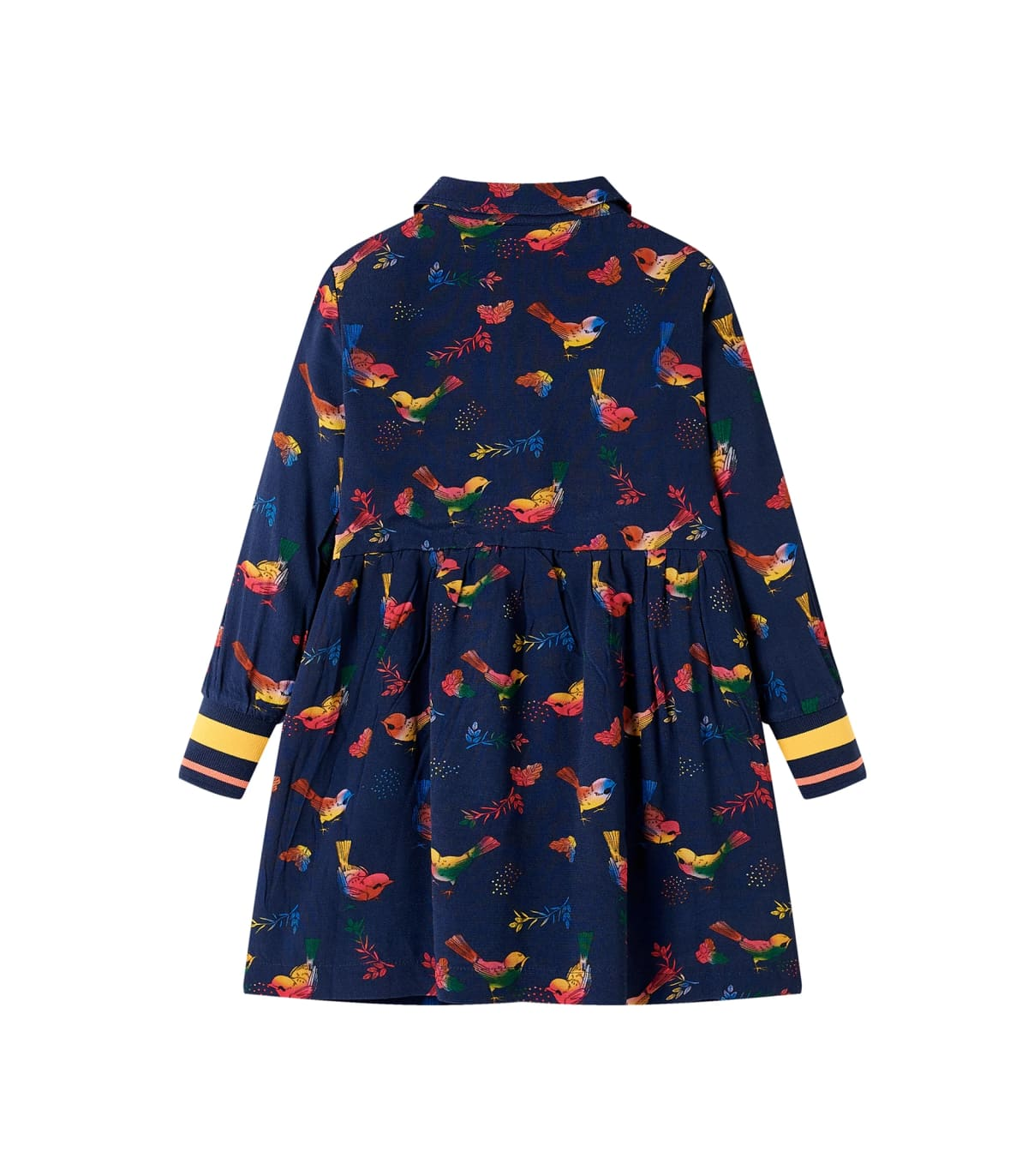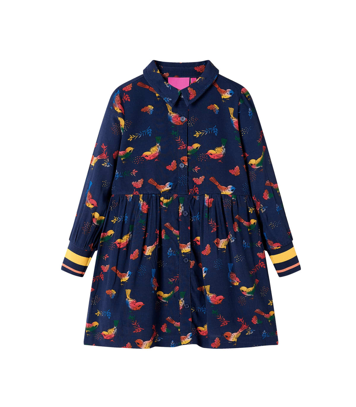 Our children's clothing line is all about affordable, high-quality, and durable everyday wear for kids aged 1.5 to 10. Our range includes jackets, sweaters, shirts, and many more, with a variety in style, size, and colour. Following the high-quality standard in the market, we are using high-grade materials and advanced manufacturing techniques. This kids' dress has long sleeves, a turn-down collar, and closes with front buttons. The children's dress is printed with colourful birds all over. This collared dress is made from soft material that includes viscose and polyester for comfort and breathability. Good to know: The size chart in the picture provides measurements for kids aged 1.5 to 10, covering the height, chest, waist, and hip. You can easily find the right fit for your child.