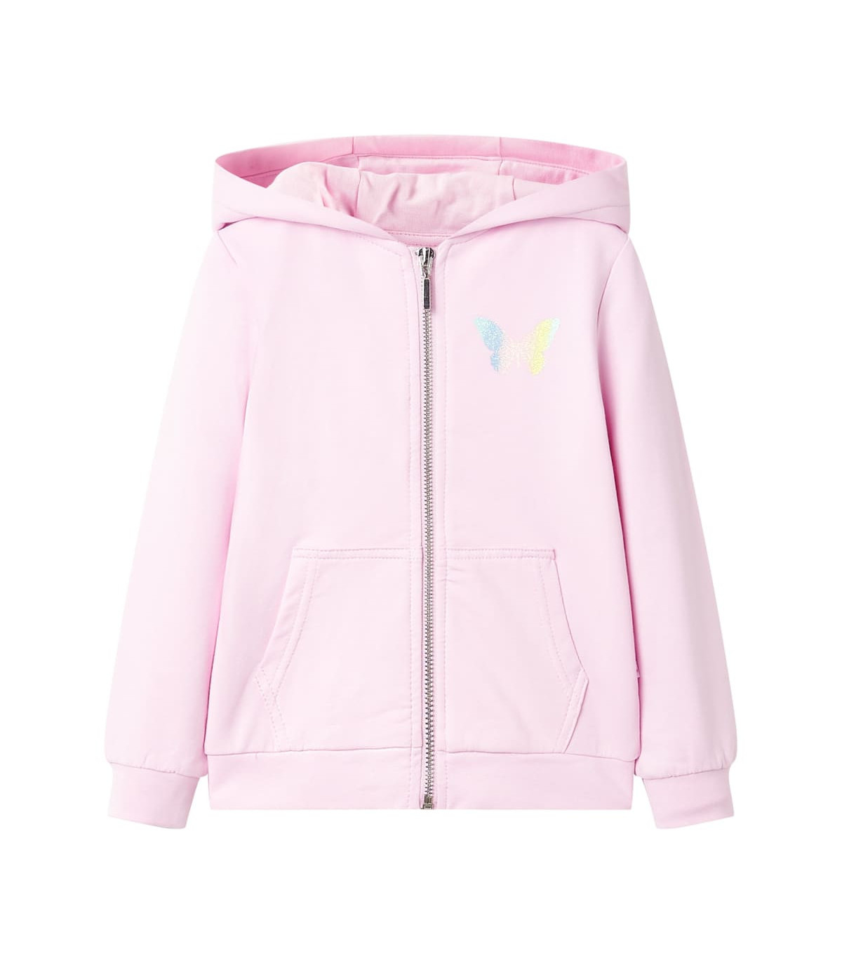 Our children's clothing line is all about affordable, high-quality, and durable everyday wear for kids aged 1.5 to 10. Our range includes jackets, sweaters, shirts, and many more, with a variety in style, size, and colour. Following the high-quality standard in the market, we are using high-grade materials and advanced manufacturing techniques. This kids' hooded sweatshirt has long sleeves, two front pockets, and closes with a zip. The kids' hoodie features a multicoloured butterfly. The children's hooded sweatshirt is made from soft material that includes 95% cotton and 5% elastane for comfort and breathability. Good to know: This size chart in the picture provides measurements for kids aged 1.5 to 10, covering the height, chest, waist, and hip. You can easily find the right fit for your child.