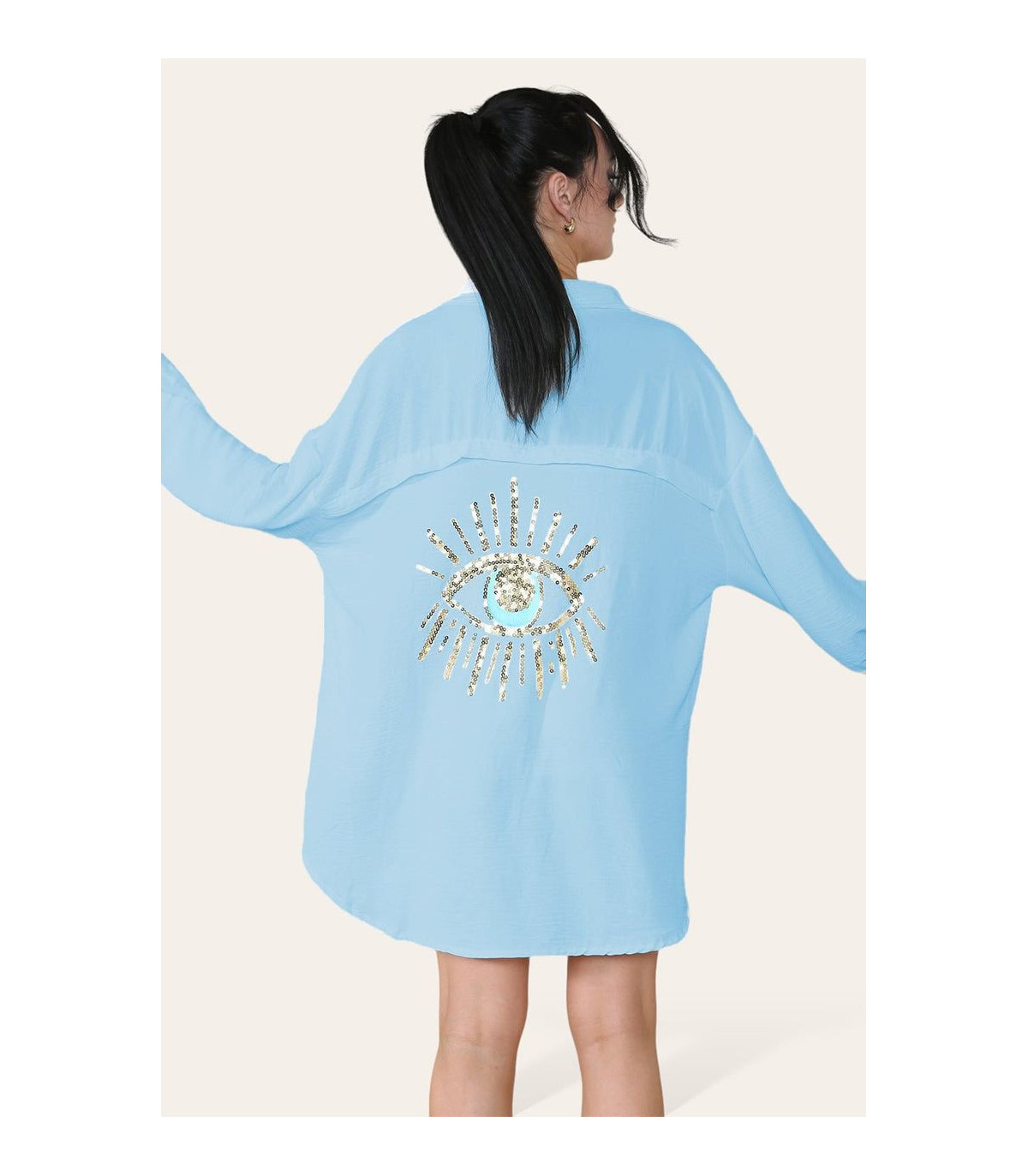 Oversized Long Sleeve Gold Sequin Eye Button Up Shirt