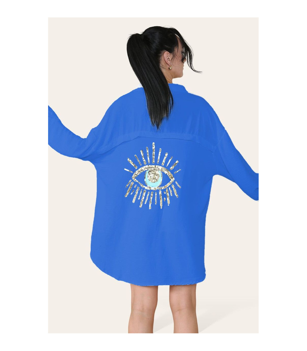 Oversized Long Sleeve Gold Sequin Eye Button Up Shirt