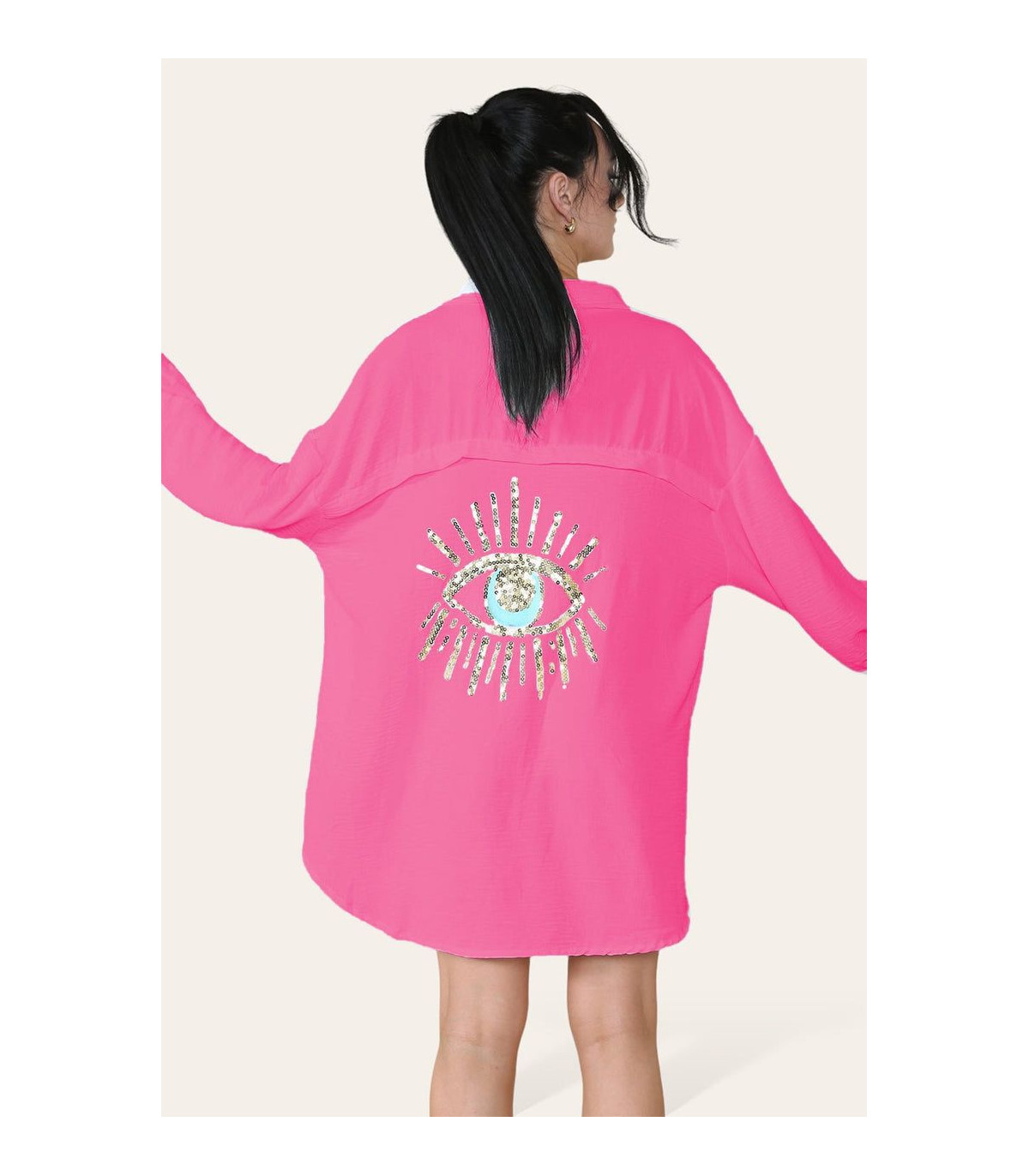 Oversized Long Sleeve Gold Sequin Eye Button Up Shirt