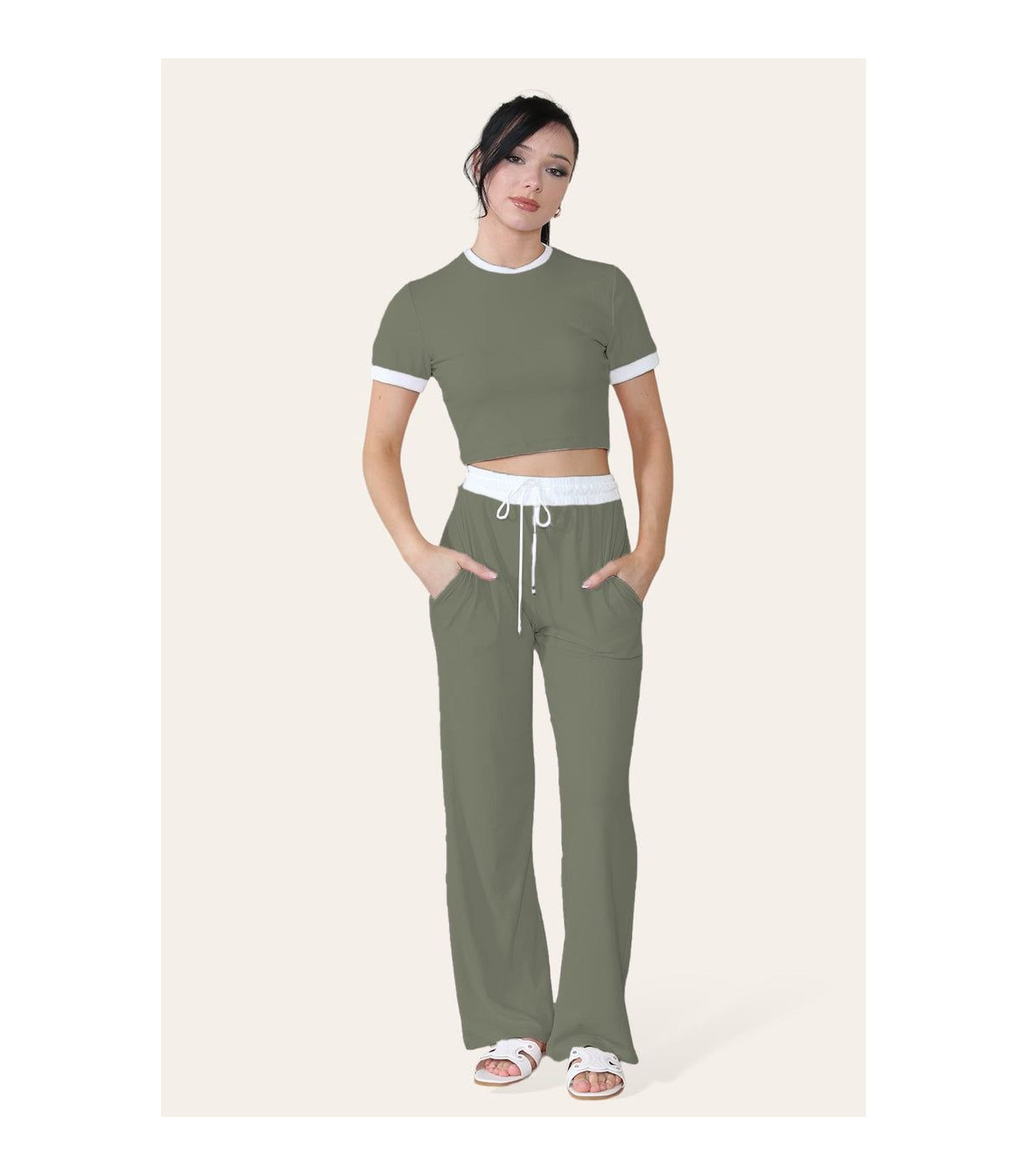Ribbed Contrast Wide Leg Flared Trousers And Top Loungewear TRS Cropped Set